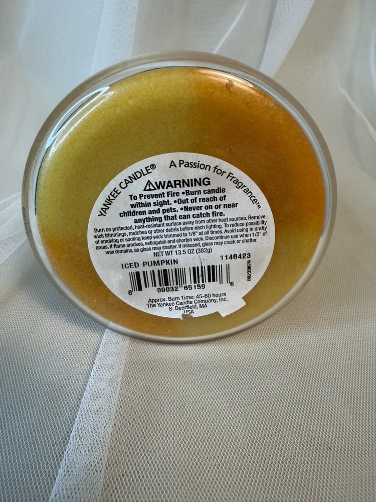 Experience the warm and welcoming aroma of Yankee Candle's Iced Pumpkin 12 oz Swirl Candle. The scent combines the creamy richness of buttercream with the sweet and spicy notes of pumpkin, creating a perfect autumn fragrance. The round jar candle is made of wax and features a yellow and orange color scheme. This jar candle is a perfect addition to any home decor and is ideal for those who love food-scented candles. The candle is from the Yankee Candle brand and is a type of jar candle. The scent is Super Sweet Pumpkin, and it will surely make your home smell amazing. (See pictures has been burned once.)