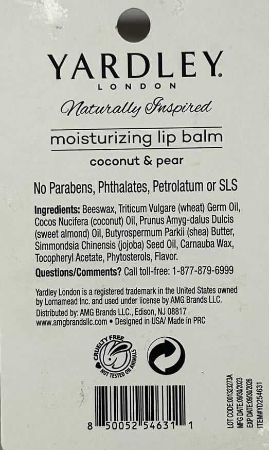 Yardley London 3 Pack Lot Moisturizing Lip Balm Coconut & Pear Paraben Free Please see the pictures for the ingredients of the item No Parabens, Phthalates, Petrolatum or SLS Two lip balms in each pack for a total of 6 LOT CODE:001323273A MFG DATE:09/30/2023 EXP DATE:09/30/2026 ITEM#YD254631