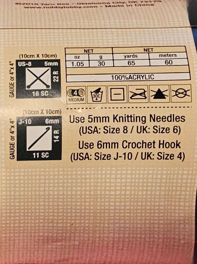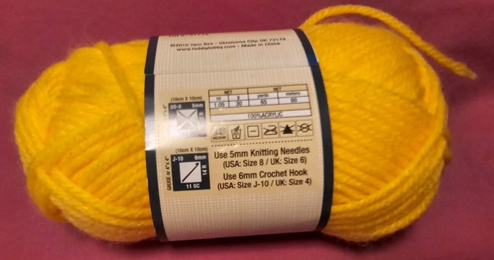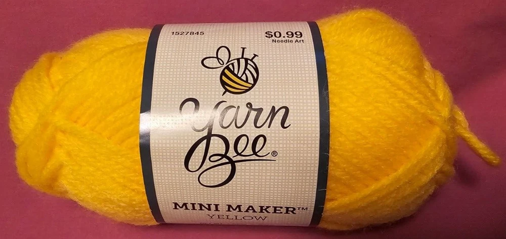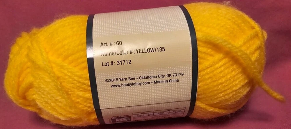 Fiber Content: Acrylic UPC: n/a Suitable For: Accessories - Hats, Accessories - Scarves, Bedding, Blankets/Throws, Crafts, Crochet Unit of Sale: Unit Type: worsted Shape: Skein gtin13: n/a Style: Worsted Color: Yellow Country/Region of Manufacture: China Weight: 4 - Medium/Worsted Brand: Yarn Bee Product Line: Mini Maker