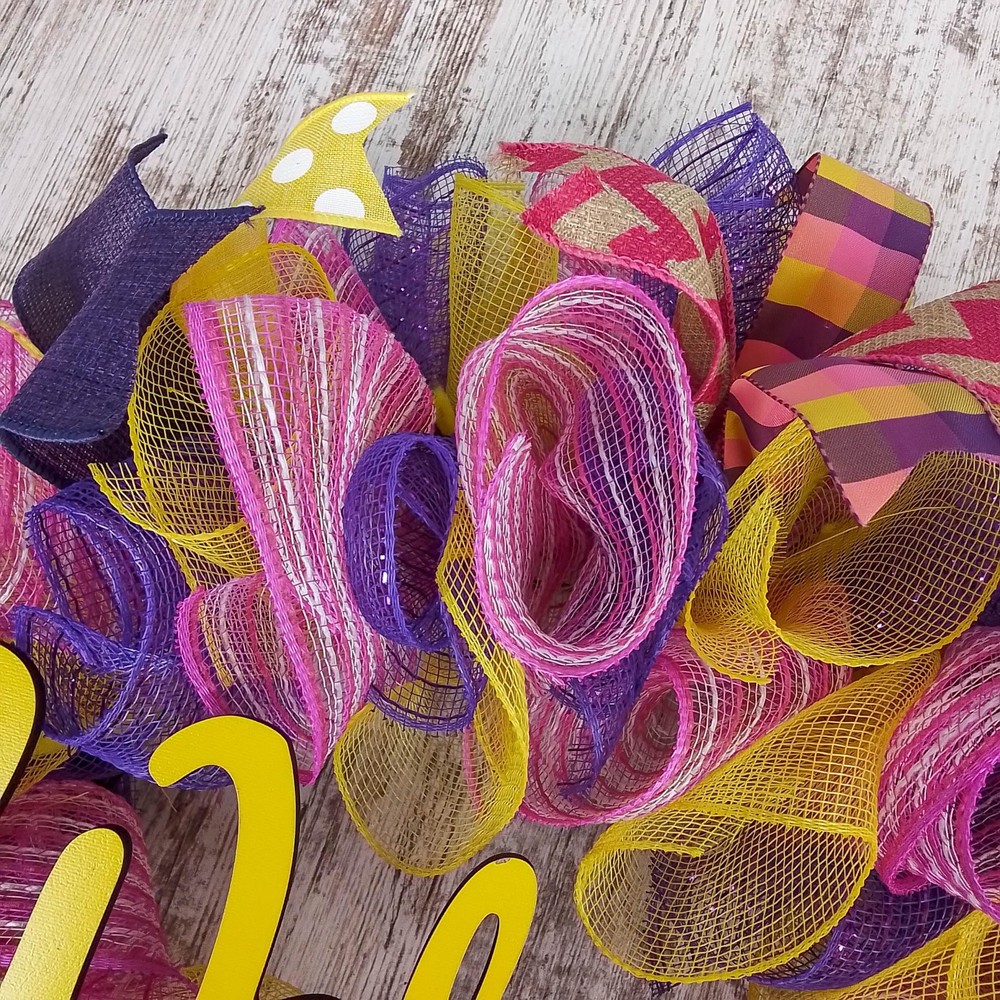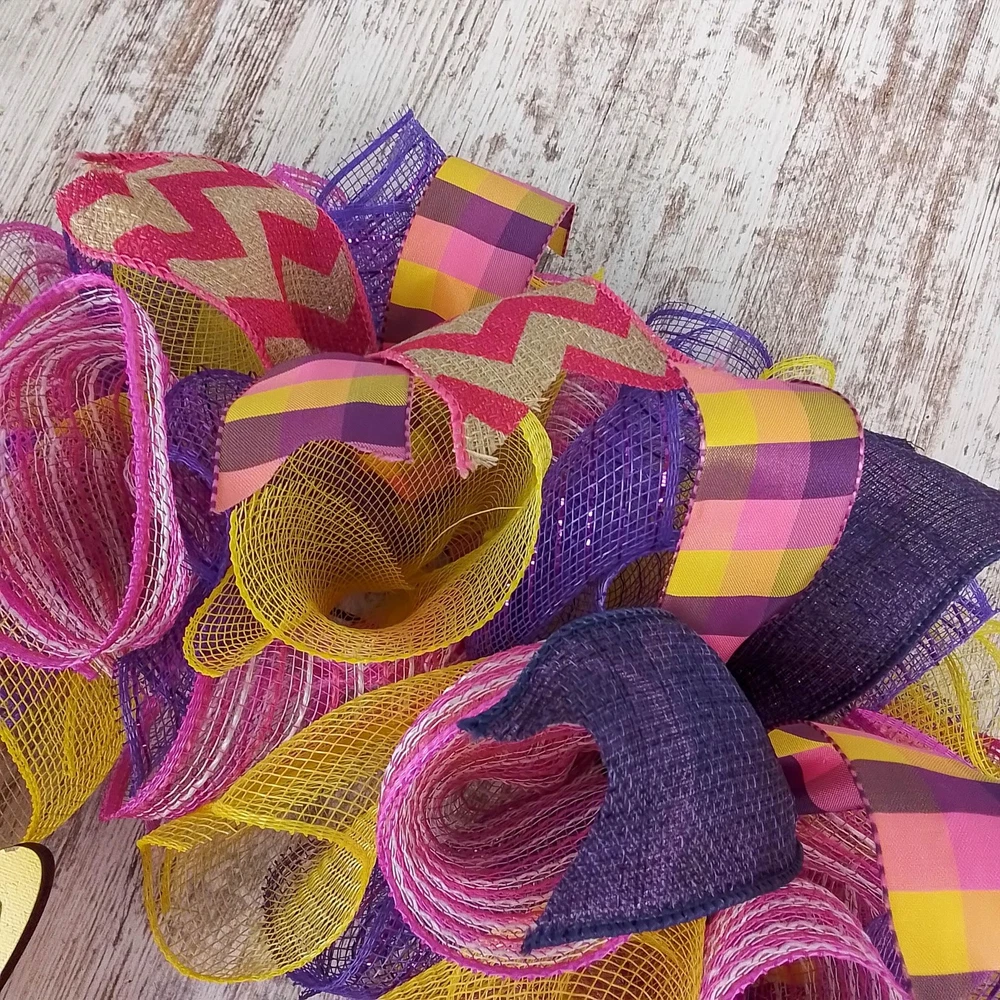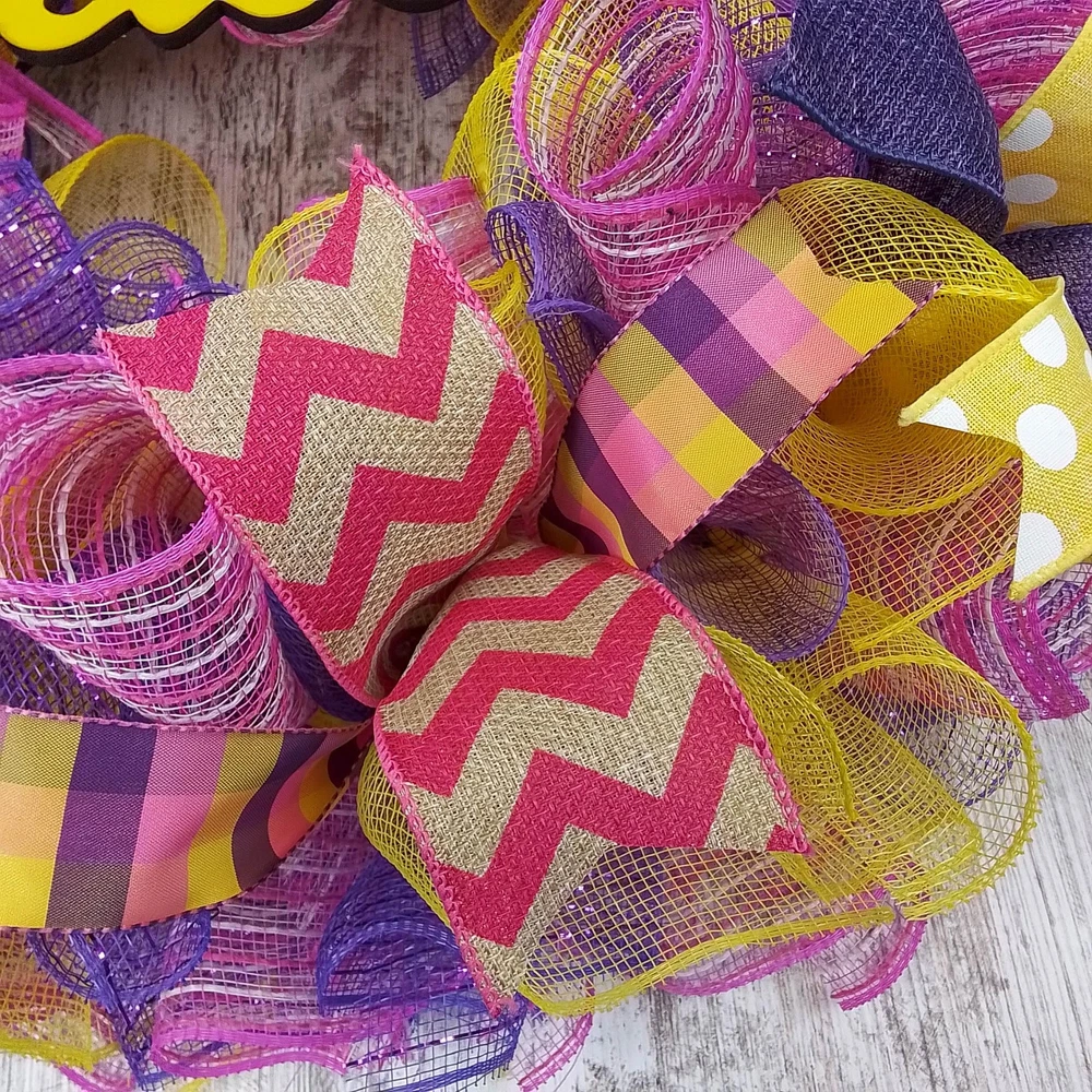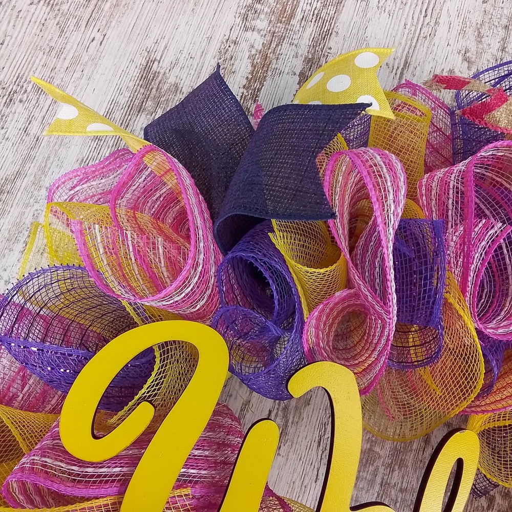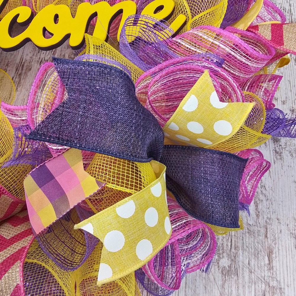 This Everyday pink purple and yellow wreath is made with poly deco mesh and is accented with lots of coordinating ribbons to showcase the yellow welcome sign in the center. This is a listing for a MADE TO ORDER wreath with your choice of colors on the wreath and the monogram! Thank you for looking at all of my listings!! This wreath measures approximately 24 inches round and approximately 5" deep. Want something more custom or have questions? Send me a message...the backbone of my business is custom creations! Purchase with confidence in a seller with excellent reviews and over 15,000 sales between all selling venues. Indoor and outdoor pieces but my wreaths do appreciate a little shelter from the elements to stay in pristine condition.