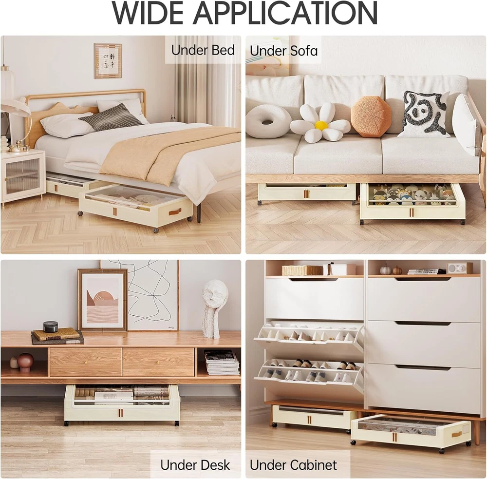 Brand Yecaye Color Beige Material Oxford Fabric and Metal Special Feature Wheeled Style Modern About this item Hold Up to 66lbs: Yecaye under bed storage with wheels is made of high quality 600D oxford fabric and sturdy metal frame, can hold up to 66 lbs, stronger than other fragile metal mesh, spacious capacity perfect for storing clothes, toys, books, shoes and other heavy items also won't compromise stability and durability 360°Rotating Silent Wheels: Say goodbye to constantly carrying heavy storage boxes around your house.This under bed rolling storage comes with 4 x 360°rotating wheels,two of which have locking function.When you need it to remain stationary, just press the locking mechanism gently. No matter how full the cart is, adults and children can easily slide on the floor and carpet Clear Window & Label: Our rolling underbed storage bins are equipped with a Clear window, you can clearly see the stored items, say goodbye to the trouble of misplacing items. Additionly, the included label is great for labeling contents, allowing you to quickly identify and find the item you're looking for without having to open multiple containers or boxes Versatility: Under bed shoe storage dimensions:30.71 x 16.93 x 6.69 inches (with wheels), (applicable under-bed height > 7in), large capacity exceeds your expectation to store more daily items. It can be placed under beds, sofas, tables, and closets to maximize unused space. In addition, this under bed storage drawers can be folded up when not in use, perfect for small families and college dorms that need extra storage space Easy to Install: This rolling storage bin is designed to easy installation and hassle free.Including user-friendly instruction and require minimal effort to set up, which also means you can quickly install and utilize the underbed storage space,saving valuable time and effort,ideal for bed rotting, the blind, and seniors with mobility issues Technical Details Brand Yecaye Color Beige Material Oxford Fabric and Metal Special Feature Wheeled Style Modern Recommended Uses For Product For Clothes Storage Product Dimensions 30.7"L x 16.9"W x 6.7"H Capacity 45 Liters Opening Mechanism Slide Shape Rectangular Pattern Plain Number of Items 2 Storage Volume 45 Liters Number of Compartments 1 Unit Count 2.0 Count Item Package Quantity 1 Maximum Weight Recommendation 66 Pounds Manufacturer YECAYE Item Weight 7.87 pounds Size 2 Pack Special Features Wheeled Batteries Required? No