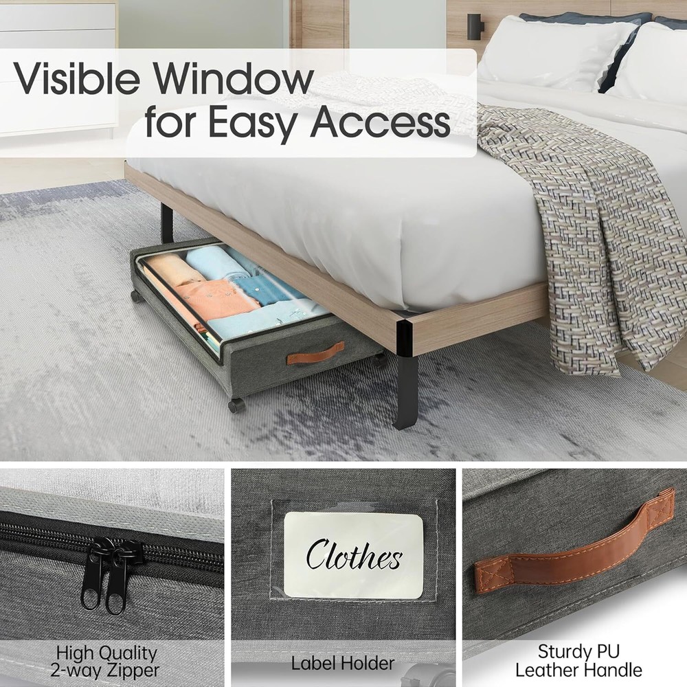 Brand Yecaye Color Hemp Grey Material PU Fabric and Metal Special Feature Wheeled Style Minimalist About this item 300D PU Fabric Hold Up to 66lbs: Yecaye under bed storage with wheels is made of high quality 300D PU fabric and sturdy metal frame, can hold up to 66 lbs, stronger than other fragile metal mesh, spacious capacity perfect for storing clothes, toys, books, shoes and other heavy items also won't compromise stability and durability 360°Rotating Silent Wheels: Say goodbye to constantly carrying heavy storage boxes around your house.This under bed rolling storage comes with 4 x 360°rotating wheels,two of which have locking function.When you need it to remain stationary, just press the locking mechanism gently. No matter how full the cart is, adults and children can easily slide on the floor and carpet Clear Window & Label: Our rolling underbed storage bins are equipped with a Clear window, you can clearly see the stored items, say goodbye to the trouble of misplacing items. Additionly, the included label is great for labeling contents, allowing you to quickly identify and find the item you're looking for without having to open multiple containers or boxes Versatility: Under bed shoe storage dimensions:30.71 x 16.93 x 6.69 inches (with wheels), (applicable under-bed height > 6.7in), large capacity exceeds your expectation to store more daily items. It can be placed under beds, sofas, tables, and closets to maximize unused space. In addition, this under bed storage drawers can be folded up when not in use, perfect for small families and college dorms that need extra storage space Easy to Install: This rolling storage bin is designed to easy installation and hassle free.Including user-friendly instruction and require minimal effort to set up, which also means you can quickly install and utilize the underbed storage space,saving valuable time and effort,ideal for bed rotting, the blind, and seniors with mobility issues Technical Details Brand Yecaye Color Hemp Grey Material PU Fabric and Metal Special Feature Wheeled Style Minimalist Recommended Uses For Product For Under Bed Storage Product Dimensions 30.31"L x 16.54"W x 6.69"H Capacity 45 Liters Closure Type Zipper Water Resistance Level Waterproof Item Weight 8.82 Pounds Opening Mechanism Zipper Shape Rectangular Pattern Plain Number of Items 2 Storage Volume 45 Liters Number of Compartments 1 Unit Count 2.0 Count Item Package Quantity 1 Material Feature Waterproof Occasion Home Maximum Weight Recommendation 66 Pounds Manufacturer YECAYE Item Weight 8.82 pounds Country of Origin China Size 2 Pack Number Of Pieces 2 Special Features Wheeled Batteries Required? No