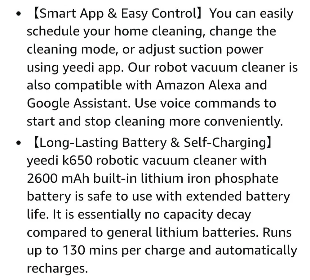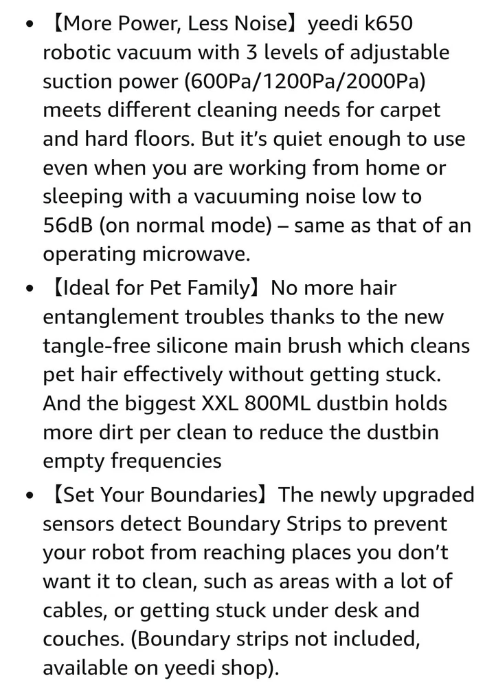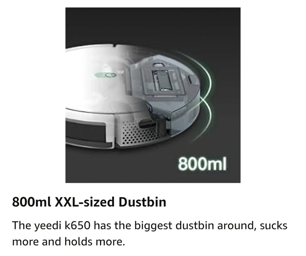 YEEDI K650 ROBOT VACUUM, WITH 2000Pa Wi-Fi ROBOTIC VACUUM CLEANER WITH THE 800ML BIGGEST DUSTBIN AND TANGLE-FREE BRUSH, 3 MODES, SELF-CHARGING, COMPATIBLE WITH BOUNDARY STRIPS...... *FEATURES * ■ MORE POWER LESS NOISE ■ IDEAL FOR PET FAMILY ■ SET YOUR BOUNDARIES ■ SMART APP AND EASY CONTROL ■ LONG-LASTING BATTERY & SELF-CHARGING ■ PREVENT COLLISIONS, FALLS, & SCRATCHES ■ THREE BRUSHES FOR DEEP CLEANING ● *WHAT YOU GET*: 1 YEEDI K650 ROBOTIC VACUUM CLEANER, 1 CHARGING DOCK WITH POWER ADAPTER, 2 SIDE BRUSHES, 1 SILICON TANGLE-FREE BRUSH, 1 MULTI-FUNTION CLEANING TOOL, 1 HIGH-PERFORMANCE FILTER IN DUSTBIN, 1 INSTRUCTION MANUAL, AND OUR 12-MONTH WORRY-FREE WARRANTY. ☆ *BRAND NEW SEALED BOX*