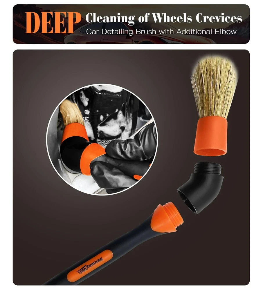WHEEL BRUSHES FOR CLEANING WHEELS: Our 360° Bendable wheel brush for car detailing are suitable for all shapes of wheels or spokes cleaning, the large brush measures length is 16 inch, the diameter is 2.4" wide, the small one has the same 16"-length and diameter is 1.4" fibers. DEEP CLEANING: Our wheel brush kit equipped with boars hair detailing brush, differ from other brushes with hard PP bristles, our detaing brush set made of premium boar bristles, which are more delicate to clean without scratches, the elbow connector is easy to reach narrow or tight space. EFFICIENTLY & QUICKLY: YeewayVeh rim brush is made premium soft synthetic wool fibers, the longer bristles than others can help penetrate deep entire inner barrel of the wheel for quickily thorough cleaning, tire brushes for cleaning tires is a convenient way to keep your rims clean. ERGONOMIC FOAM GRIP: Car wheel brush with ergonomic EVA foam grip, comfortable and effortless, rim cleaning brushes designed with rubber lid for fiber stable and durability, it pairs perfect with a nice degreaser or wheel cleaner. WHAT YOU GET: The package included 1 x 2.4-inch diameter Bendable wheel Brush, 1 x 1.4-inch diameter Bendable Rim Brush, 1 x Detailing Brush. wheel cleaning kit is the entry level brushes for tire maintenance and makes cleaning wheels easier and faster.