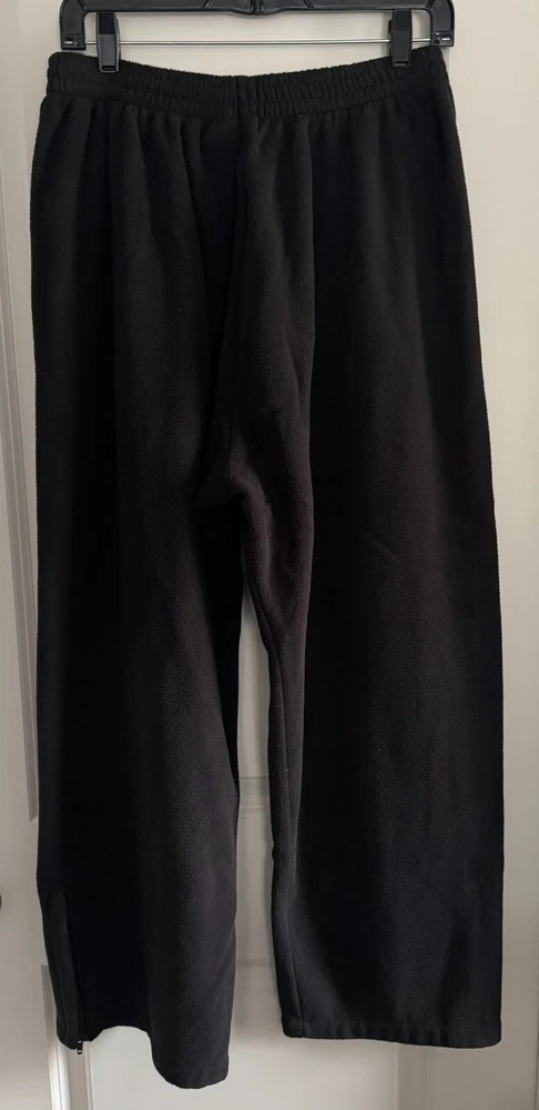 New in the bag with drawstring and zippers on the bottom. The Yeezy YZY x GAP H10 Polar Fleece Pants in black, size L, exude a designer-style created by Kanye West. These relaxed-fit sweatpants are made of a comfortable heavyweight fleece fabric blend of polyester and cotton, perfect for activities like gym training, track and field, or casual wear during the fall, winter, or spring seasons. The pants feature a straight leg design and are suitable for men looking for a fashionable and functional addition to their activewear collection.