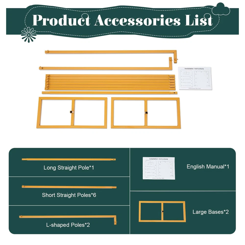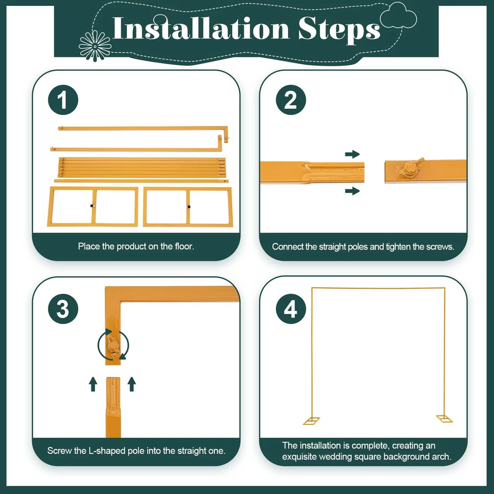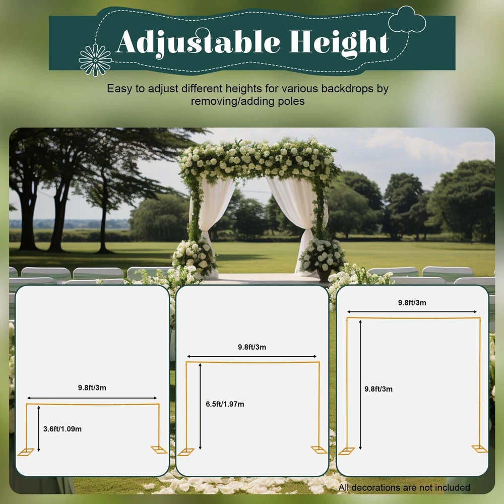 Specification Color: Gold Material: Iron Style: Classic, Elegant Shape: Square Process: High-temperature Baking Paint Assembly Required: Yes Adjustable Height: 1.09m/3.6ft, 1.97m/6.5ft, 3m/9.8ft Total Width: 3m/9.8ft Base Size: 52*23*2cm/20.47*9*0.8in Pole Size: 2*2cm/0.8*0.8in Package Size: 108.5*28*10cm/42.7*11*4in Gross Weight: 5.25kg/11.57lbs Net Weight: 4.7kg/10.4lbs Package Included 2* L-shaped Poles 6* Short Straight Poles 1* Long Straight Pole 2* Bases 1* English Manual Have a nice day~ Product Description Backdrop Stand Heavy Duty with Base Yellow Square Metal Arch Party Frame Our square arch stand is characterized by high-quality metal materials, which are designed to provide strong and balanced support in various indoor and outdoor conditions. Its yellow exterior and adjustable height can fit with such decorations as flowers, vines, balloons, and LED lights, which will make a wonderful memory. Features Sturdy and Stable With the square poles and butterfly screws, this high-quality iron arch is built to be more sturdy and stable, which can withstand outdoor use in various weather conditions. Height Adjustable The wedding arch features an adjustable design. Its height (3.6ft/6.5ft/9.8ft) can be adjusted by removing/adding poles, which is suitable for various backdrops. Large Base The large base with a size of 20.47*9in can stand firmly on the ground even in severe weather by putting sandbags (not included) on it. DIY Decoration The square wedding arch can be easily combined with other decorations such as flowers, vines, balloons, LED lights, etc., to create an impressive scene. Package Included: Notes: 1.Please note that flowers and other decorations are not included in the package. 2.Please tighten each screw on the pole. 3.Please put it on a flat floor for installation. 2* L-shaped Poles 6* Short Straight Poles 1* Long Straight Pole 2* Bases 1* English Manual Specification: Color: Gold Material: Iron Style: Classic, Elegant Shape: Square Process: High-temperature Baking Paint Assembly Required: Yes Adjustable Height: 1.09m/3.6ft, 1.97m/6.5ft, 3m/9.8ft Total Width: 3m/9.8ft Base Size: 52*23*2cm/20.47*9*0.8in Pole Size: 2*2cm/0.8*0.8in Package Size: 108.5*28*10cm/42.7*11*4in Gross Weight: 5.25kg/11.57lbs Net Weight: 4.7kg/10.4lbs Suitable for weddings, anniversaries, birthday parties, baby showers, graduations, dates, proposals, engagements, or any other special parties and events. This sturdy iron arch also easily disassembles so you can fit it in your car and move it from location to location.Product Wedding background decoration This circular arch is very suitable for wedding arches, and can be customized with ribbons, balloons, artificial flowers and curtains. Other holiday decoration Christmas, Thanksgiving is coming soon, it will be a good choice for decorating the interior On birthday It can be used as a background wall with delicious cakes on the front. It's definitely a good idea Payment Delivery details Terms of sales About us Contact us Payment We accept ebay payment 。 Fees such as import duties, taxes are not included in the item price or shipping costs. These charges are the buyer's responsibility. Delivery details Shipping: 2-9 working days to: USA Terms of sales We maintain high standards of excellence and strive for hundred percent customer satisfaction. Feedback is very important to us. We hope that you contact us immediately before you give neutral or negative feedback, so that we can address your concerns. It is impossible to address issues if we do not know about them! About us Your satis faction is our ultimate goal. We work hard to earn your trust and future business. Our certified technicians have tested each item before shipping. The unit comes with 1 year limited warranty on all manufacturing defects. a) If you receive a defective item, you may return it or ask for a discount. Please contact us within 14 days after you receive the package. b) What you returned must be intact and in its original packaging as re? u. Customer is responsible for shipping costs of the returned item. c) We will cover the cost of shipping back t with the shipping rate indicated in the registration page. We will send you a new unit or refund the full payment you paid. Thank you. Contact us Business Hour Business Hour: Monday To Friday: 8:30 AM to 5:00 PM (Beijing China time) Due to time zones, our reply to your questions may not be immediately. But within above working time, we will reply your email within 24 hours. If it's non-workdays, please kindly be patient and wait till Monday. Please contact us with ebay message. Please feel free to contact us if you have any questions. Monday To Friday: 8:30 AM to 5:00 PM (Beijing China time) Due to time zones, our reply to your questions may not be immediately. But within above working time, we will reply your email within 24 hours. If it's non-workdays, please kindly be patient and wait till Monday. Please contact us with ebay message. Please feel free to contact us if you have any questions.