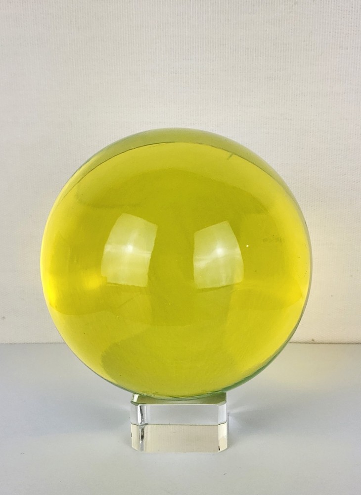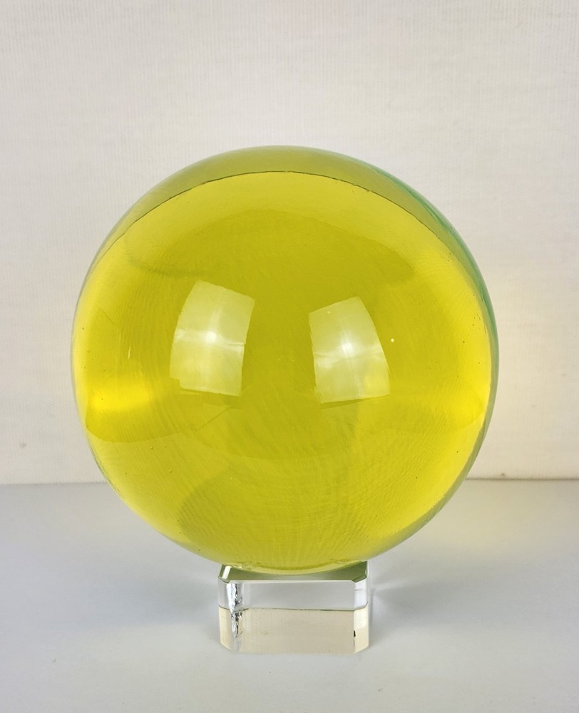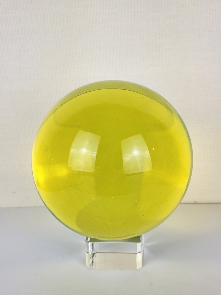 Add a little glow and personality to your desk or shelf with this 3.93" / 100mm Yellow Vaseline Uranium Glass crystal ball paperweight. The solid glass orb is completely round and will not sit on it's own. The base shown is not included. Under blacklight, it shines with a captivating green glow, bringing a fun and unique touch to any room. This piece pairs wonderfully with rustic, cabin, farmhouse, dark, witchy and cottagecore aesthetics — or just anyone who loves cool, glowing decor. Blacklight photo taken with 395nm blacklight but it will glow under any blacklight (395nm / 365nm). *Excellent condition! There are a few very tiny bubbles inside the glass. ***CAUTION - DO NOT ALLOW THIS TO BE STILL IN THE SUNLIGHT FOR LONG PERIODS OF TIME! Crystal balls can cause fires when in direct sunlight from light refraction. We recommend displaying indoors away from windows. *5