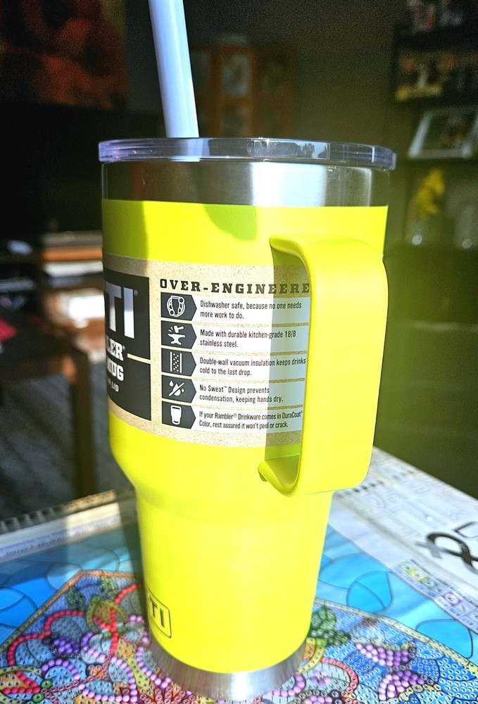 Ships Same Day! The new Yeti 35 oz Rambler Mug with Straw Lid in Chartreuse is a rare and vibrant addition to your kitchen storage and organization collection. This insulated tumbler is perfect for both hot and cold beverages, with a drink-through lid and a convenient handle for easy carrying. Made of durable stainless steel, this solid chartreuse-colored mug is a stylish and practical choice for enjoying your favorite drinks on the go.