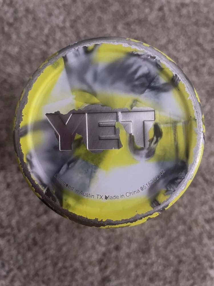 This Yeti is used and does have slight wear. It is listed at a lower price due to the wear, please see below for description of the defects. Bottom ring of the tumblers paint is pretty scratched & it’s peeled up where it says “YETI” - see picture #7 The sides of the tumbler have slight paint chips here and there, not very noticeable unless you’re really looking for them - see picture #’s 4, 5, & 6