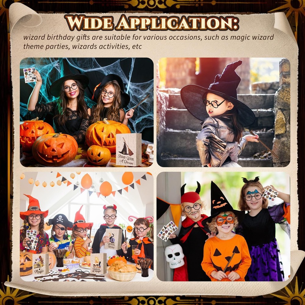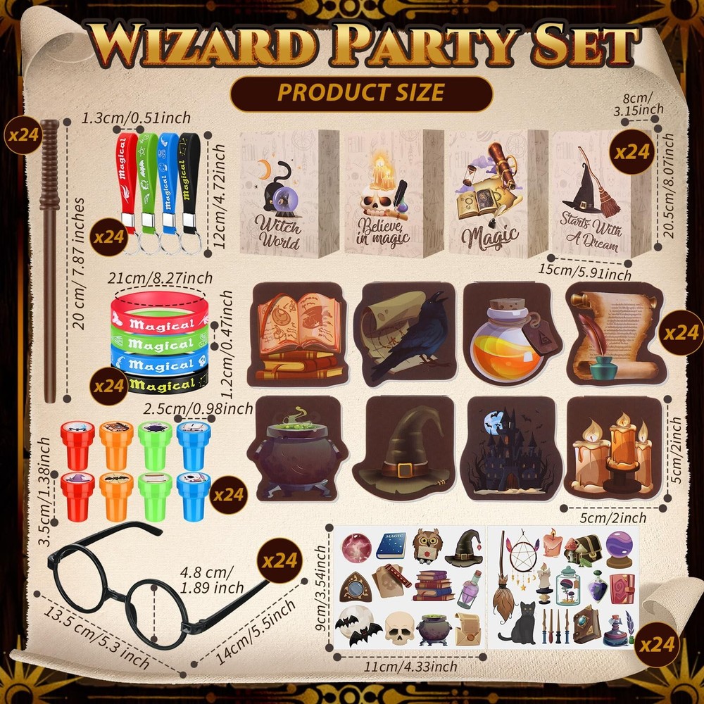 Yexiya 216 Pcs Wizard Party Supplies Magic Theme Birthday Favors with Wizard Wands Pencils Mini Notebook Glasses Bracelet Stickers Gift Bags Favor for Goodie Bag Stuffers Classroom Prizes Supplies Product Details Color: [Mixed] Material: Wood, Resin, Paper, Plastic Brand: Yexiya Theme: Wizard Item dimensions L x W x H: 9.84 x 7.87 x 2.36 inches Occasion: Birthday Item Weight: 1.48 Kilograms Manufacturer: Yexiya Age Range (Description): Kid Product Dimensions: 9.84 x 7.87 x 2.36 inches Item Weight: 3.25 pounds Country of Origin: China Item model number: JF-Yexiya-3526 Manufacturer recommended age: 6 years and up Wizard Party Set: our package includes 24 magic wand pencils, 24 stamps, 24 wizard mini notebooks, 24 wizard glasses frames, 48 stickers, 24 gift bags, 24 silicone bracelets, and 24 keychains; You'll have all the wizard party favors you need to make your party magical and fun Quality Material: magic wand pencils are made from wood, wizard mini notebooks, gift bags and stickers from paper, wizard glasses frames from plastic, and the silicone bracelets and keychains are made from resin; Offering reliability for your magical wizard party favor Realistic Design: each item in our wizard party supplies carries a vivid design; From the magic wand pencils to the wizard glasses frames, these supplies take your wizard birthday favors experience to another level, it creates an immersive experience Amazing Gifts: our wizard party supplies set have a big hit with children, ideal as birthday gifts, goodie bags fillers, Halloween gifts, Thanksgiving gifts, also as a great reward for children and adults Wide Application: wizard birthday gifts are suitable for various occasions, such as magic wizard theme parties, inspiration theme parties, Halloween parties, wizard theme birthday parties or any theme parties with magicians and wizards activities, etc Features: Magical Wizard Party Favor: This set includes everything you'll need to create a magical wizard party favor experience. With items like magic wand pencils, stickers, and silicone bracelets, your guests will be immersed in an enchanting world of wizard, making your event memorable. Wizard Birthday Favors: The comprehensive set has items made from quality materials, promising a party experience like no other. You'll create a world for your guests that will linger in their memories long after the celebration ends. Specifications: Material: Magic wand pencils: wood Wizard mini notebooks: paper Wizard glasses frames: plastic Stickers: paper Gift bags: paper Silicone bracelets: resin Keychains: resin Color: as shown in the picture Size: as shown in the picture Package includes: 24 x Magic wand pencils 24 x Stamps 24 x Wizard mini notebooks 24 x Wizard glasses frames 24 x Stickers 24 x Gift bags 24 x Silicone bracelets 24 x Keychains Notes: Manual measurement, please allow slight errors on size. The color may exist a slight difference due to different screen displays.