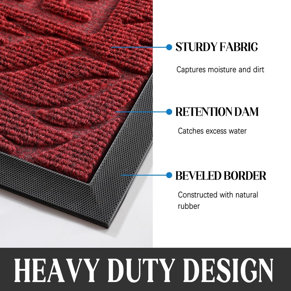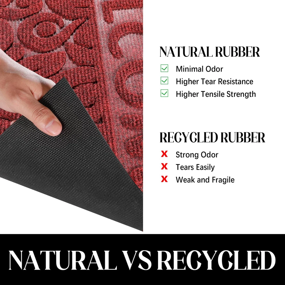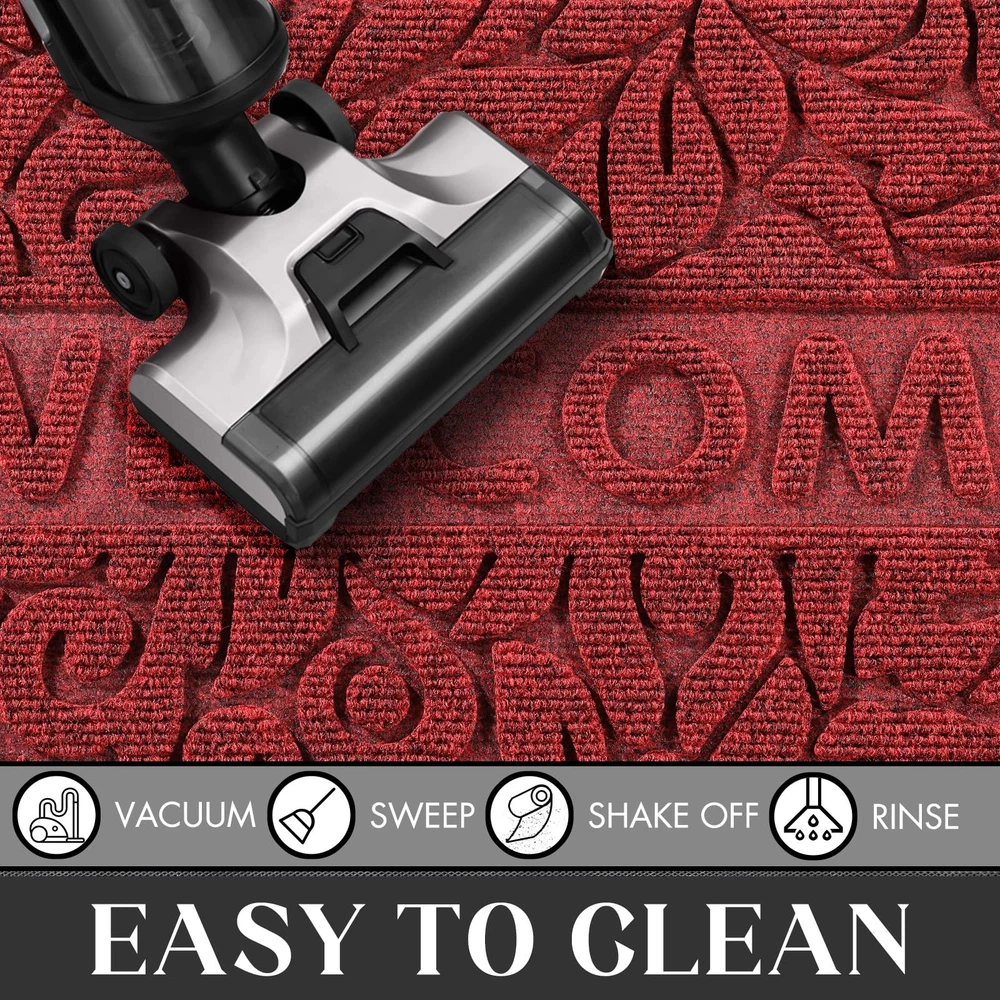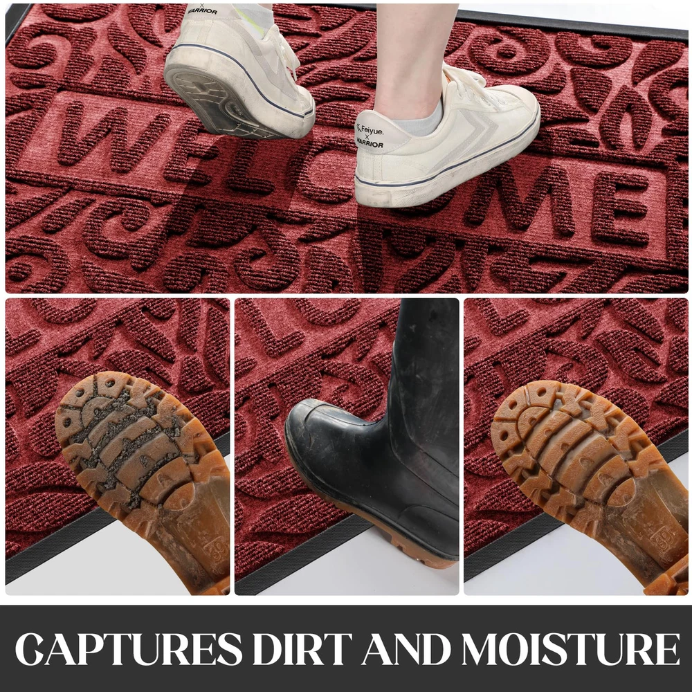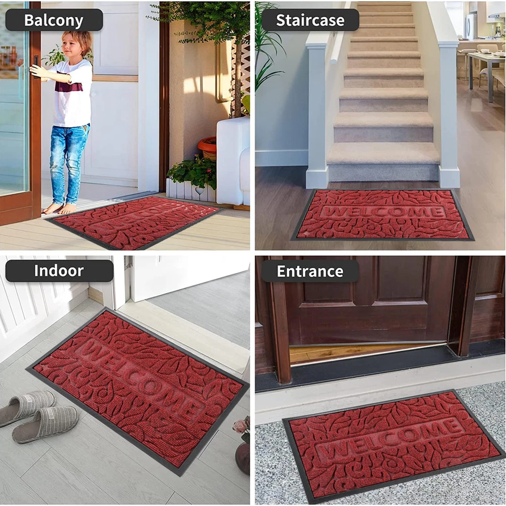 【Capture Dirt and Moisture】: Yimobra front door mat outdoor with "Welcome" pattern grooves and sturdy heavy-duty design, forming a detention dam extending in all directions, helping to capture dirt, dust, gravel, mud, sand, grass or other messy debris and prevent them from entering Indoor; The surface of floor mat beautifully woven polyester fabric absorbs moisture, and the oblique natural rubber edge will not accumulate water in rainy and snowy days, keeping your home dry and clean 【Non Slip Rubber Backing】: Yimobra welcome door mat, 0.25 inch ultra-thin design, can pass under most doors and does not block opening and closing of doors. The outdoor doormat uses a high-quality natural rubber backing to help prevent you from slipping when entering or going out, keeping you safe. In addition, the rubber backing can prevent water and mud from penetrating the floor, keeping door rug in place and not sliding or wear the floor and effectively protect your indoor floor 【Sturdy】: The surface of this Yimobra outdoor doormat is made of high quality polyester material with a unique heat fusion planting production process, so it will not fall off. The bottom and perimeter of the doormat is made of high quality natural rubber, which provides higher tensile strength, higher tear resistance, and less odor than synthetic rubber. Entrance door mat can withstand all kinds of weather and seasonal changes, whether it's sunny, rainy or snowy. 【Easy to Clean】: Yimobra welcome mat outdoor entrance, Just use a vacuum cleaner, or sweep with a broom, or tap the backing and shake the doormat. For more in-depth cleaning, use a garden hose to rinse the floor mat, then hang it in a ventilated place to air dry it 【Wide Use】:Yimobra versatile welcome door mat is stylish and practical, Its beautiful textured design and different colors can decorate your house more beautifully. Doormats are suitable for indoor use to keep your home, or office floors clean, and also for outdoor use, front doors, patio, sidewalks, decks, garages, barns, driveways and many other busy areas. Indoor and outdoor door mats are great gifts for family and friends