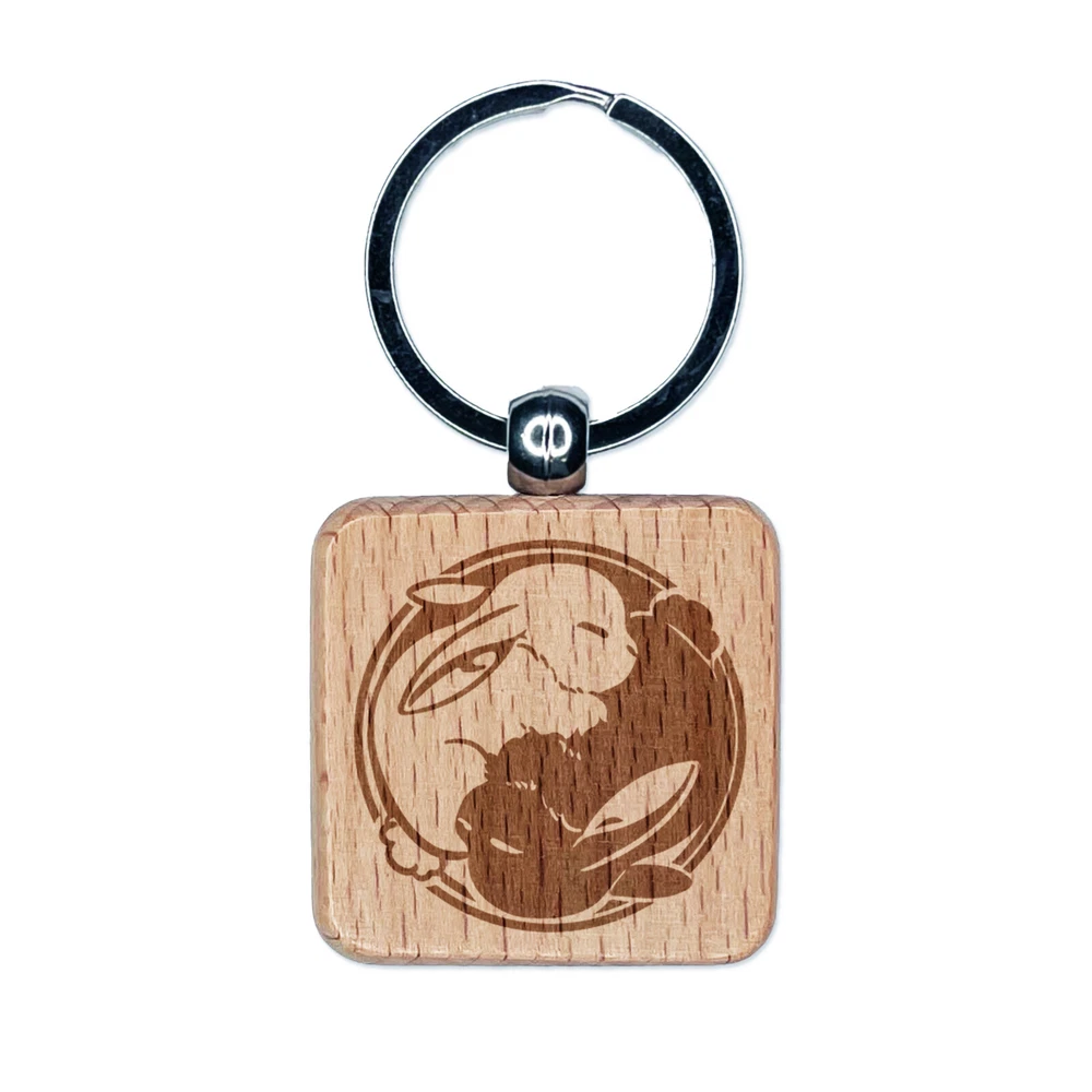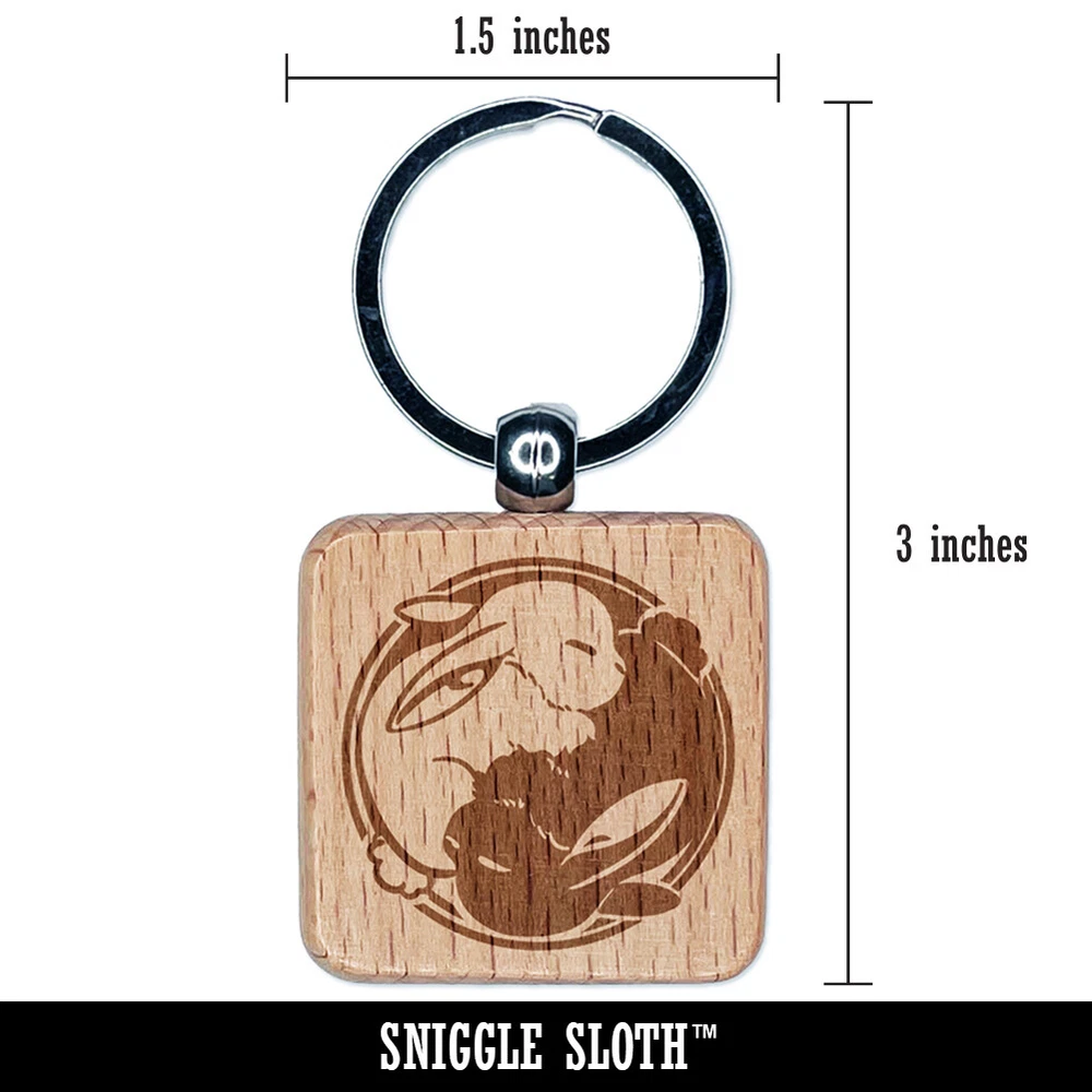 Yin Yang Sleeping Bunny Rabbits Engraved Wood Square Keychain Tag Charm