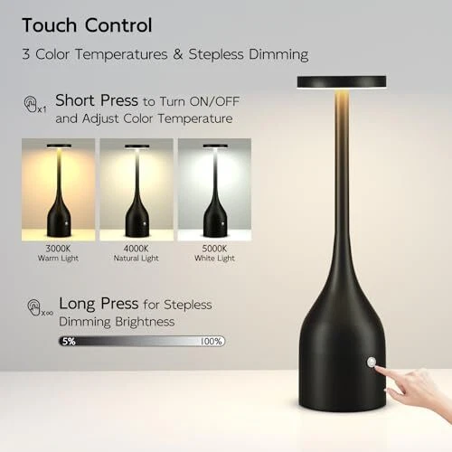 Italian Design Table Lamp:Small LED cordless table lamp combines minimalist design,wireless convenience,and space-saving features which make it a versatile lighting option for any limited space Rechargeable Battery Powered Table Lamp:Built-in 5000 mAh rechargeable battery, can be used for 20~42 hours,chargeable table lamp fully charged by USB C cable for 6 hours Dimmable Cordless Lamp: Stepless dimming brightness(100%-3%); Color temperature range: 2700K-4000k-6500K; Switch the light mode by a touch, long press to dim the light brightness Portable Lamp: It can work without cords. For outdoor, it can be a patio lamp or restaurant table lamp; For home,it can be a dining table lamp,kitchen lamp .....everywhere has no plug IP65 Waterproof for Outdoor Lighting: This lamp has been made weatherproof layer treatment, not afraid of rain erosion, to maintain a timeless elegance