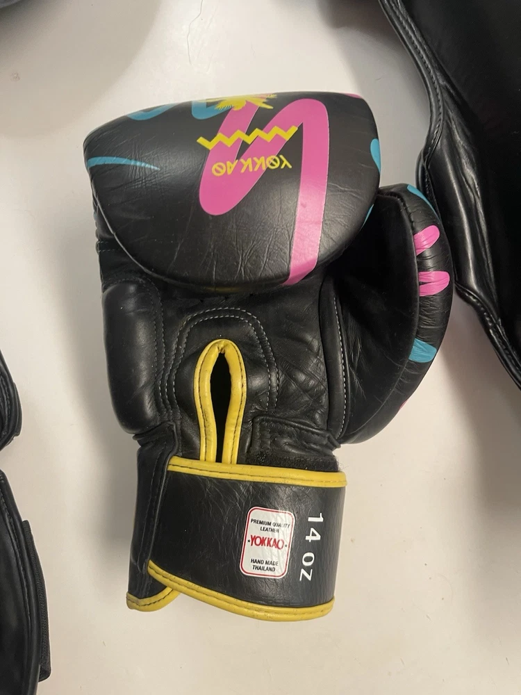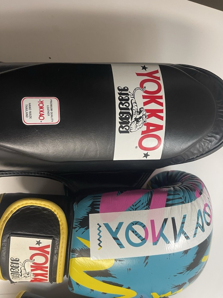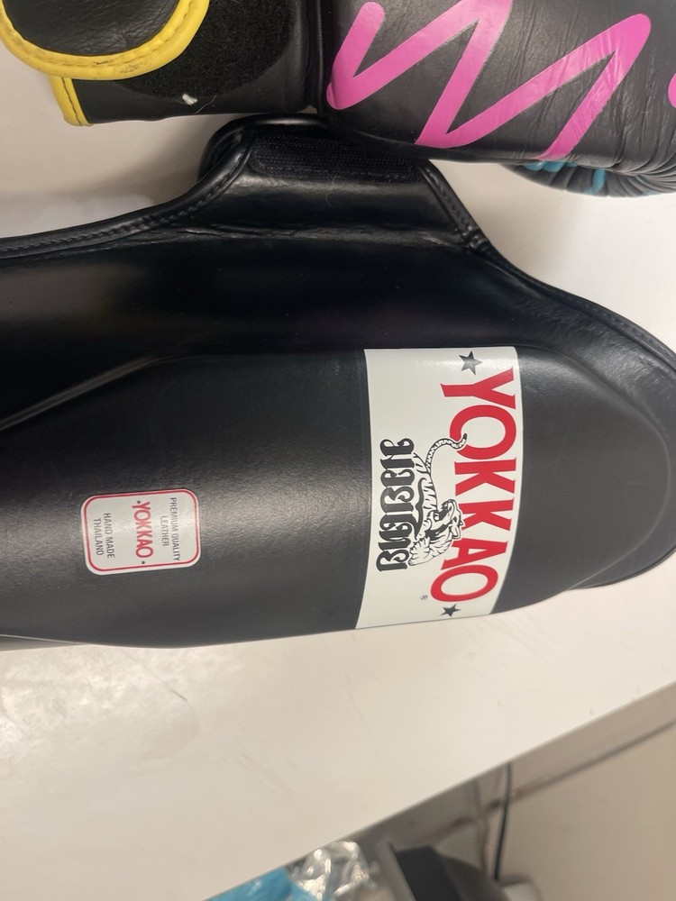 Yokkao Muay Thai Gloves And Shin Guards. The shin guards are barely used. Essentially almost new. I can’t think how many times they were even actually worn but have been in a temperature controlled environment for awhile and are in excellent to like new condition and that is if I am being extremely critical with a very high standard. Even with that I would grade them a 9.5/10 The gloves are a super cool design that I absolutely love. They are 14 oz and unlike the shiny guards have absolutely been used. With that being said the leather is still in fantastic shape with absolutely no cracking and a little bit of creasing and they look and smell good! I would grade these a 6/10 maybe a 7/10 and that is if I am being very harsh on the rating. The Velcro could be better but it holds well enough however not perfect. They look great and do not feel stiff they feel loose in a good way. Let me know if there are any other questions you may have. Thank you for looking and have a phenomenal day. I ship quickly