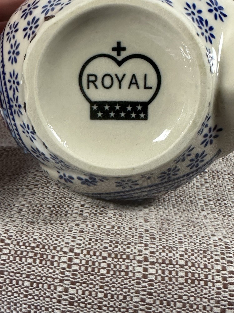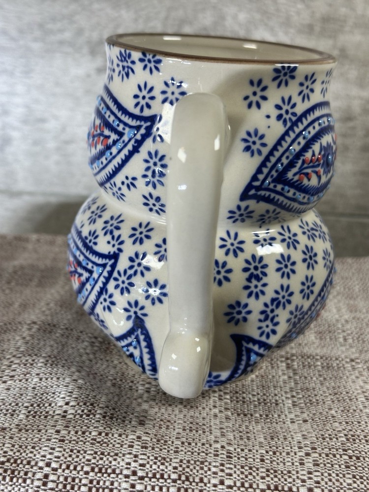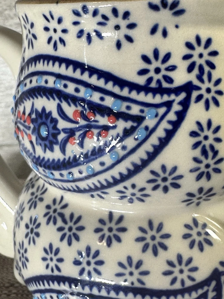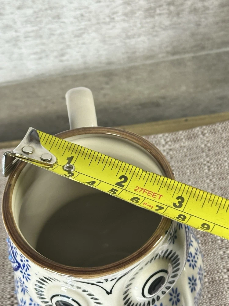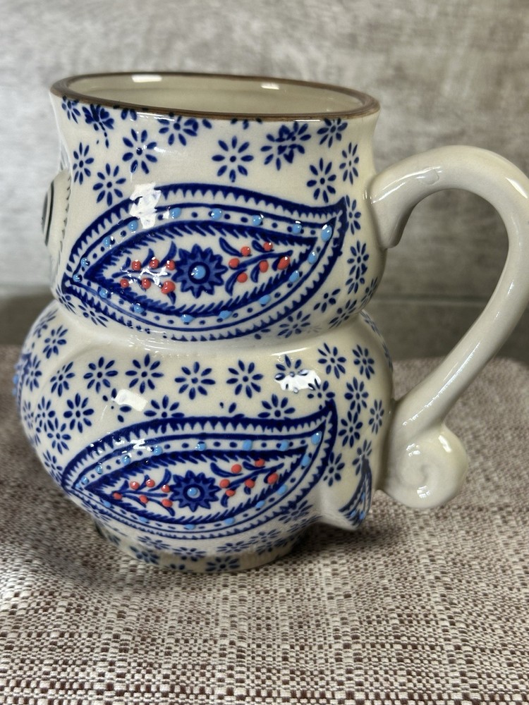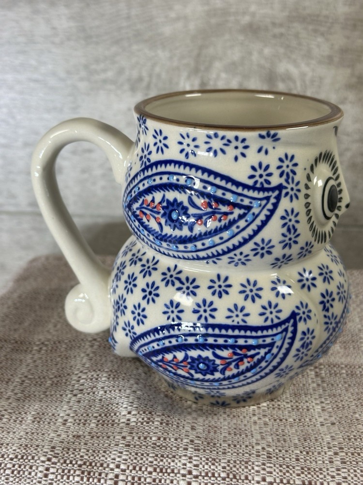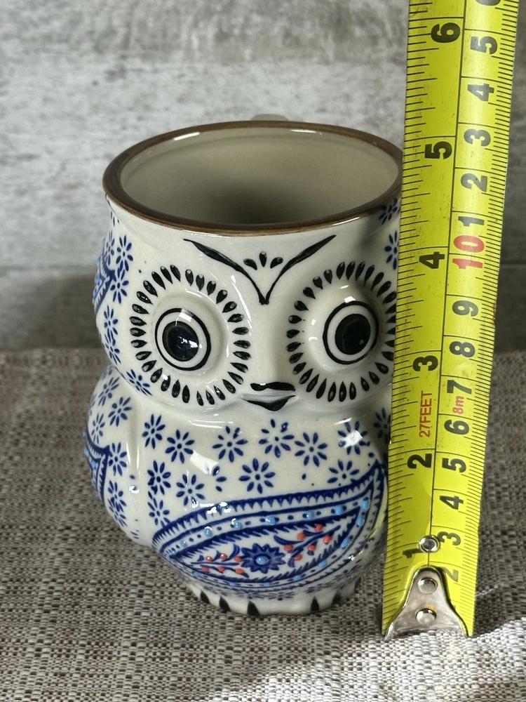 An original creation from Royal Yokohama Studio, known for high-quality ceramic craftsmanship and artistic designs. Design Details: This figural owl mug features a vibrant, hand-painted paisley pattern on the front with blue floral accents throughout the body. It utilizes a 3D embossed (moriage) technique, giving the surface a raised, textured feel. Specifications: Capacity: Approximately 12 oz (350 ml). Dimensions: Stands roughly 4.5 inches tall with an opening diameter of about 2.75 to 3 inches. Material: Durable, high-quality ceramic. Features: Suitable for both hot and cold beverages. While many listings state they are dishwasher and microwave safe, hand washing is often recommended to preserve the detailed hand-painted finish. Style: A charming, whimsical addition to any kitchen or a perfect gift for owl lovers and collectors of unique pottery