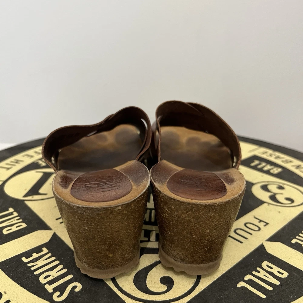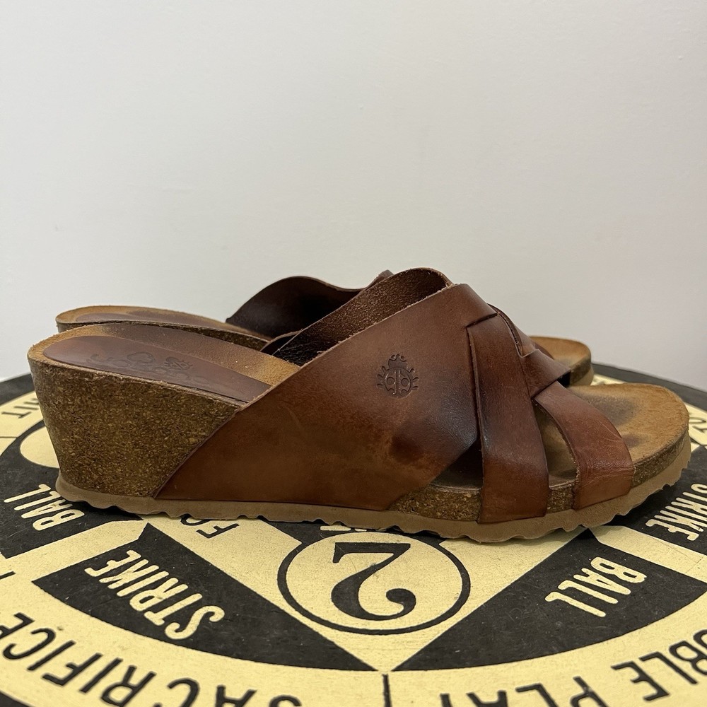 Yukono brown leather woven wedge slip on sandals. Has some staining. Soles have light even wear. Women’s size 9.5