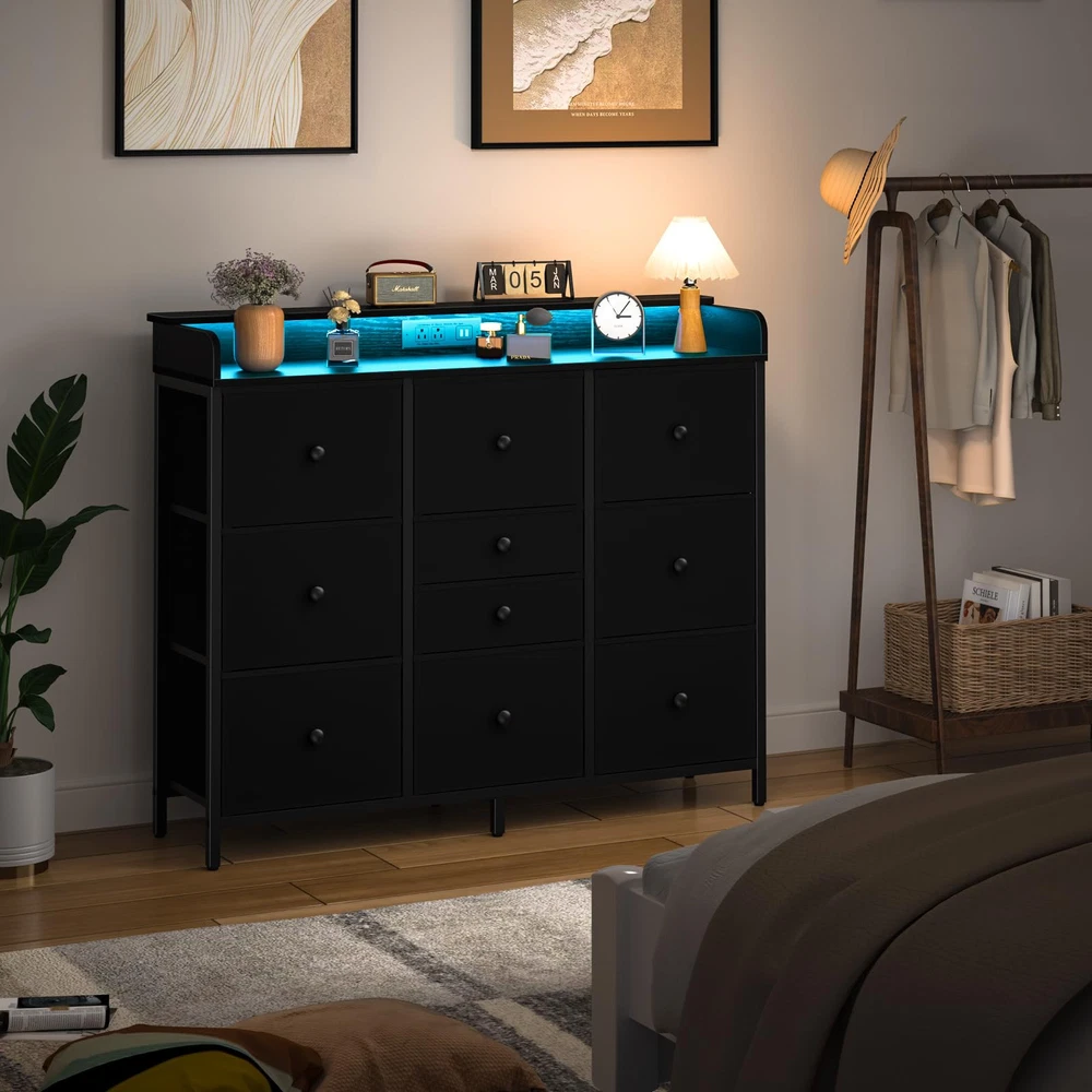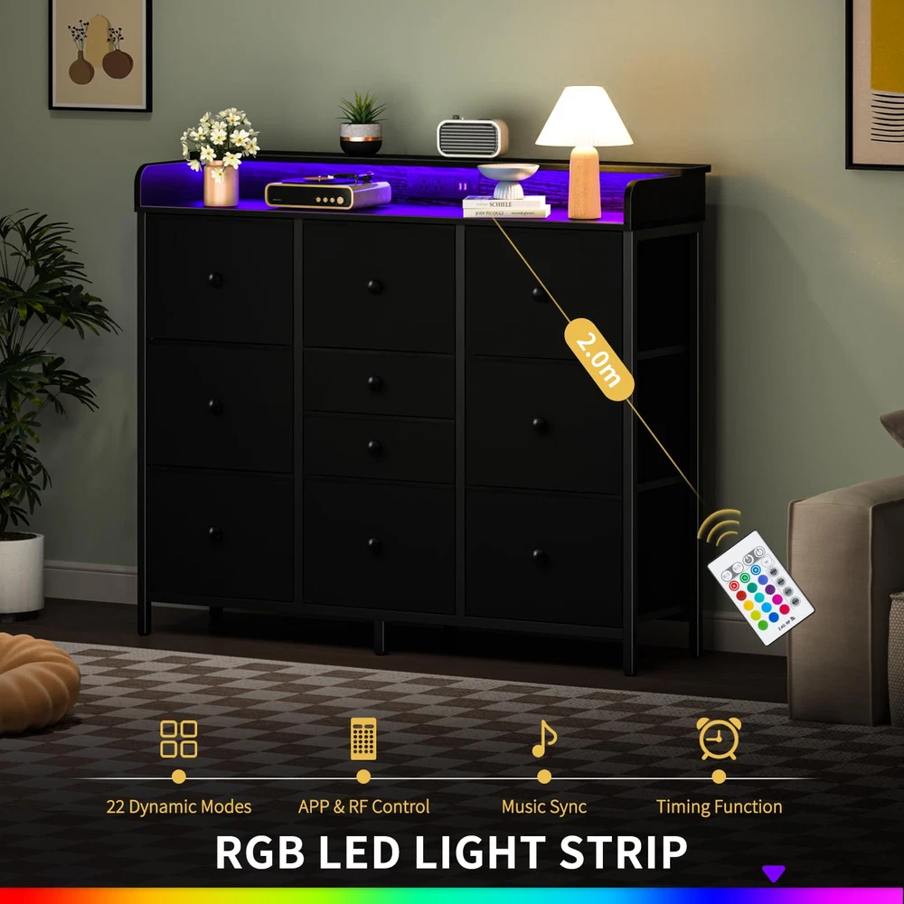 Always by Your Side. Dressers for Bedroom Overall Dimensions: 44"L x 12.6"W x 37.4"H & 6.5ft Power Cord 【Ample Storage/Display Space】Blending style and function, this black dresser for bedroom features 10 fabric drawers, a spacious surface and a wood top shelf for all your storage/display needs. Whether it's messy toys, piles of laundry or odds and ends that can be organized into the cabinet for a clean and tidy room. It is not only a closet dresser, a decorative tall dresser, but the spacious tabletop can also hold a TV, allowing it to serve as a TV stand 【Bedroom Dresser with Charging Station】 Meet your new charging best friend—Yoobure chest of drawers for bedroom. The small dresser with drawers has 2 AC and 2 USB ports, can easily charge your phone, laptop, smartwatch, stereo, and more, making charging even more convenient. The LED lights of the upgraded dresser has a special place behind the outlet to be plugged into and do not occupy the surface USB port 【LED Long Dresser TV Stand】 This wooden dresser with LED lights follows your beat and creates a relaxing and romantic atmosphere with RGB colors, music synchronization, and dynamic modes to create a pleasant evening. Even better, the light strip can be easily used via remote control or app 【Stable 10 Drawers Storage Chest】 The tall dressers for bedroom are made from Fsc-Certified wood with a reinforced frame, designed for both durability and fine craftsmanship to ensure long-term use. The dressers for bedroom include an anti-tip device, reinforced back braces, extra support legs, and adjustable foot pads for added stability. Enjoy a reliable storage solution with our bedroom dressers with drawers 【Easy Assembly & Nice Service】 Assembling is A Breeze! It comes with a detailed manual, labeled parts, assembly tools that allow you to assemble the dresser quickly and smoothly. Plus, you can scan the included QR code or visit the product page for an assembly video guide. Enjoy peace of mind with our customer service.
