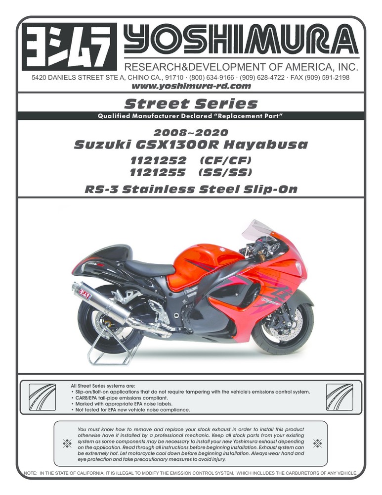 CA Emissions Info Shipping Contact Us Item Availability Returns IMPORTANT CALIFORNIA SPECIFIC EMISSIONS NOTICE California laws prohibit (in most cases) the use of any aftermarket product whose installation requires the removal of any emissions control related components as regulated by the California Air Resources Board. Three classification levels of emissions related aftermarket products define which aftermarket parts can be sold legally in the state of California: Replacement Parts parts that have the same function and affect on emissions as the parts they are replacing. This means that if a vehicle was not originally equipped with a catalyst and all other emissions related controls that were connected (such as oxygen sensors) are reconnected, then the part is considered a Replacement Part. If the vehicle has a catalyst and the installation of the part does not remove the catalyst, and all other emissions related controls are reconnected, then this is considered a replacement part. Slip on mufflers in applications whereby the catalyst is not contained in the original muffler is an example of a replacement part. Full exhaust systems installed on vehicles that did not originally contain a catalyst and whereby the design allows the reinstallation and original function of any other emissions control related components are also considered replacement parts. Modified Parts parts that alter the emissions control related performance from the original part they are replacing, These parts may have catalysts in them but they perform differently from the original equipment part or they may require the alteration or elimination of other emissions related control components such as oxygen sensors. These parts must obtain an Executive Order ("EO") from the California Air Resource Board (C.A.R.B.) to confirm their functional compliance in order to be sold legally in California. Competition or Racing Vehicle Parts parts that are used exclusively in competition on race only vehicles. These parts do not require approval as long as they "are not used on public highways". Labeling a product as being for "Racing Only" or "Closed Course Competition" is not sufficient for it to be included under this classification. It must be a competition vehicle and must not be used at any time on a public highway. Many exhaust systems, intake kits, fuel tuners, and performance parts we sell are specifically designed and designated as/for "Competition and Racing Vehicles Only". Any/All model application pictures shown are for reference only and solely intended for Competition and Racing Vehicles only and must not be used at any time on a public road/highway. If an item is designated as "Competition and Racing Vehicles Only", we will require a race waiver be digitally signed before an item can ship to California. If an item is to be exported from California, an export waiver is available as well. This is a REQUIRED guarantee from you that a restricted item will NOT be used on any public highway in California; only on private race tracks in racing or competition use. Many "Modified Parts" are sold with out restriction in California and will be identified with a C.A.R.B. "EO" number and will arrive with appropriate labels to indicate the approved status. If you're not sure about the California emissions status of an item, please contact us for clarification before placing your order Check the shipping calculator for estimated shipping costs. If your location isn't shown, or shipping cannot be calculated for your location, please contact us for a shipping price. International buyers are responsible for duty and VAT charges. We do not collect those fees, we do not have control over them, nor do we know how much they will be for any given country. Our retail/internet/mail order warehouse is in the Gorman, California area between Los Angeles and Bakersfield. All items are available for local pick up, but please contact us to make arrangements before hand. Some high-value items will require signature for delivery. Open 7 Days A Week! Mon.-Sat. - 8am-5pm PST Sunday - 8am-Noon PST Contact us through ebay. Click "Ask a question" at the bottom of the description. Please check the estimated delivery date shown in the shipping tab, these are updated daily based on current inventory across all of our warehouses. We always try to meet or beat these stated delivery times. Some items are made to order and can have longer lead times; check the shipping details for an estimate. Please contact us for expedited shipping options if needed. All exchanges and returns must be in the original packaging, with all directions & accessories, in new condition. Please contact us with any questions. 1121252 Product Details: The race-bred RS-3 exhaust has proven to be extremely popular among rider looks for a combination of performance and value. It enhances performance dramatically, provides an enviable exhaust note and offers the unmistakable look and sound of Yoshimura. RS-3 mufflers feature a straight baffle that leads to a single turn-down machined aluminum end cap. Fits the following vehicles type years make model engine required location notes Motorcycle 08-20 Suzuki GSX1300R Hayabusa 1340 1 Motorcycle 2014 Suzuki GSX1300R Hayabusa 50th Ann. Edition 1340 1 Motorcycle 2013 Suzuki GSX1300R Hayabusa Limited Edition 1340 1 Unless stated otherwise, these vehicle compatibilities are based on USA models with original equipment. Thanks for shopping with us ! Starcycle USA has been serving the world's motorcyclists since 1968. Our retail/internet/mail order warehouse is in the Gorman, California area between Los Angeles and Bakersfield. All items are available for local pick up, and installation! If you'd like to make an appointment for service contact us.