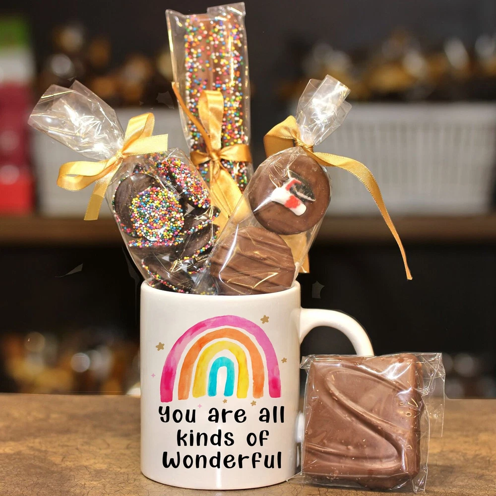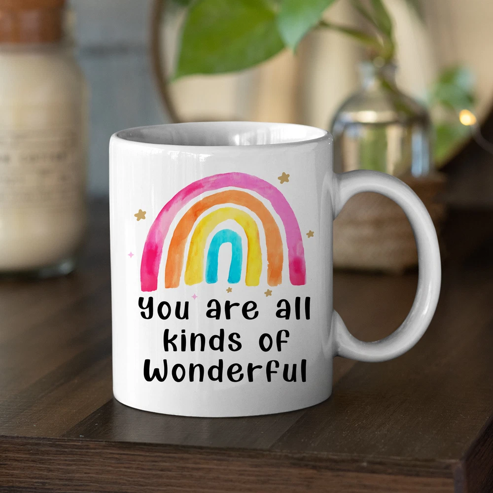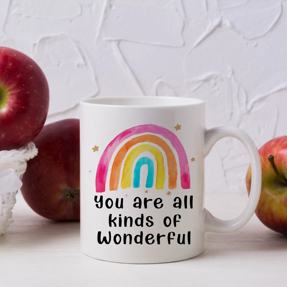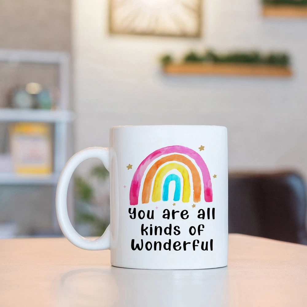 You Are All Kinds Of Wonderful Rainbow Mug Birthday Gift Ideas Coffee Mug Product Details.. This high quality 11oz. ceramic white mug has a premium hard coat that provides crisp and vibrant color reproduction sure to last for years. Perfect for all hot & cold beverages. The highest quality printing possible is used. It will never fade no matter how many times you wash it. Material: 100% Ceramic. Print both sides. Dishwasher and Microwave Safe. High Gloss + Premium White Finish. Printed in the U.S.A. Personalized & Custom. We support personalized and custom mug to add custom, when placing an order, you can add notes to the "order note" in shipping address section. Also you can contact us directly via message. Shipping Info. Ready to ship in 1 to 2 business days, All products are made-to-order and proudly printed in the United States. Shipped by USPS and DHL, You will receive your order in 5-7 days. Replace & Refund. All products are defective during shipping broken, chipped will be replaced free of charge. You are not satisfied with the product, we will refund 100% money to you. If any other issues arise, please do not hesitate to message, we would be more than happy to assist you.