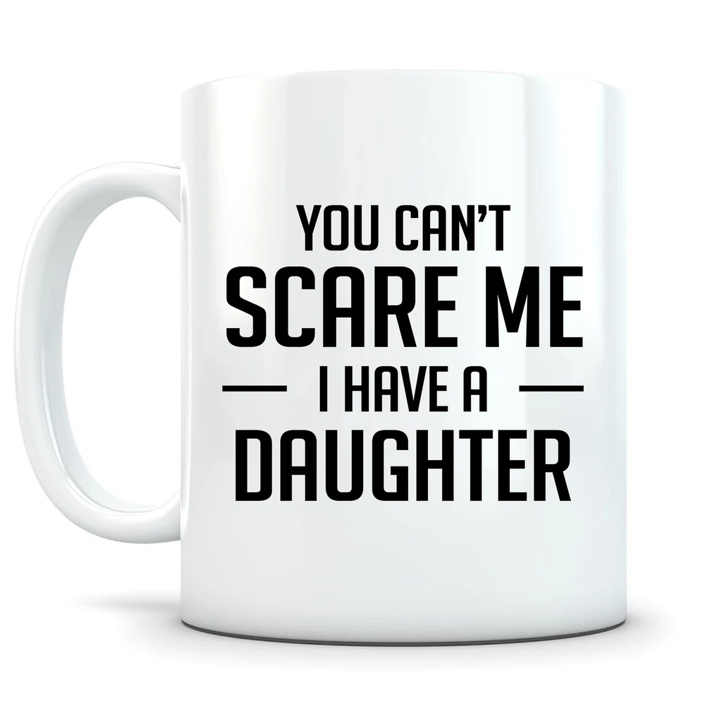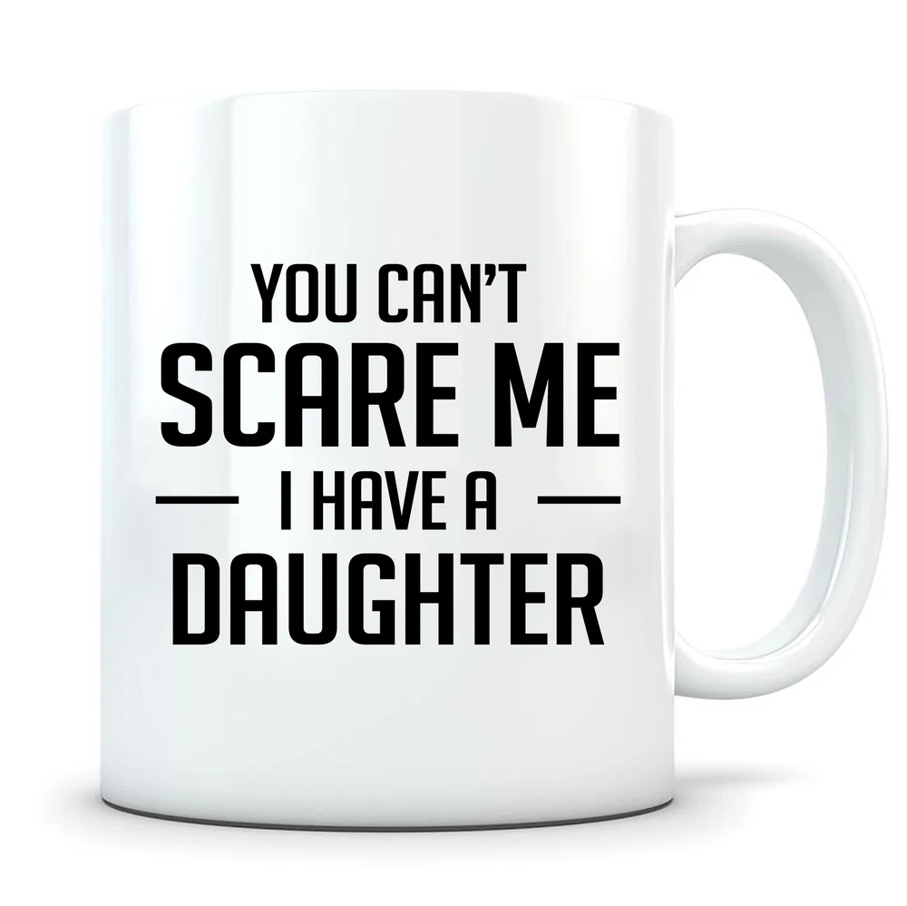 You Cant Scare Me I Have A Daughter Mug Father Mother Gift Dad Gift From Product Details.. This high quality 11oz. ceramic white mug has a premium hard coat that provides crisp and vibrant color reproduction sure to last for years. Perfect for all hot & cold beverages. The highest quality printing possible is used. It will never fade no matter how many times you wash it. Material: 100% Ceramic. Print both sides. Dishwasher and Microwave Safe. High Gloss + Premium White Finish. Printed in the U.S.A. Personalized & Custom. We support personalized and custom mug to add custom, when placing an order, you can add notes to the "order note" in shipping address section. Also you can contact us directly via message. Shipping Info. Ready to ship in 1 to 2 business days, All products are made-to-order and proudly printed in the United States. Shipped by USPS and DHL, You will receive your order in 5-7 days. Replace & Refund. All products are defective during shipping broken, chipped will be replaced free of charge. You are not satisfied with the product, we will refund 100% money to you. If any other issues arise, please do not hesitate to message, we would be more than happy to assist you.