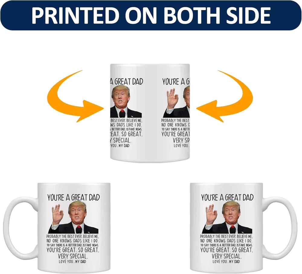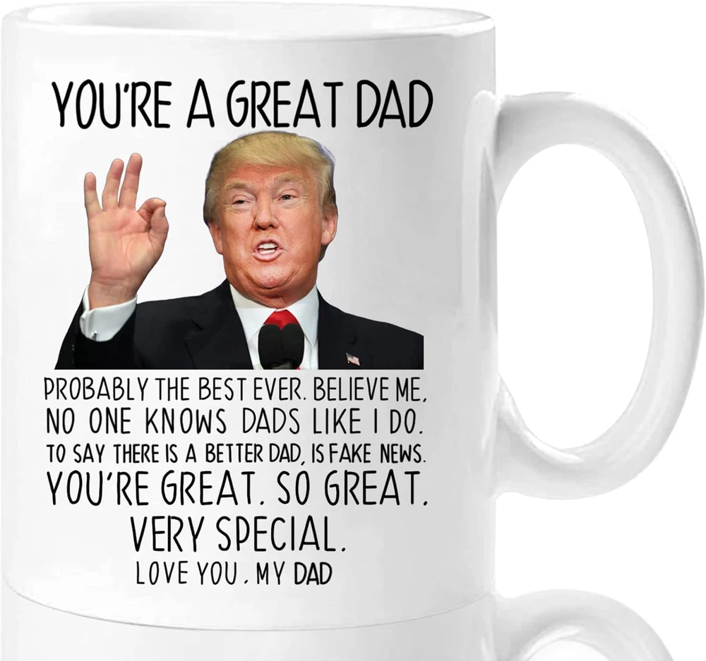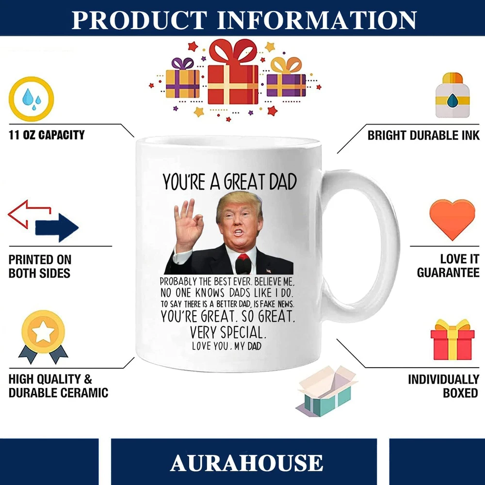 Store New Arrivals Add to Favorite View Feedback Contact You're a Great Dad Coffee Mug Ceramic Cup White 11Oz Gag Gift for Dad Trump Description Item model number QDMKB0SJX031 Style Dad Number of Items 1 Pattern Letter Print Country of Origin China Theme Dad, Funny Cartoon Character Dad Unit Count 1.0 Count Material Ceramic Capacity 11 ounces Product Dimensions 3.1"W x 3.8"H Package Type Protective Foam Inserts Age Range (Description) Adult Item Weight 0.77 Pounds Finish Type Glossy Specific Uses For Product Cold Drinks, Hot Drinks Reusability Reusable Included Components Handle Item Weight 12.3 ounces Material Feature Thermal Insulation, Durable Special Feature Microwave Safe Shape Round Recommended Uses For Product Travel, Home Material Type Free Cadmium Free Product Care Instructions Microwave Safe Size 1 Count (Pack of 1) 【Great Dad Mug Gift】It's a perfect gift for dad/stepfather from daughter and son. Great dad coffee mug, surprise him on his birthday, Father's Day or any holiday, and let him know that he is the best father in the world. 【Best Gifts for Dad】Ideal as a Christmas, birthday, Father's Day, retirement gift for dad. Our Aurahouse dad mug is undoubtedly the best gift for father. Please use our mug to convey your joy and touch! 【Funny Dad Mug】Each Great dad coffee mug has the design printed on both sides of the funny patten with "You're A Great Dad". Made of lead-free, cadmium-free, high quality strong ceramic. Suitable for hot and cold drinks. 【Useful Design for Dad】Comfortable C-handle, superb for lefties or righties. Smooth cup surface is easy to clean, 11 oz. capacity for daily needs. Each mug is packed in an individual carton. 【Satisfied Customer Service】Each mug is packaged in an individual gift carton and wrapped in polystyrene foam to ensure the product reaches the recipient in perfect condition; If you have any concerns, we'll be there to assist you promptly Product Description You're A Great Dad! Celebrate the awesomeness of your dad with our 11 oz white coffee mug, featuring a side-splitting design that's bound to bring laughter and joy to your cherished moments together. 11 Oz. Dad Mug. "Love you, my Dad." Witty and playful text is printed on both sides, making each sip a delightful moment of humor and affection. This mug is the perfect blend of laughter and love, making it an ideal gift for birthdays, Father's Day, Christmas or any occasion you want to express your admiration. Practical and Useful Dad Mug. A Gift to Make Dad Smile. Whether he's enjoying his morning coffee, sipping tea, or indulging in a favorite hot beverage, this mug will remind him of the unique bond you share. Surprise for Dad. Add fun to life with this mug, and whoever sees this mug can trigger a smile. This will be the perfect gift for dad. ABOUT US We offer the best prices around on high quality products. Our E-store includes media such as books, movies, music and games while offering electronics, toys, sporting apparel, clothing, tools, general home, garden items and more. SHIPPING We are always working hard to ensure your package arrives as soon as possible. Please understand that some factors like weather, high postal traffic, and the performance of shipping companies are outside of our control. We offer free shipping to the lower 48 states and ship within 2 business days of payment, usually sooner. We do not accept P.O. Boxes. Please provide a physical address. RETURNS We offer a 30-Day Return Policy on items which you are not completely satisfied with. You have the option for a full-refund or an exchange of the item. No returns are available on items shipped outside of the USA. PAYMENT We accept PayPal. CONTACT US This page content is yet to come Please ad us to your favorite seller and visit again later Thank You CUSTOMER SATISFACTION We try our very best to make sure every customer is completely satisfied. If there's a problem, message us! We're happy to help.