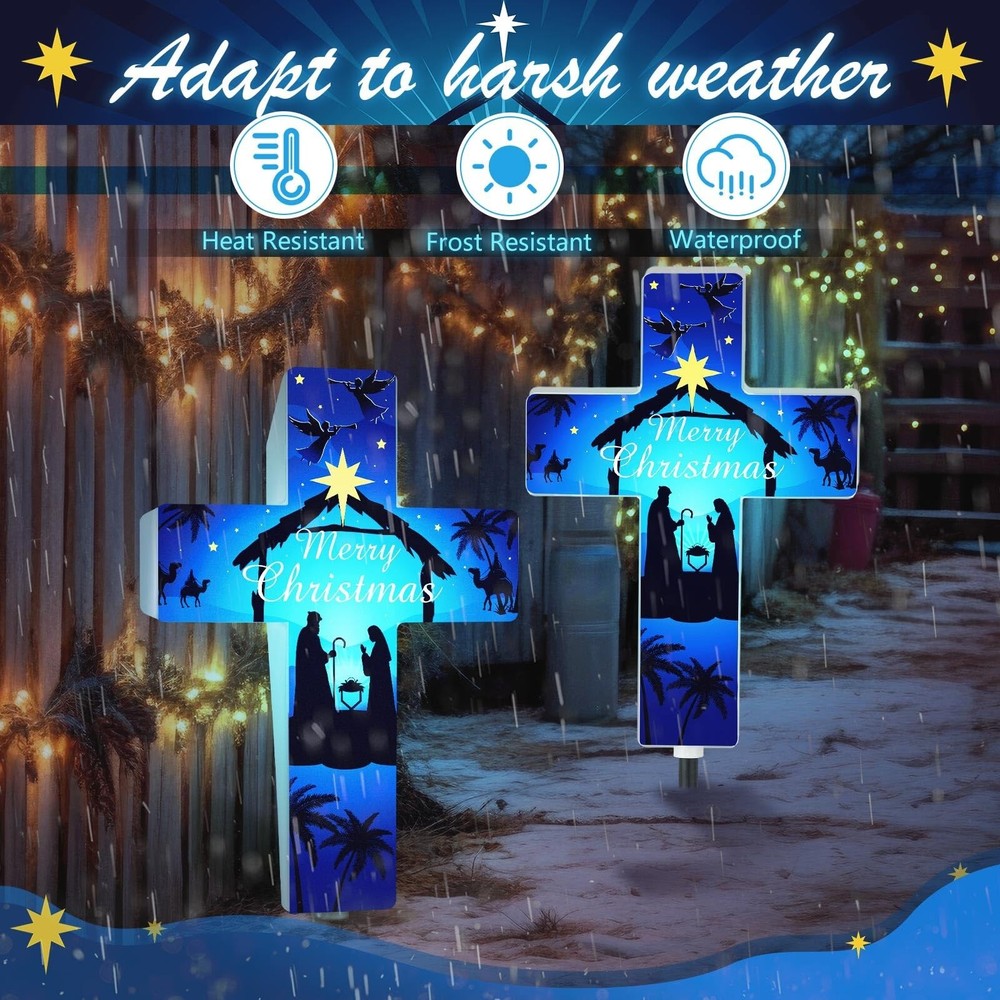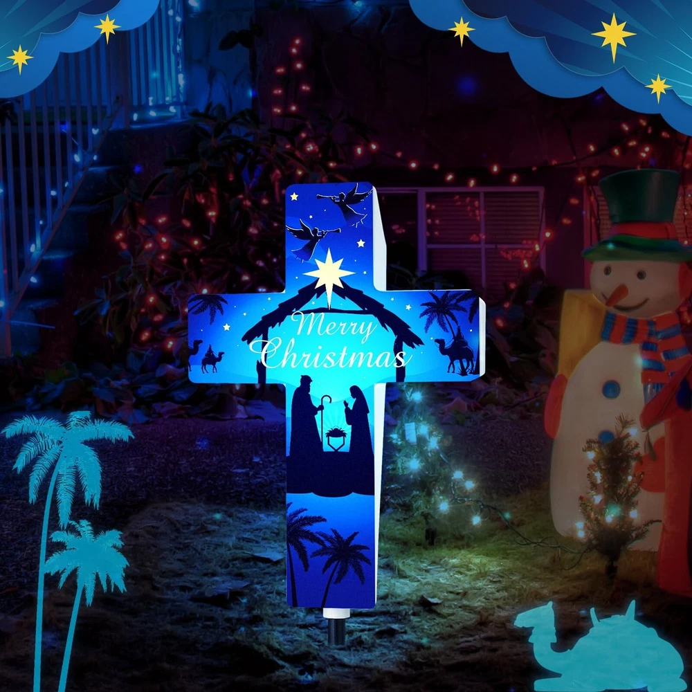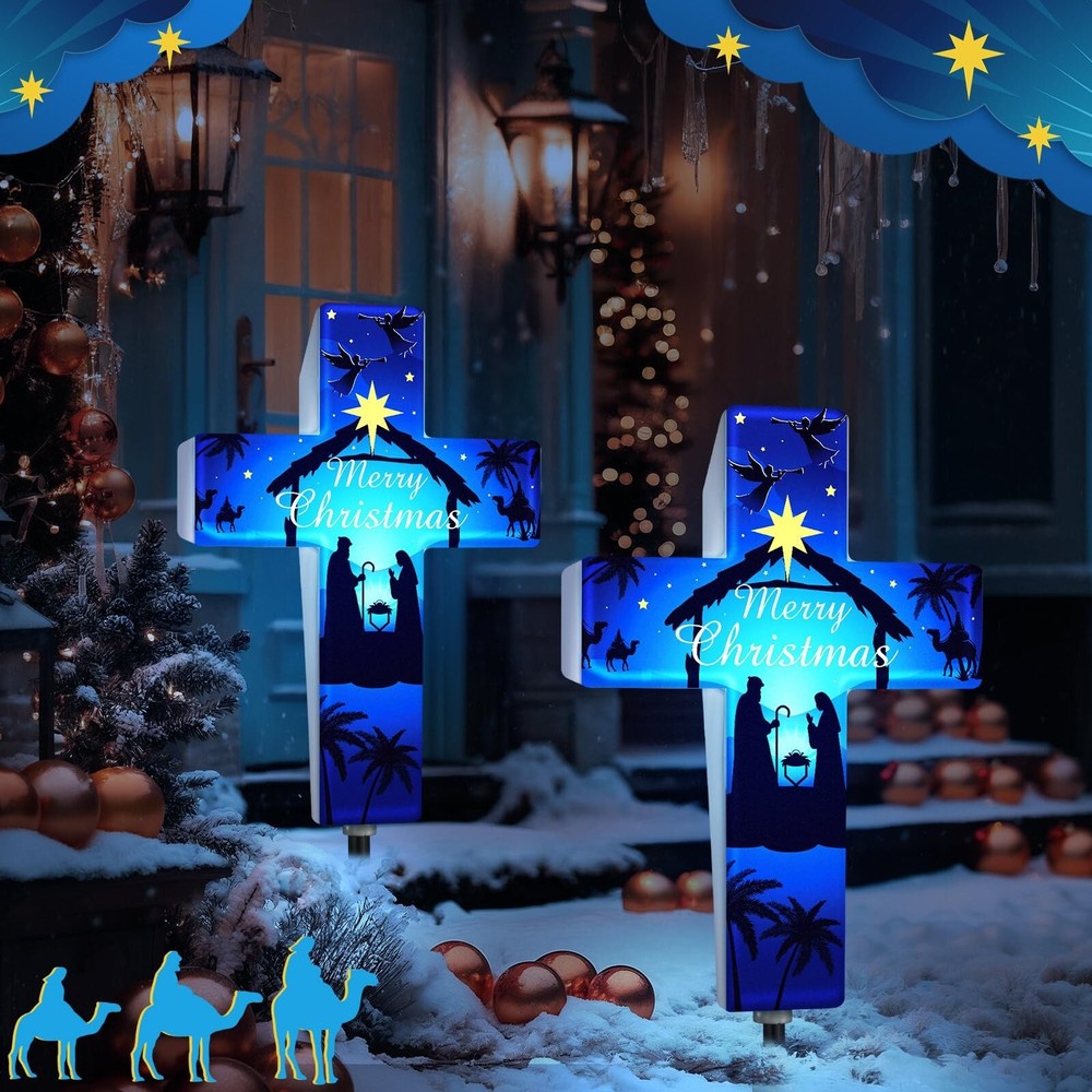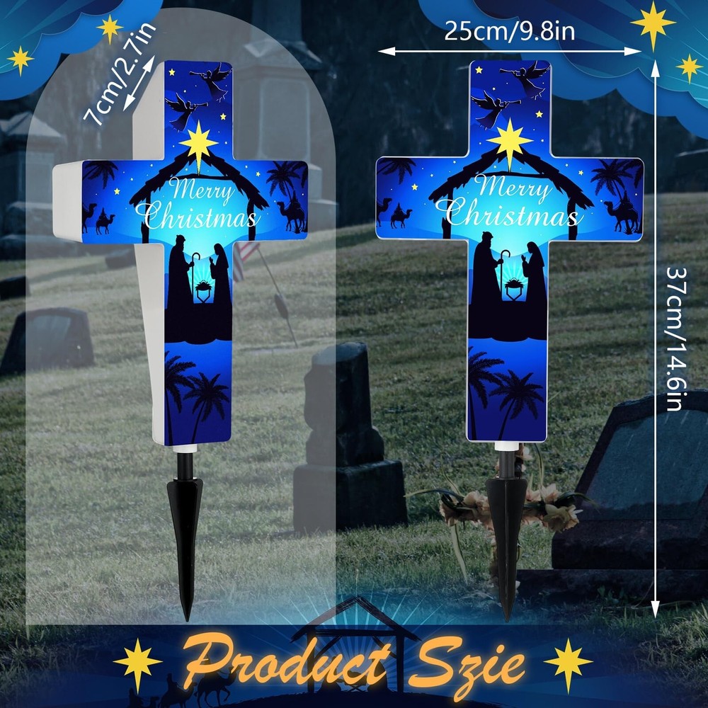 Yousoontic Christmas Garden Stake Solar Lighted Nativity Scene Outdoor Solar Religious Yard Decorations Light up Rustic Holy Night Cross Stake Decor for Christmas Outside Patio Yard Decoration Product Details Color: blue, black Brand: Yousoontic Material: Resin Theme: Christmas Frame Material: Resin Light Color: Warm White Recommended Uses For Product: Cemetery decoration, roadside memorials, flower arrangements, garden decoration, graveside decor, landscaping, walkway lighting, yard decoration Manufacturer: Yousoontic Number of Items: 1 Part Number: TAT-Yousoontic-0471 Item Weight: 1.19 pounds Package Dimensions: 14.7 x 10.48 x 2.92 inches Country of Origin: China Item model number: TAT-Yousoontic-0471 Size: 13.78 x 9.84 x 2.95 inches Style: Nativity Power Source: Solar Powered Item Package Quantity: 1 Included Components: 1 x Memorial solar stake cross Batteries Required?: No Date First Available: May 24, 2024 Cross Solar Decoration: unique cross shape solar pile decoration, this nativity theme solar cross is designed with a classic cardinal pattern, and when night falls, the light automatically lights up, bringing a peaceful atmosphere Easy to Use: the cemetery grave decor has a switch on the back to turn the power on and off; It is solar operated and the panels are located on the back of the cross; When the sunset, the lights go out and then come on after sunset; Just make sure to turn on the power Reliable Product: this beautiful cemetery decoration is made of reliable and weather resistant plastic that can withstand various weather conditions and is sturdy and durable; Can be applied for cemetery decoration, roadside commemoration, and flower arrangement; Very suitable for streetlights and buried lights, very suitable for gardens, graves, flower beds, landscapes, sidewalks Right Size: measuring about 14.6 x 9.8 x 2.7 inches/ 37 x 25 x 7 cm, this solar operated nativity theme graveside decor is a garden accessory that works well in many spaces; Lay flat on the garden floor, landscape or patio or yard; You can also lean against a tree or flower pot Meaningful symbol: the yard decor is more than a simple form; It is a powerful representation of faith, sacrifice, and love; Our cross underscores this, serving as a vibrant beacon of faith; It radiates warm, astonishing lights, making your yard standout; The spiritual resonance of the cross makes it a fitting tribute, remembering the love and sacrifices of those we miss