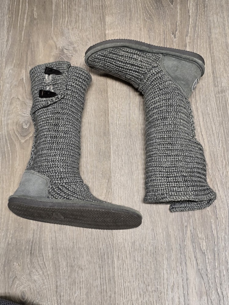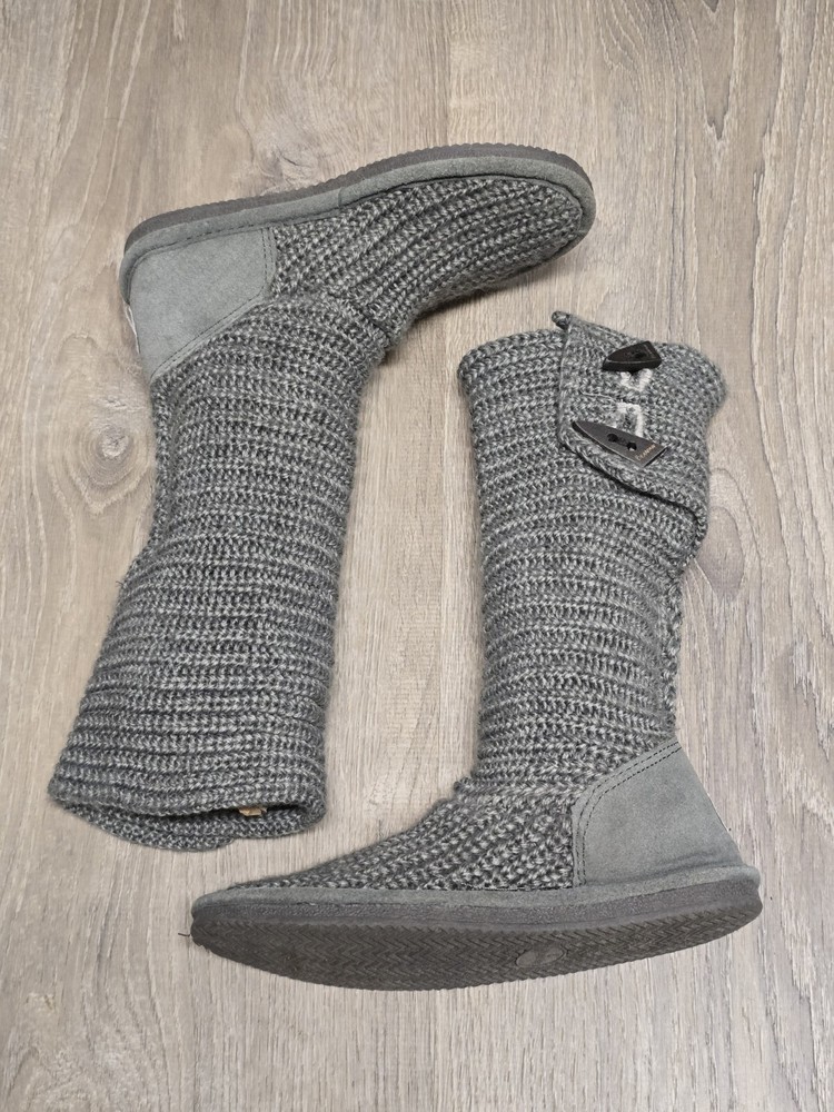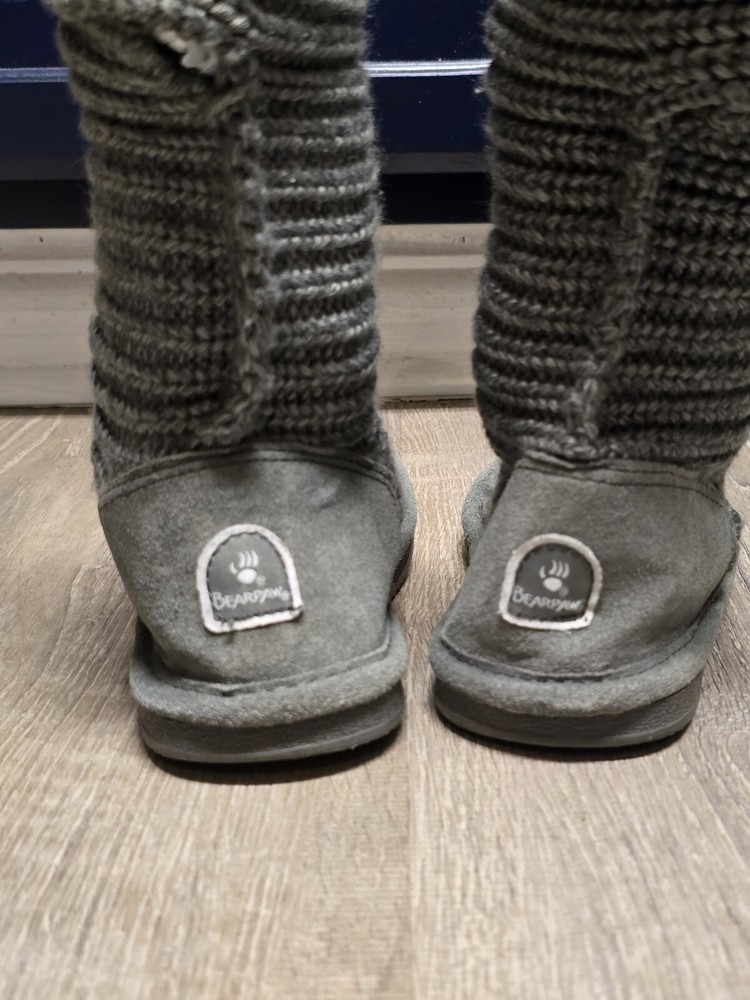 Keep your little girl cozy and stylish this winter with these Bearpaw slip-on boots. The knit sheepskin material provides both warmth and comfort, while the cushioned insole ensures a comfortable fit. These boots are perfect for colder weather, and their versatile gray color makes them easy to pair with any outfit. The boots come in a youth size US 3, UK 2, and EU 34, and feature a pull-on closure for easy wear. They are also available in a tall or short version, depending on your preference.