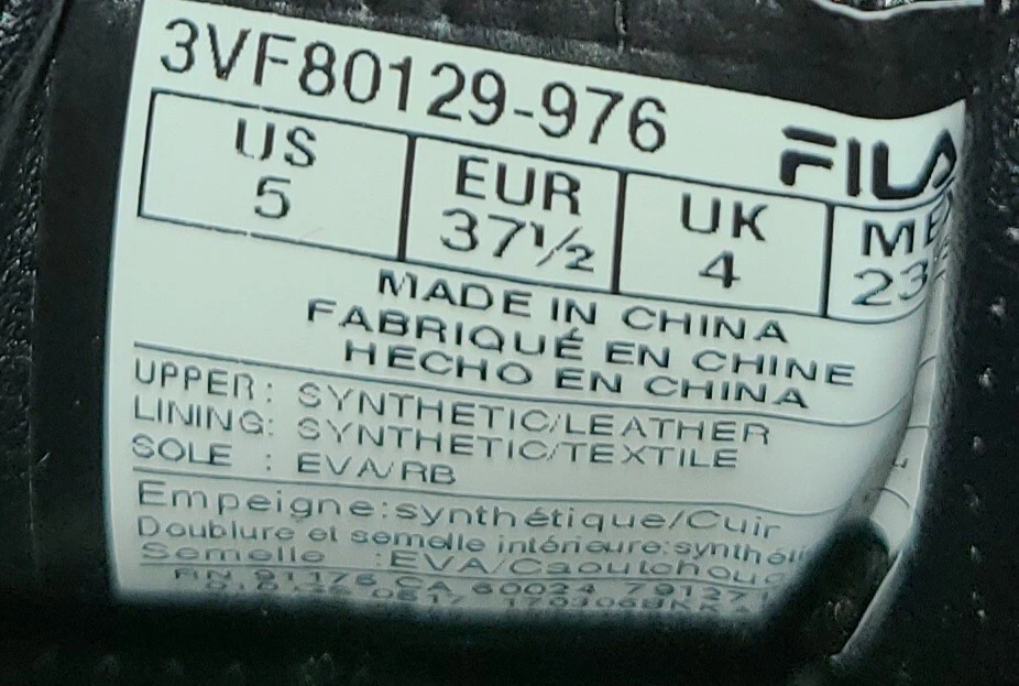 EU Shoe Size: 37.5 Brand: FILA Shoe Width: Standard Department: Boys Closure: Lace Up Color: Black Toe Shape: Round Toe US Shoe Size: 5 Shoe Shaft Style: Low Top Pattern: Solid UK Shoe Size: 4 Type: Athletic Upper Material: Faux Leather Style: Sneaker