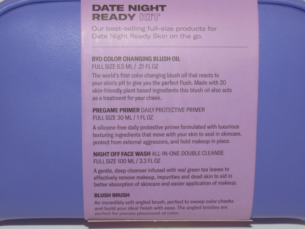 Brand new and authentic- 5 piece full-size Youthforia Date Night Ready Kit. Includes: - Night Off, face cleanser, 3.3 ounces - Pregame Primer, daily protective primer, 1 ounce - BYO Color Changing Blush Oil, Chemical Reaction, .21 ounce - Soft Angled Blush Brush - Purple faux-leather cosmetics bag - A $124 value Fast and free shipping!