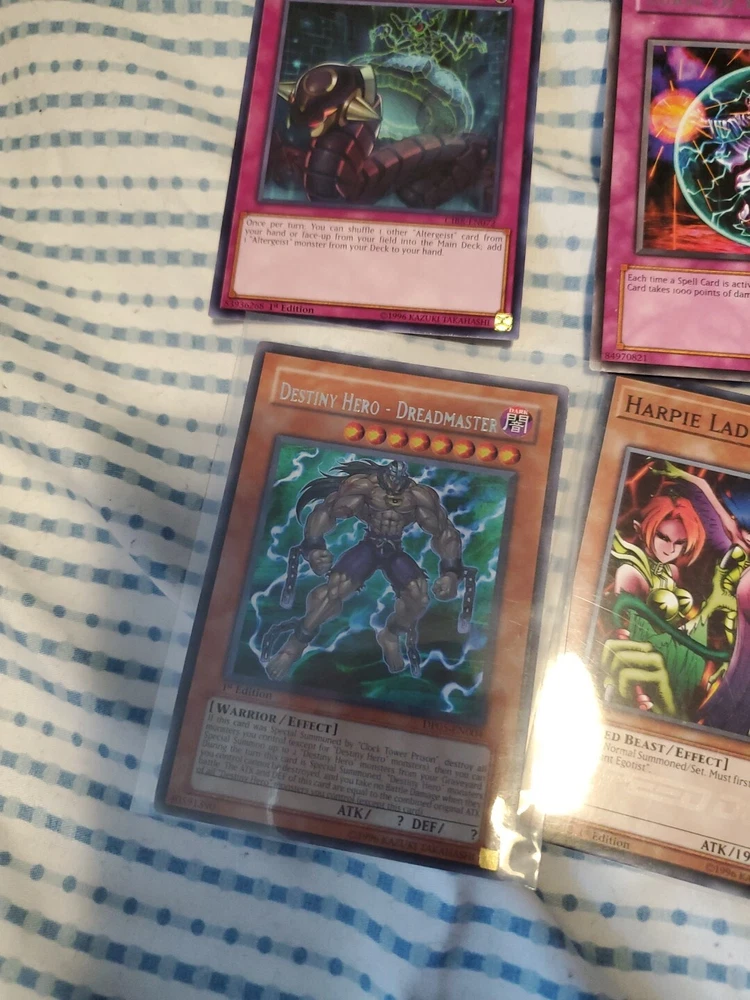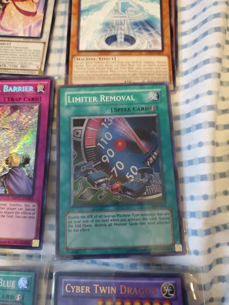 This Yu-Gi-Oh! card lot includes 13 pieces with a guide. The set features the winged dragon of ra foolish burial goods shiranui su saga cyber pharos personal spoofing curse of dark ess dimensional barrier limiter removal destiny hero dreadmaster harpie lady sisters rage with eyes of blue cyber twin dragons in English language and includes effect, normal, and spell cards. The cards are from the Yugi set and are suitable for players aged 13 and above. The cards have a holo finish and are perfect for collectors and players alike. Get your hands on this amazing card lot today!