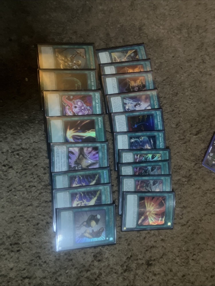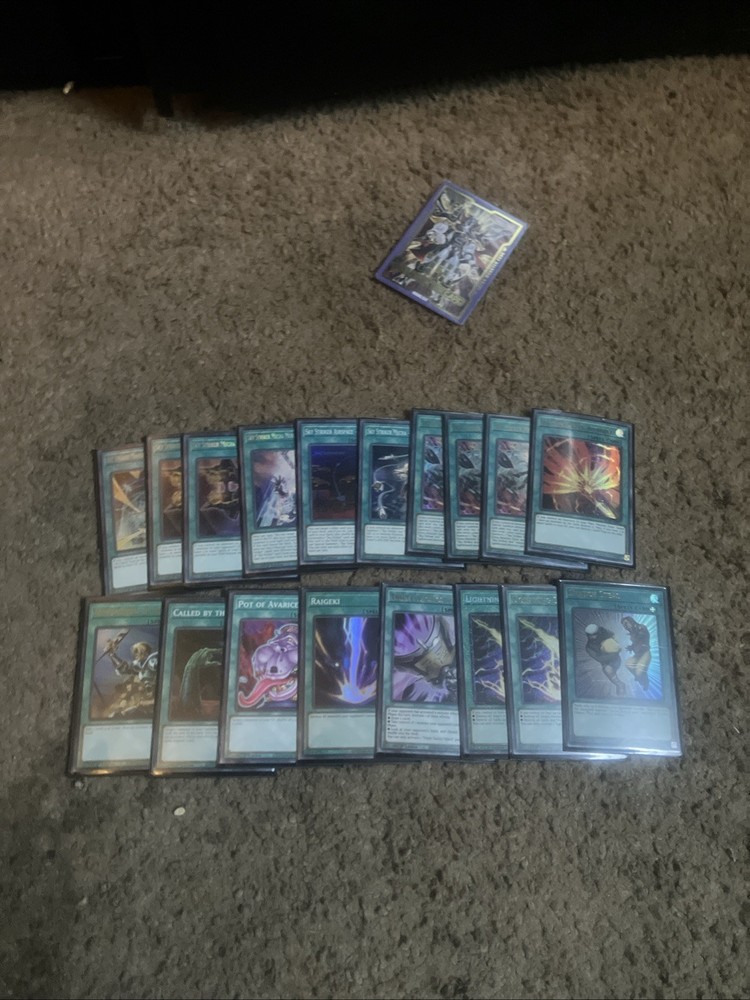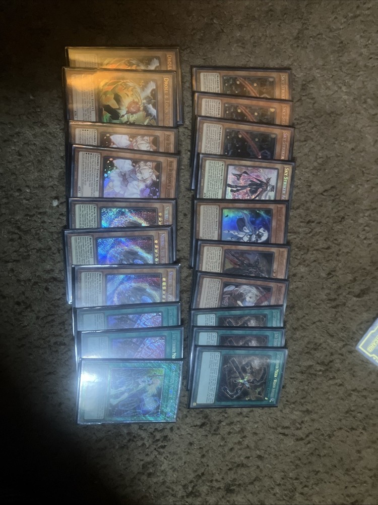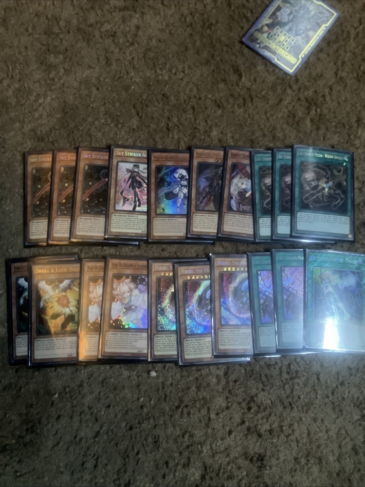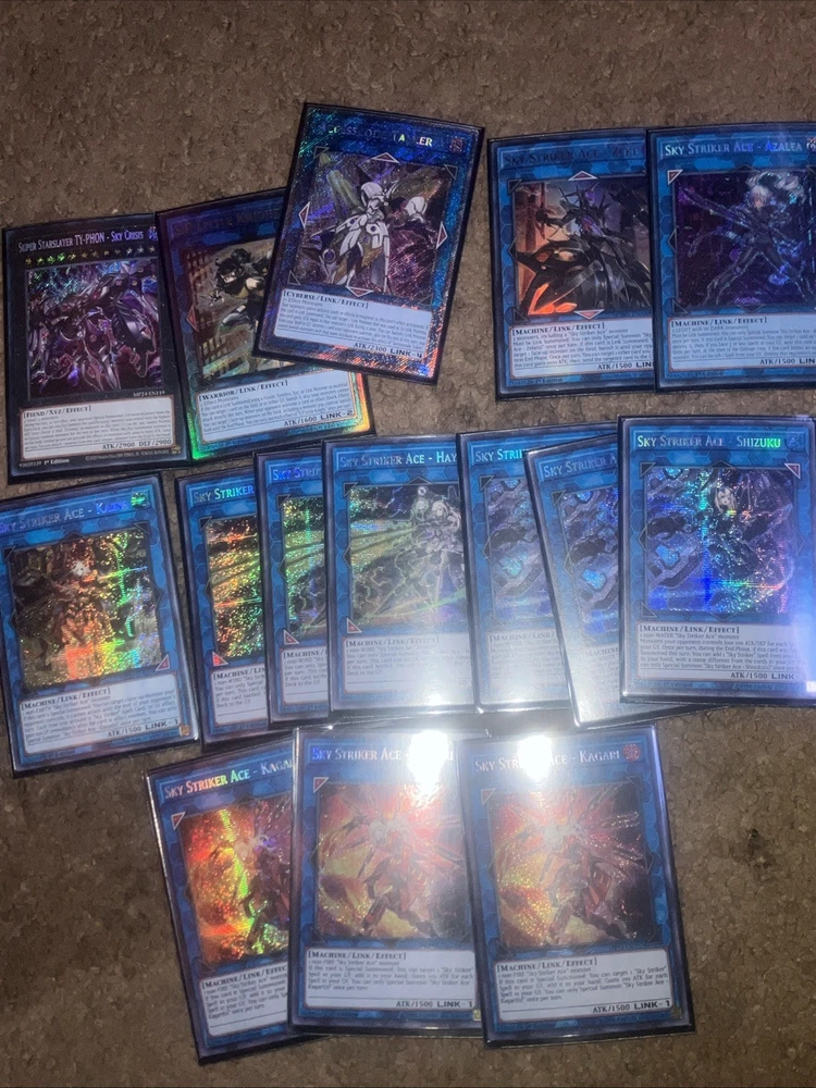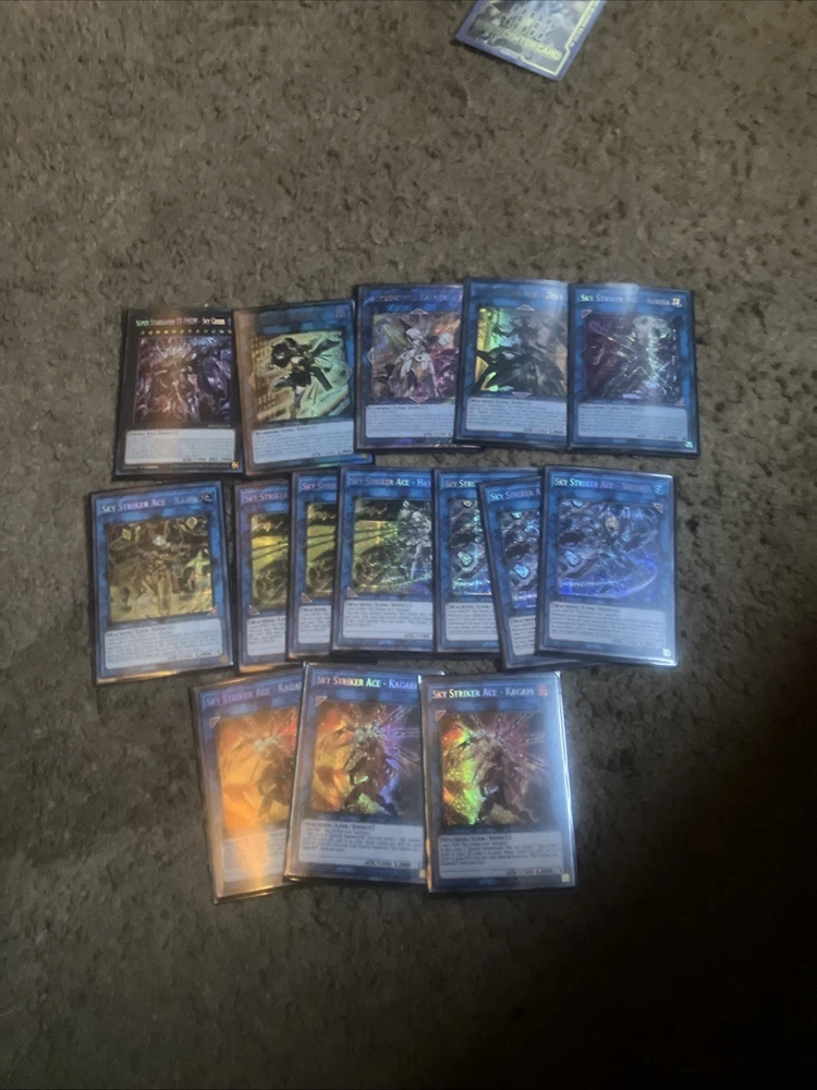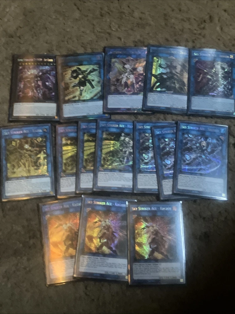 Here is my competition Deck for yugioh- Sky Striker all cards are in mint condition” “Double Sleeved” I didn’t go cheap for these cards. They have a bunch of secret rares and are very taken care of with my own heart. If you have any questions please reach out to me.