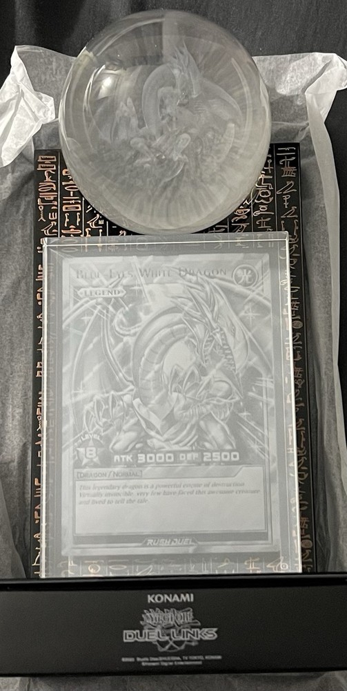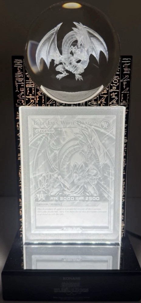 This is an extremely rare Yu-Gi-Oh! DUEL LINKS 8th Anniversary Blue-Eyes White Dragon Crystal Card, one of only 50 in existence worldwide. This exclusive collector’s piece was specially crafted by KONAMI to commemorate the game’s anniversary and was never made available for retail purchase, making it one of the most sought-after Yu-Gi-Oh! collectibles ever released. The crystal card features a stunning 3D-etched rendering of the legendary Blue-Eyes White Dragon, Seto Kaiba’s signature monster, intricately engraved into high-quality crystal. When placed on its frosted acrylic base, the LED illumination enhances the design, making the dragon appear as though it is emerging from the depths of the crystal itself. This creates a breathtaking display that will elevate any Yu-Gi-Oh! collection. This item is in brand-new condition, carefully stored and preserved since its acquisition. It comes with its original protective packaging, ensuring it remains in pristine condition for both display and investment purposes. The authenticity of this piece is guaranteed as an official KONAMI release, a true testament to its exclusivity and value. Given its extreme rarity and high demand, this is a once-in-a-lifetime opportunity for serious collectors to own a piece of Yu-Gi-Oh! history. Shipping will be handled with the utmost care, and tracking will be provided to ensure safe delivery. International buyers are welcome. Due to the rarity of this item, only serious inquiries will be considered. All sales are final and no refunds or returns are accepted.