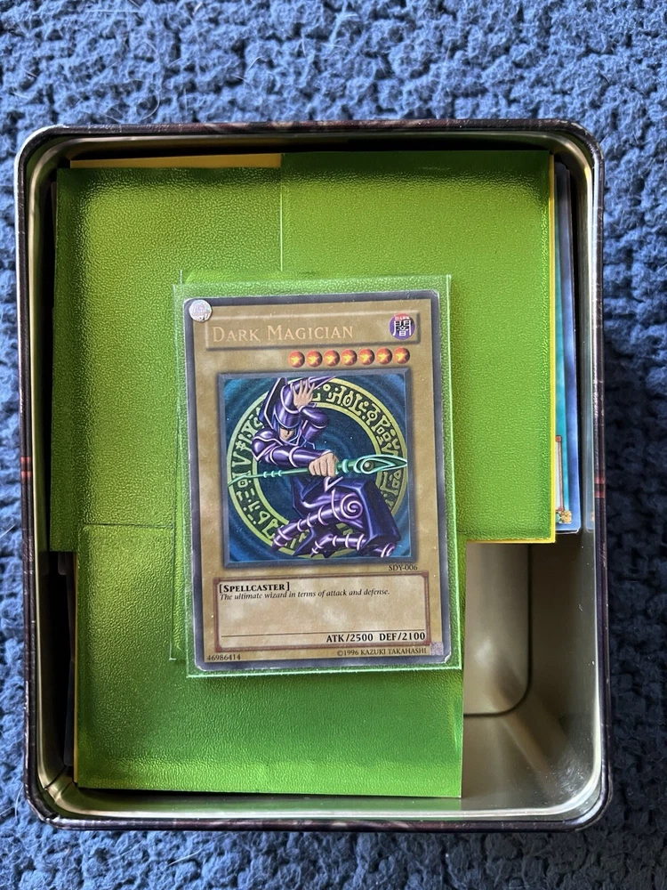 Yu-Gi-Oh Limited Edition Tin Good Condition, some scratches 2 Figures. 1 Monster and 1 Duelist Over 300 Common cards 20 Rare Cards 8 Super Rare Cards 4 Ultra Rare Cards 2 Secret Rare Cards 1 Gold Rare Card 1 Dark Magician SDY-006 Good Conditions on most cards, lightly used