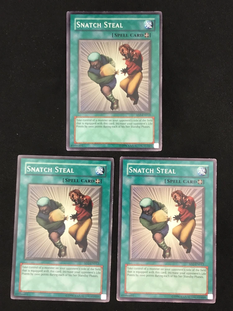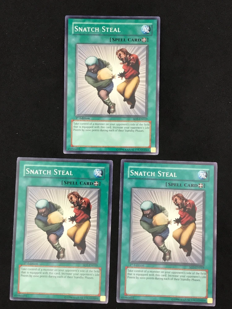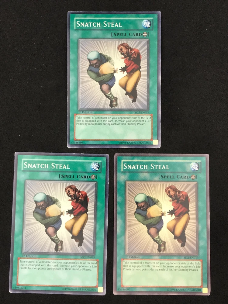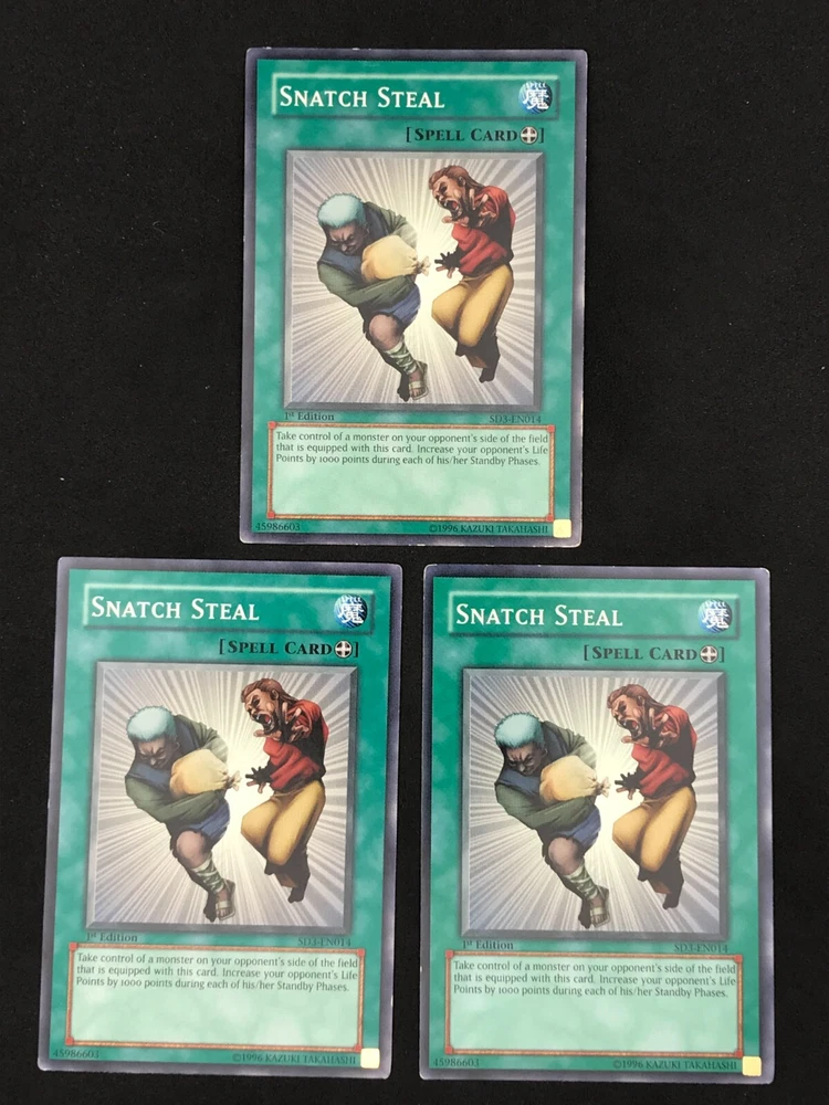 Listing is for a playset of 3x Snatch Steal YuGiOh cards. Th e condition and edition of the playset is specified in the drop down list. The pictures associated with the selection in the drop down list are of the actual cards you will receive. Condition of the card is as pictured. Card will ship in a plain white envelope via Ebay Standard Envelope service. Additional cards ship free when purchased at the same time using the cart feature. The cards must be purchased at the same time and not individually for the shipping discount to be automatically applied. Shipping by Bubble Mailer using USPS Ground Advantage is also available under shipping options for an additional charge. International Buyers - I use the eBay International Shipping Program for international shipments. The international portion of the shipment is handled by eBay and the shipping price is set by eBay. I have no control over the shipping price they set.
