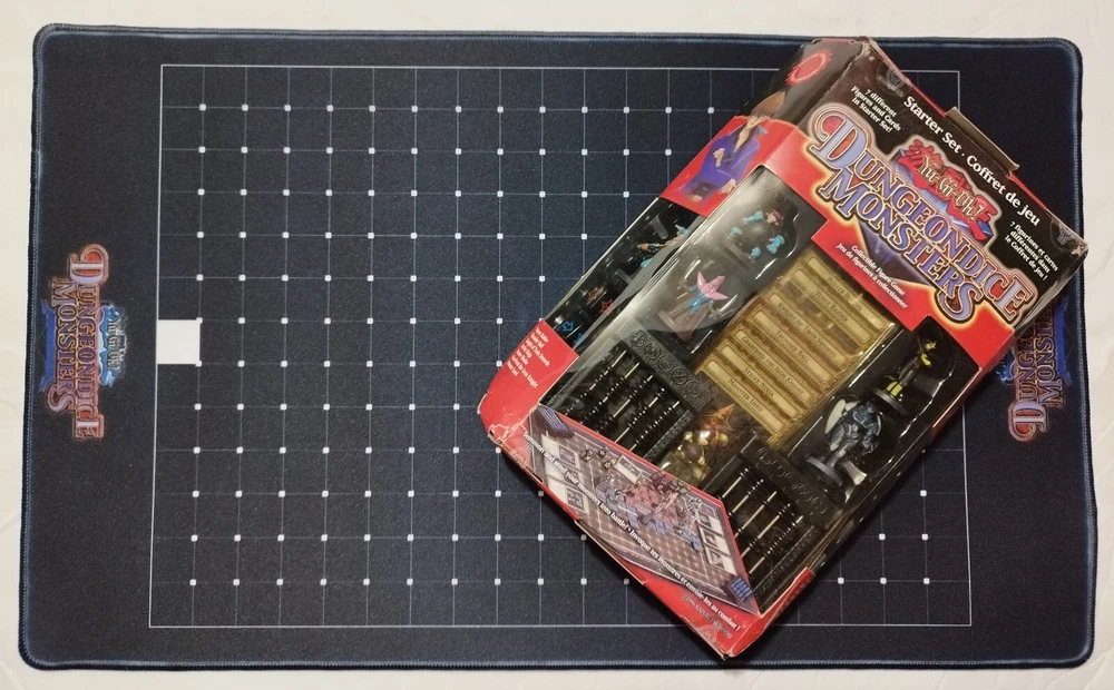 Playmat custom with stitched edges Description: -Rubber Playmat -Rounded corners -Stitched edges -Size: 23.22 x 15.35 / 59 x 35 cm -Thickness: 3mm The set is complete and still sealed, but the box is damaged by the age This is a Korean reprint, all components are in English, but the quality of figure´s picture is lower than mattel. if you love thes game is a great oportunity to got it!