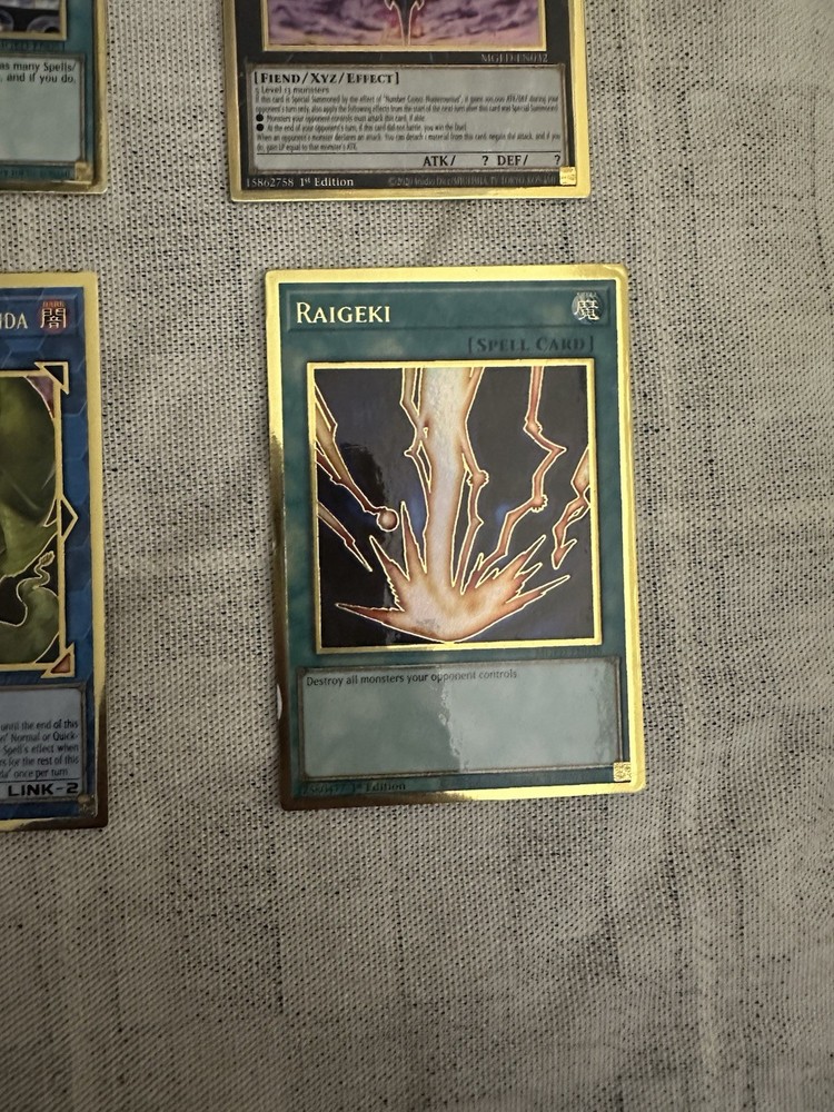 Yugioh collection of over 700 cards. NOT JUST BULK! This was my personal collection when I tried to get back into the game a few years ago and just didn’t stick with it. Perfect for anyone just trying to add to their own collection or for someone just starting out! Almost all the cards are completely unplayed besides the structure deck. What’s included in this lot is: -Over 700 cards from different sets (heavy on the Hidden Arsenal set,2021 Tin of Ancient Battles,Legendary Duelists: Synchro Storm and a few other sets from around that time) This includes tons of foils/holos/commons/rares/super rares/ultra rares/secret rares/prismatic rares. -8 Maximum Gold: El Dorado premium gold rares The Raigeki does have a small chip in the bottom left corner. See attached picture. -Structure Deck: Albaz Strike Complete deck and 2 sided playmat. It was used by myself a handful of times but all the cards are still in excellent condition. The beginners booklet is missing from it. -2021 Tin of Ancient Battles *Empty Tin* Tin has a small dent in the corner of the lid, as shown in picture, does not effect its opening and closing. -4 sleeve packs (50 count each) 3-I.p.masquerena and 1-kuriboh dark magician