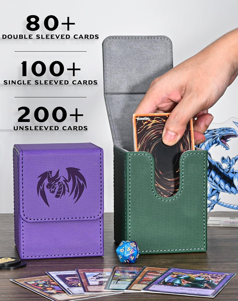 This deck box is a must-have for any TCG player! The premium PU leather feels sturdy yet sleek, and the soft interior keeps cards safe from scratches. It easily fits 100+ single-sleeved cards, and the dividers help organize multiple decks. The strong magnets keep it securely closedโno spills! Perfect for Yu-Gi-Oh, MTG, or Pokรฉmon cards. Great quality for the price!