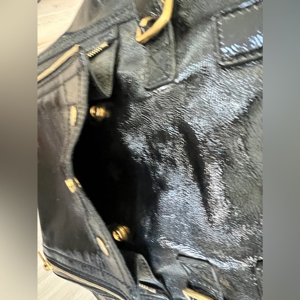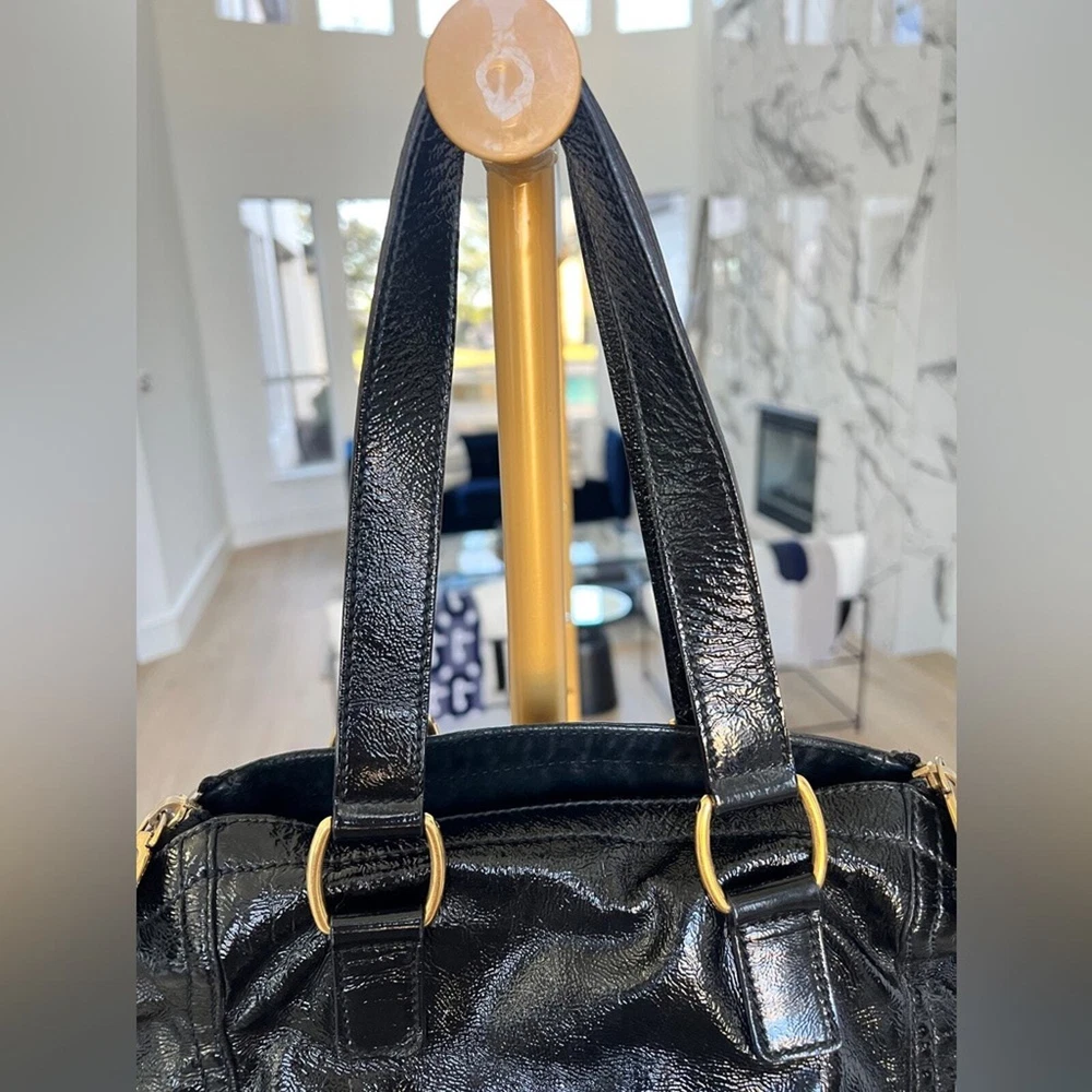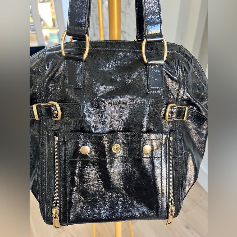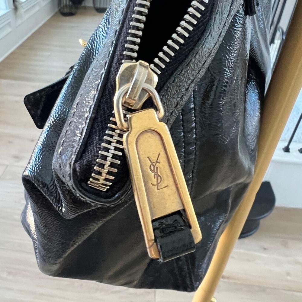 Excellent pre owned condition Authentic YSL Black Patent Clean exterior with signs of minor wear Working zippers and snap Inside has a couple spots but they are minor and it’s mostly clean Leather is in good shape Gold hardware Shoulder Strap Drop: 6.75" Handle Drop: 7" Height: 13.25" Width: 10.25" Depth: 8.75" I sell many authentic designer items on here so please see my reviews and purchase with peace of mind