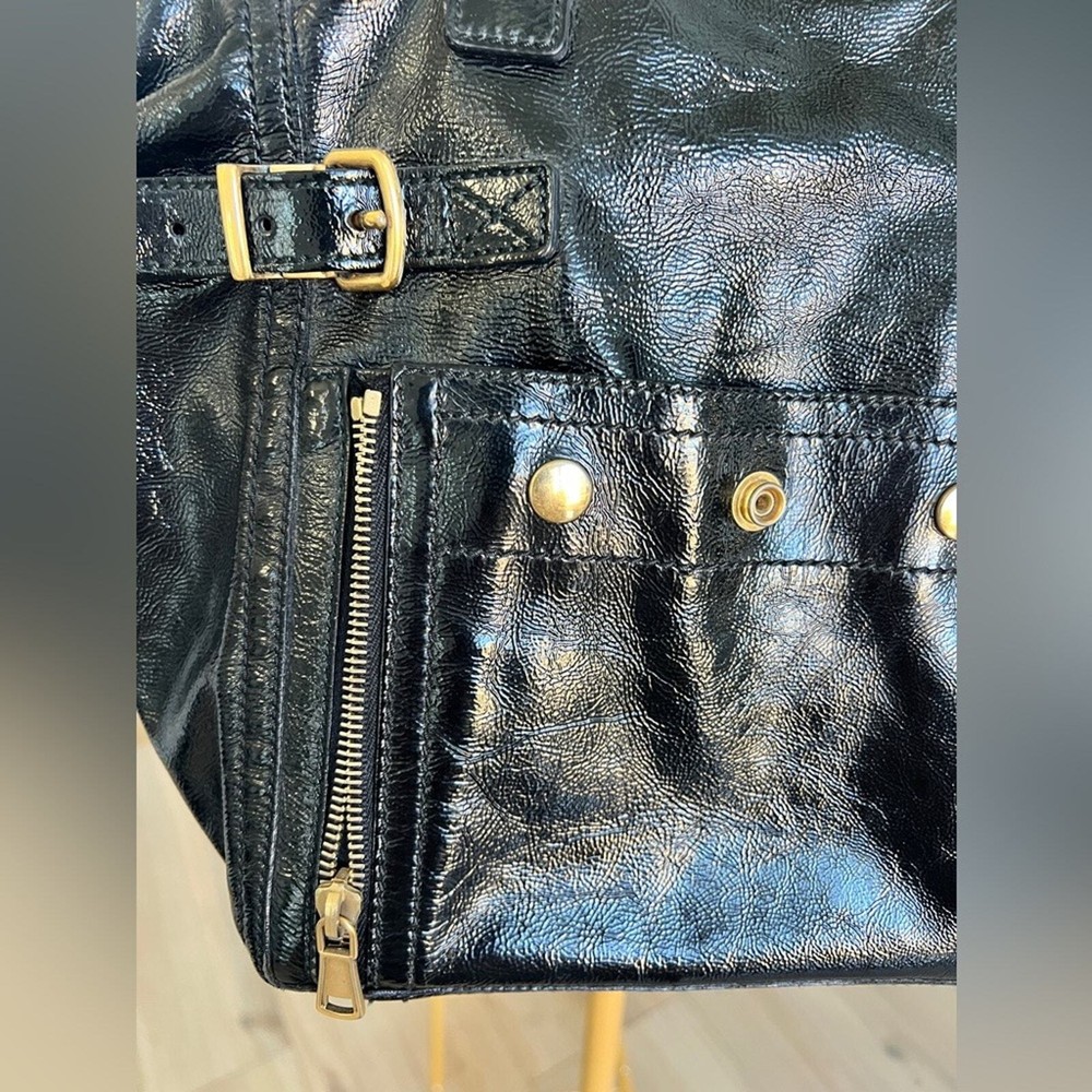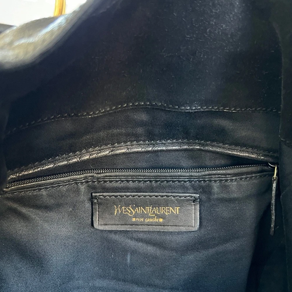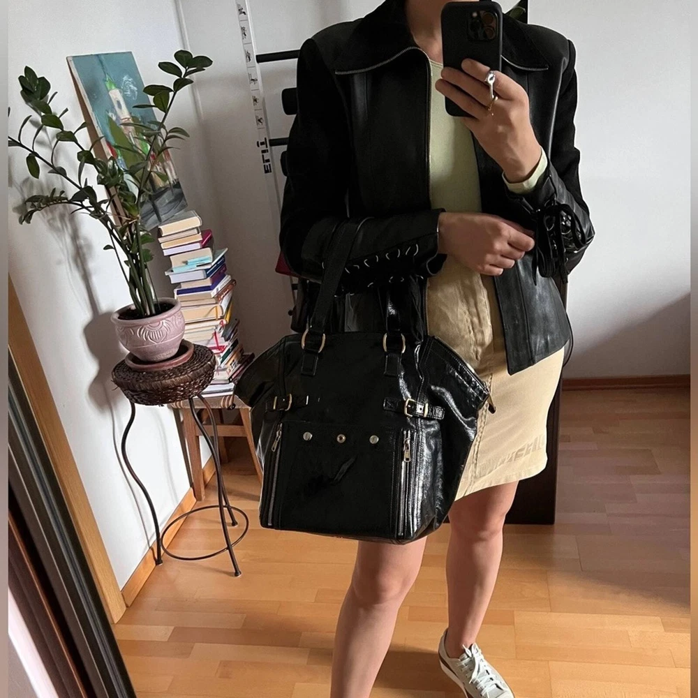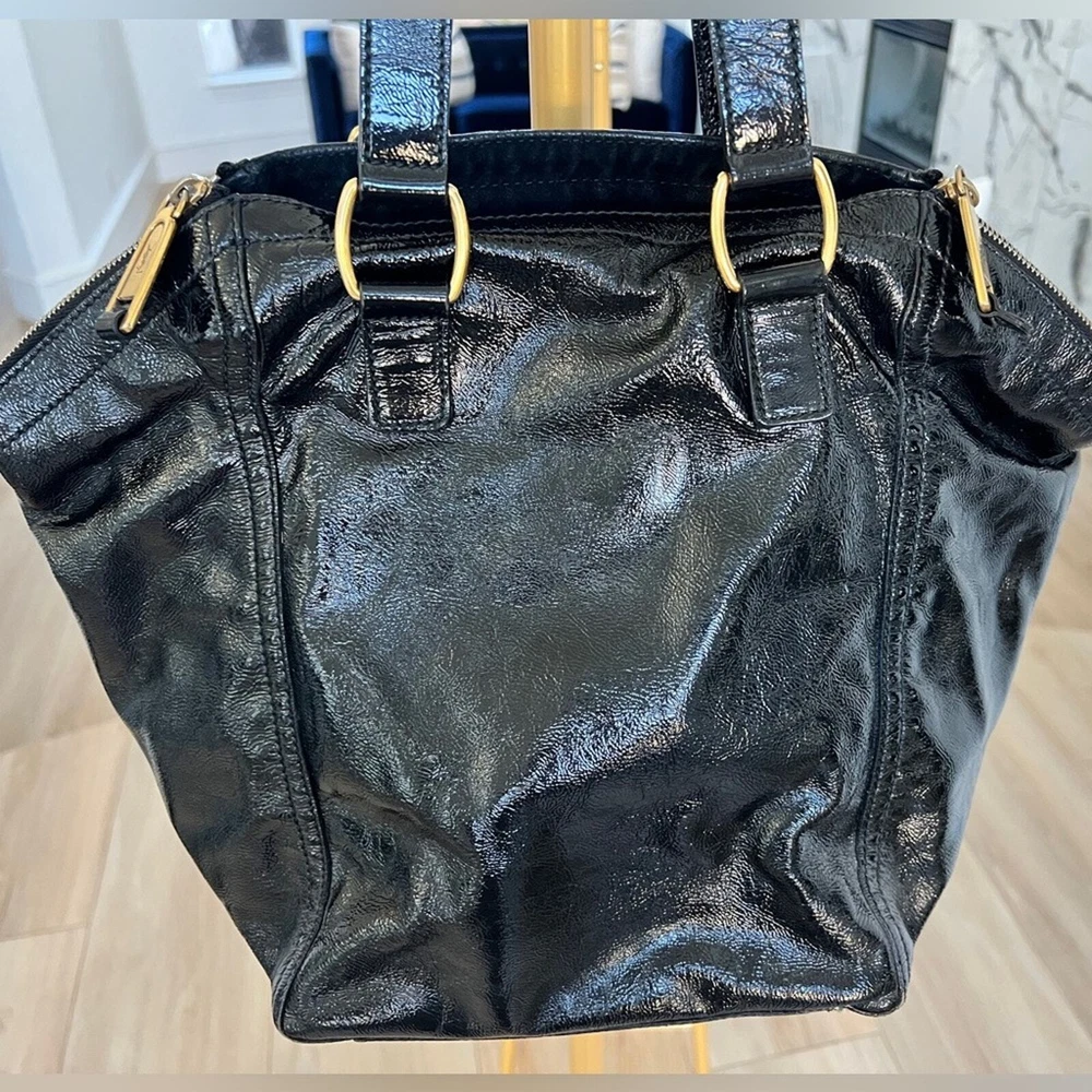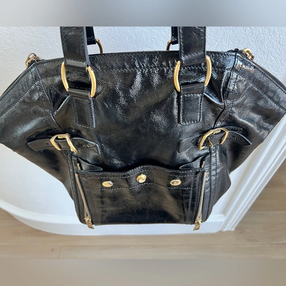 Excellent pre owned condition Authentic YSL Black Patent Clean exterior with signs of minor wear Working zippers and snap Inside has a couple spots but they are minor and it’s mostly clean Leather is in good shape Gold hardware Shoulder Strap Drop: 6.75" Handle Drop: 7" Height: 13.25" Width: 10.25" Depth: 8.75" I sell many authentic designer items on here so please see my reviews and purchase with peace of mind