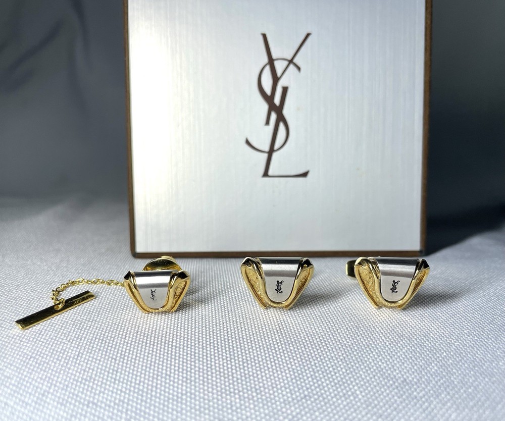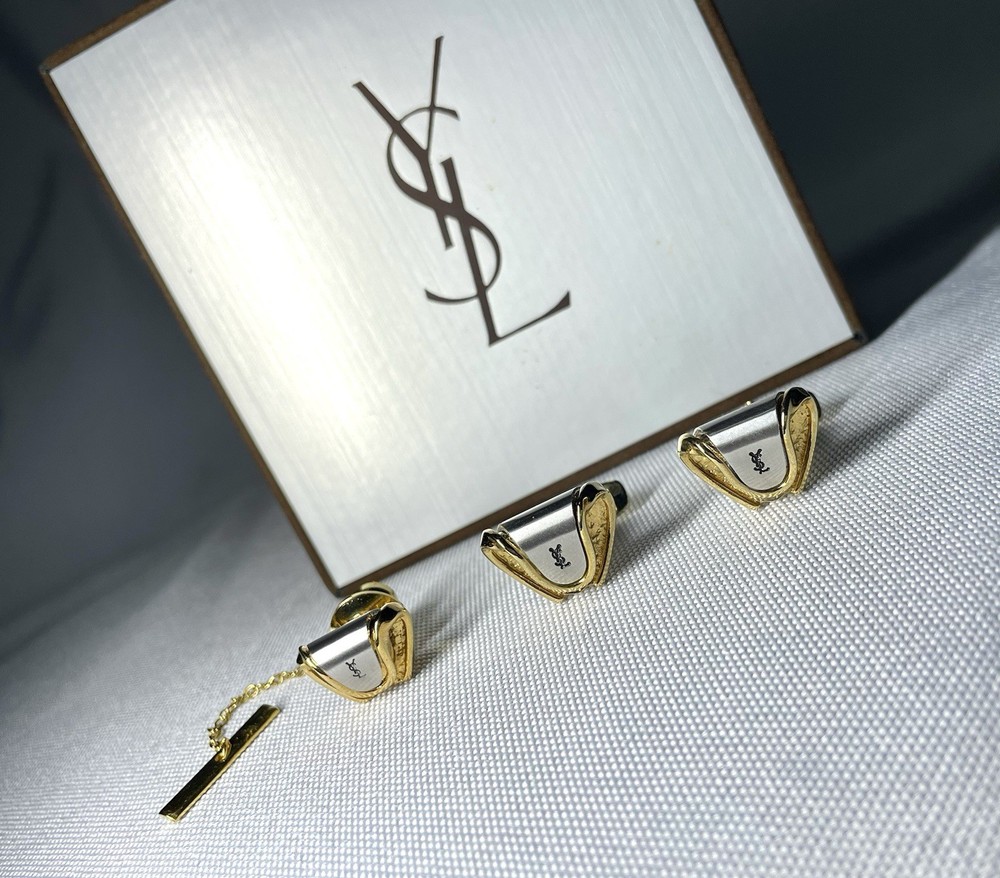 Information We cannot offer a substantial discount, such as half price, but please feel free to send us your best offer. We will consider as much as possible. It depends on the time of payment. Basically, we will ship the same day or the next day. (Shipping may be delayed due to business trips, etc., in which case we will contact you via message. I purchased this item several years ago from an online store in Japan. Yves Saint Laurent YSL logo gold x black x matte silver cufflinks titanic pin brooch set This is a rare discontinued vintage model. The three color contrasts of gold metallic, silver and black stones are eye-catching. Depending on the angle of the light, the YSL logo and black stones shine beautifully, giving off the luxurious aura of the luxury brand. This item only is suitable for a wide range of occasions from casual to dressy. A magical one-point item that will elevate your coordination. It is also a great gift for your partner or lover. Don't miss this opportunity! Shipping Depending on the time of payment,Basically, we ship the same day or the next day. (Sometimes shipping may be delayed due to business trips. In that case, we will contact you via message.) Item Descriptiont Color: Gold & Silver & Black Material: Material unknown Size: Cufflinks About 1.6cm x 1.3cm (0.629 x 0.511 inch) Weight 5g x 2 Titanic About 1.5cm x 1.2cm (0.590 x 0.472 inch) Weight 5g Condition: Beautiful Vintage There is some tarnish from age characteristic of vintage models. No noticeable damage or loose clips. Both condition and shine are good. Accessories: Genuine case (There is damage inside the genuine case.) Other accessories for Yves Saint Laurent model We also have many luxury models such as Hermes, Tiffany, Cartier, Bvlgari, Saint Laurent, Celine, Burberry, Valentino, Philippe Charriol, Montblanc, Dunhill, Versace, Givenchy, Montblanc, etc. We hope you will take a look. We take full responsibility for all items we sell. Customer feedback excellent seller. Communication went well. Even though I came to America from Japan, I was told that the product would arrive quickly and in time for my specific birthday. High quality products are also available! Highly recommended! ++++++ Great seller! They were very responsive and the product description was accurate. I strongly recommend it! This is a very popular seller and is easy to do business with. The cufflinks were mint quality. I would be happy if you could respond. Oh, and his TKU to the A+++ seller for careful packaging and safe and surprisingly fast delivery of a beautiful PC. Excited by the rich quality look and feel of the metalwork, it looks like new and is perfect in every way. His TKU to the seller was also strong and clear communication from start to finish, which led to a wonderful and positive transaction. We have received many opinions regarding the text above, so please feel free to purchase with confidence. Of course, please rest assured that all of the products we sell are genuine products. We look forward to doing business with you!