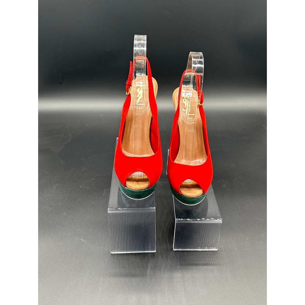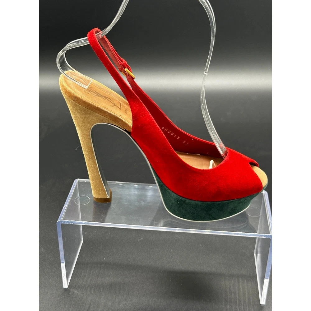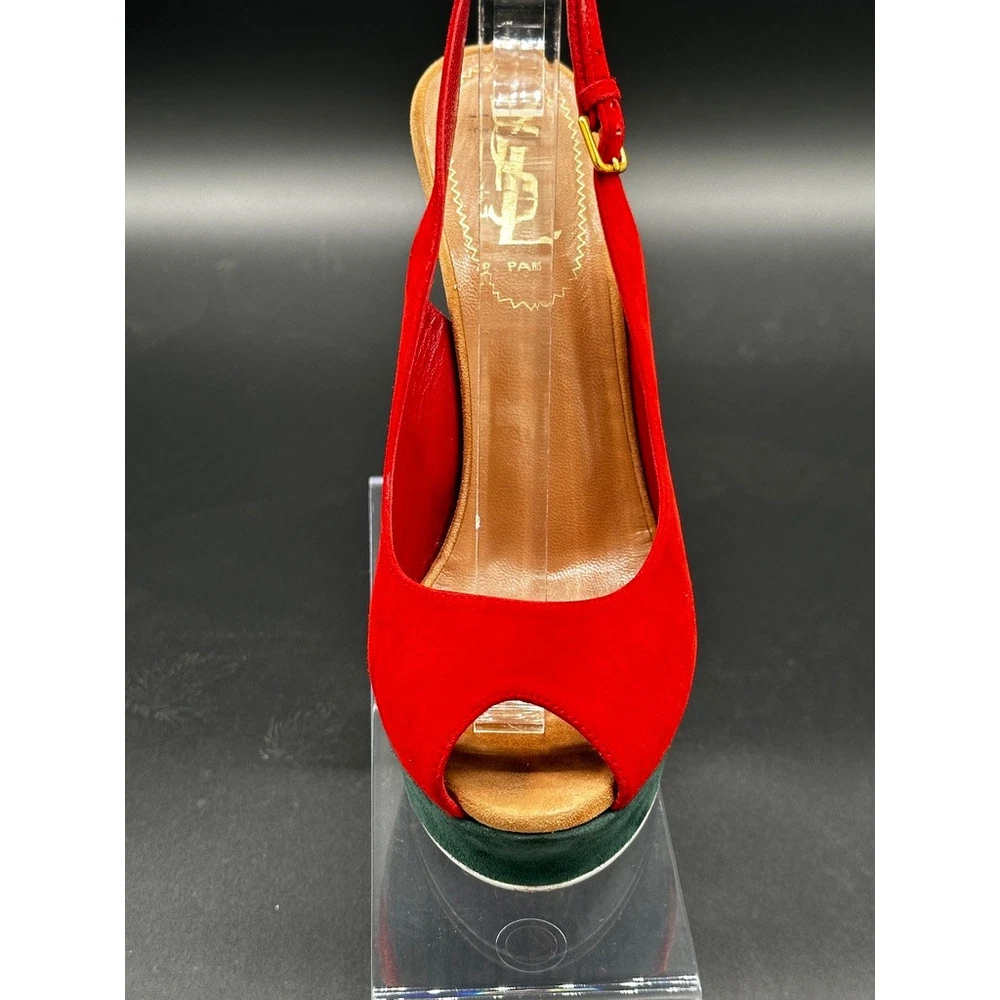 Multicolor red beige and blue suede peep toe platform pumps , sandals . In really good condition heel 5.5". Please see photos ands zoom in to see any call outs. No Box. Italy size 37