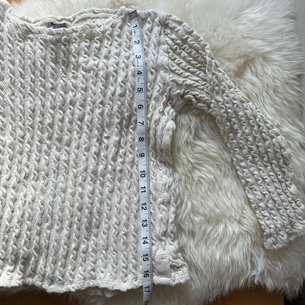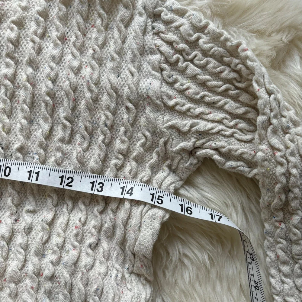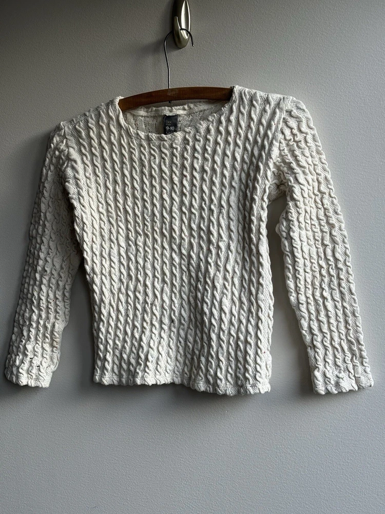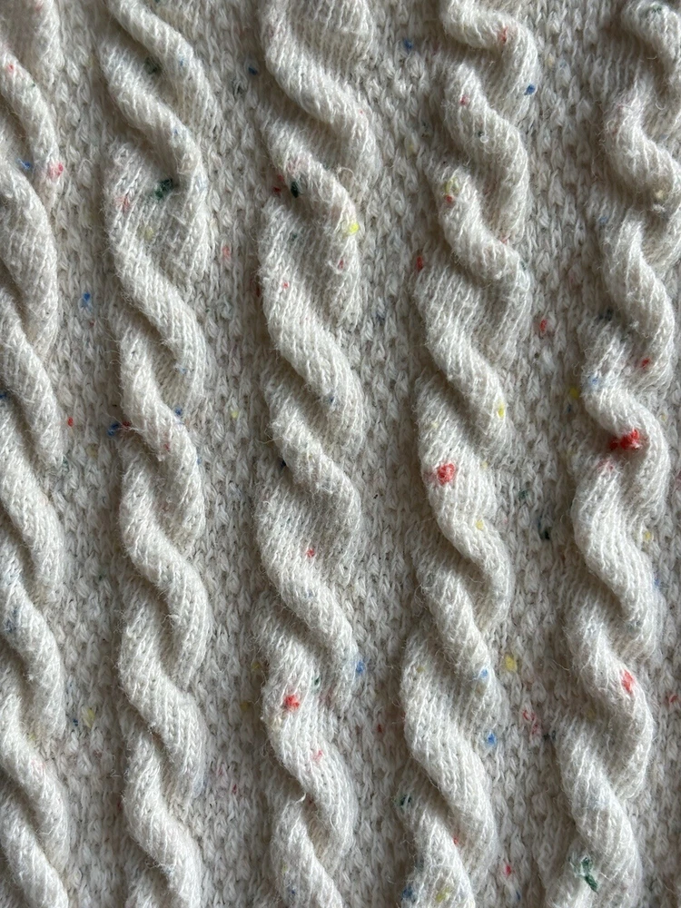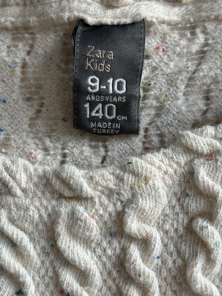 This ZARA Girls Cream Knit Boat Neck Sweater is a charming addition to any young girl's wardrobe. Featuring a cozy knit fabric with a playful cotton candy spotted flecks within pattern and delicate crochet style knitted accent. This long-sleeve pullover exudes a modern bohemian vibe. The nautical-inspired design, complete with a boat neck and fisherman details, makes it perfect for casual outings or travel adventures. Made from machine-washable 90% cotton 9% Polyester & 1% Elastic material, this vintage-inspired sweater in size 9-10 yrs is easy to care for and suitable for all seasons. Perfect for the hipster, Easter, school, or London-themed looks, this sweater is a versatile and stylish choice for any fashion-conscious girl. PLEASE NOTE: item is in good condition & has been washed