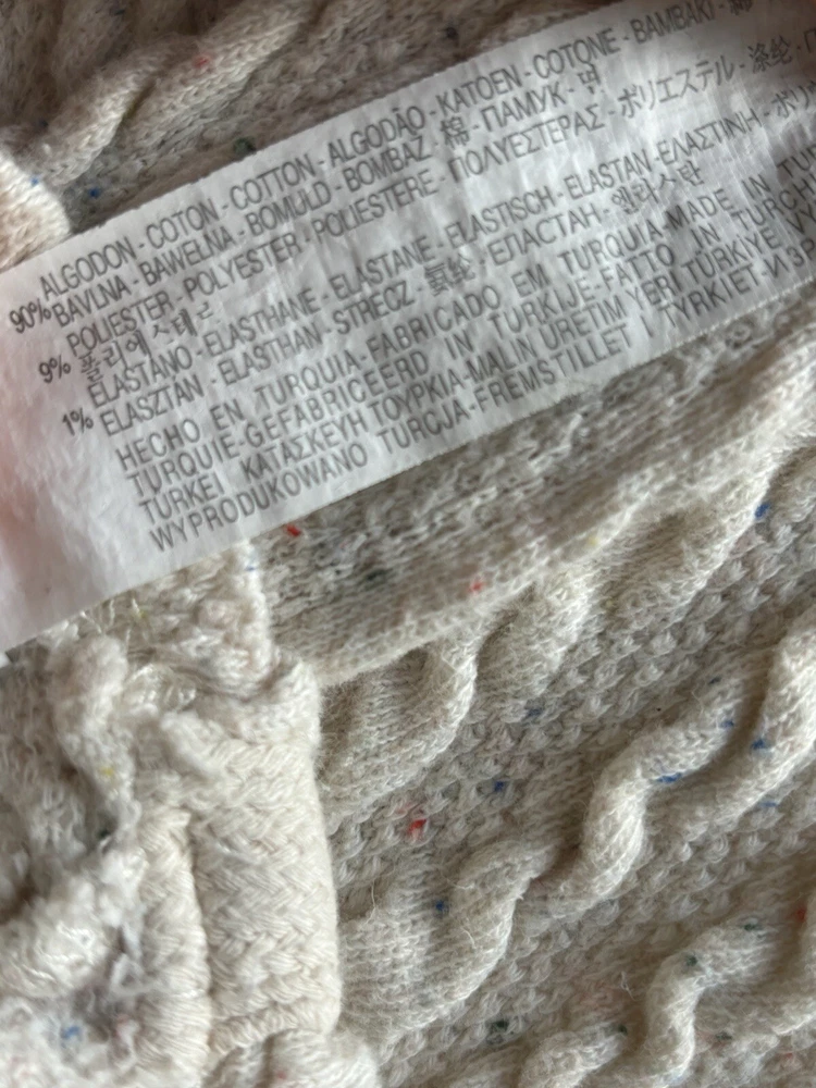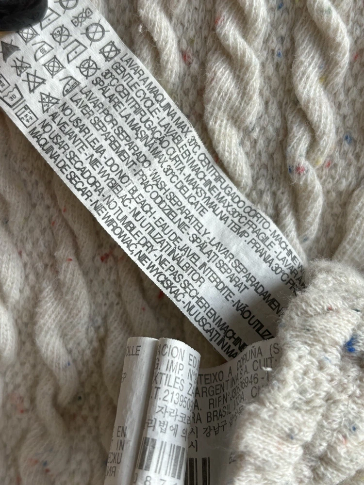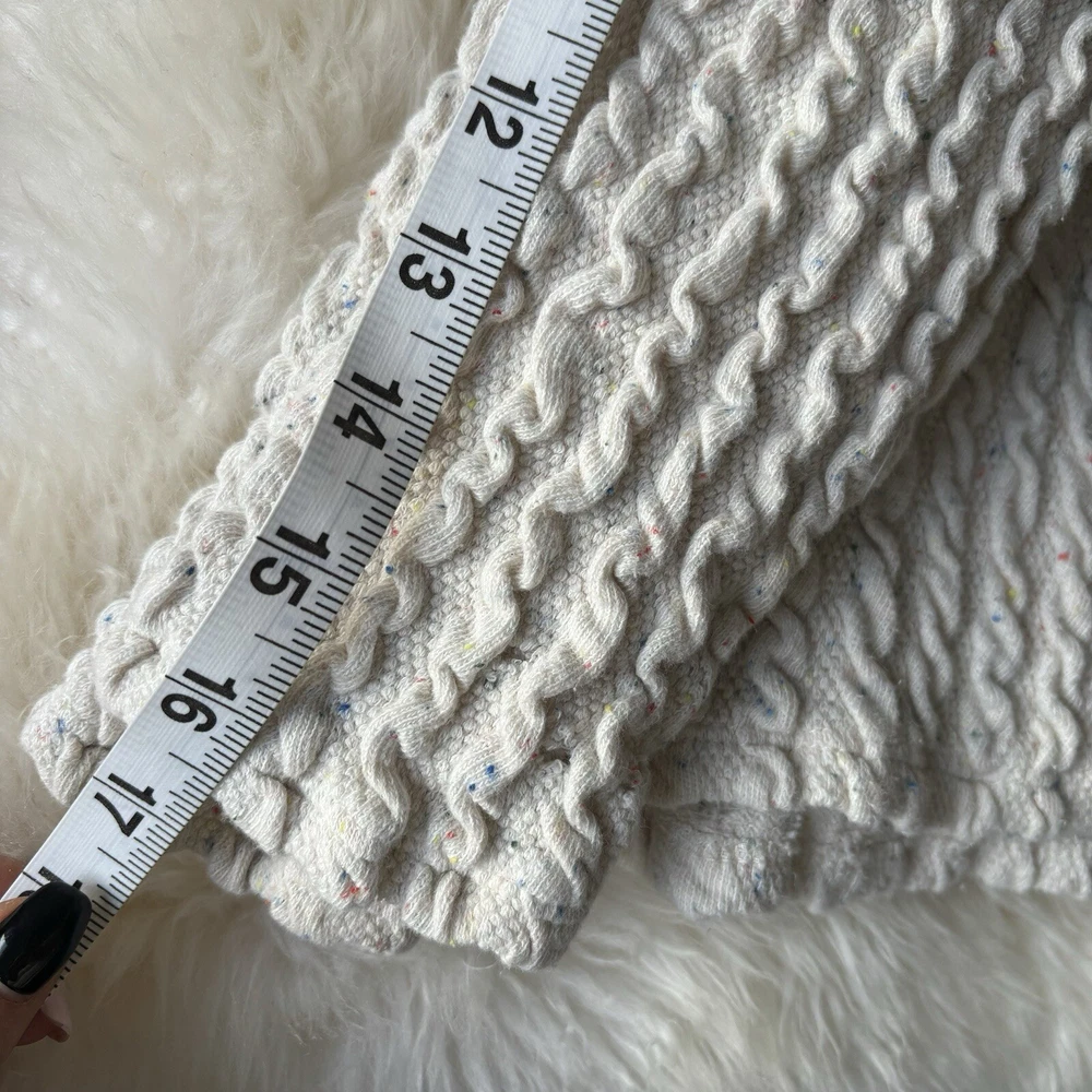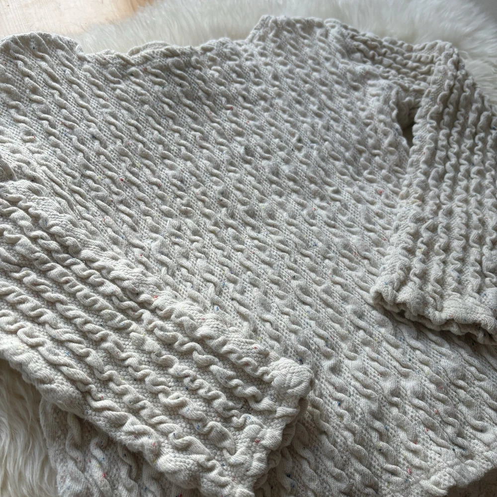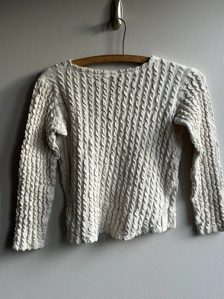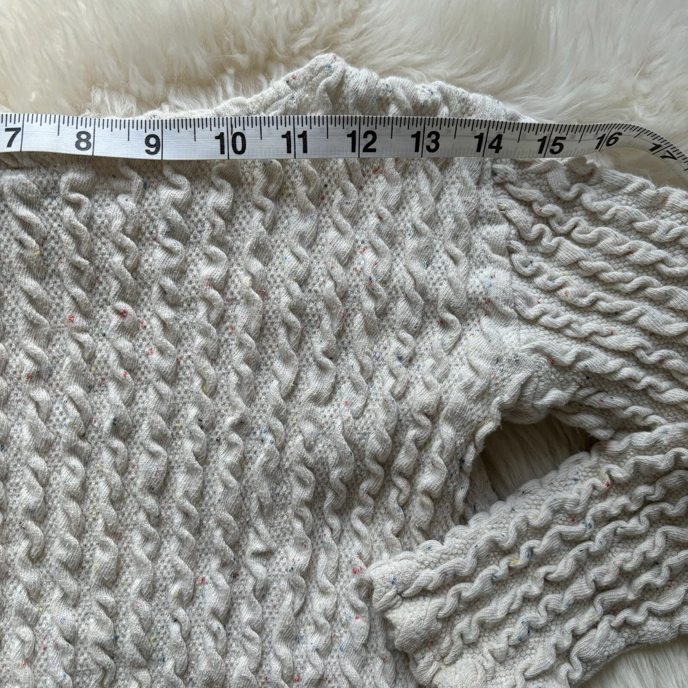 This ZARA Girls Cream Knit Boat Neck Sweater is a charming addition to any young girl's wardrobe. Featuring a cozy knit fabric with a playful cotton candy spotted flecks within pattern and delicate crochet style knitted accent. This long-sleeve pullover exudes a modern bohemian vibe. The nautical-inspired design, complete with a boat neck and fisherman details, makes it perfect for casual outings or travel adventures. Made from machine-washable 90% cotton 9% Polyester & 1% Elastic material, this vintage-inspired sweater in size 9-10 yrs is easy to care for and suitable for all seasons. Perfect for the hipster, Easter, school, or London-themed looks, this sweater is a versatile and stylish choice for any fashion-conscious girl. PLEASE NOTE: item is in good condition & has been washed