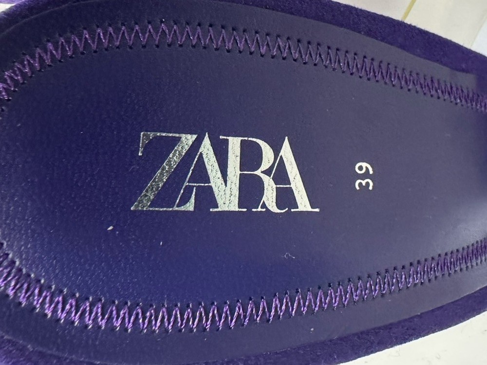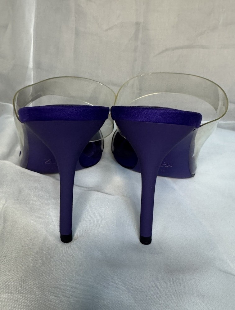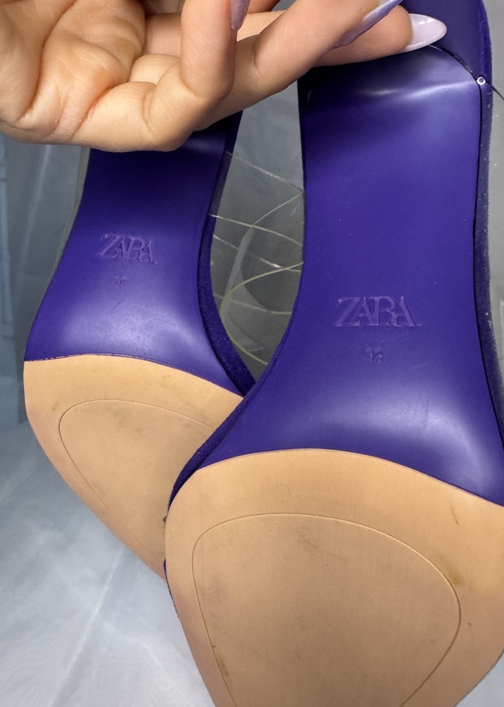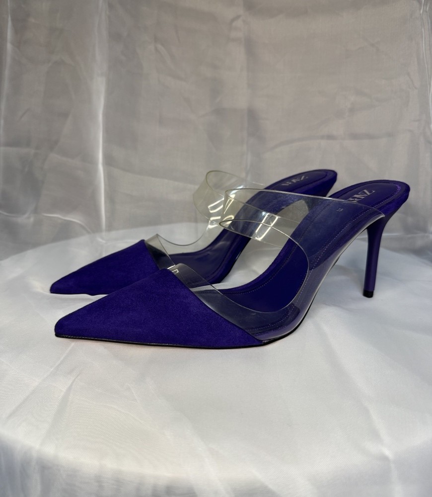 Item Specifics: Brand: ZARA Size: EU 39 (US 8.5) Colour: Purple Toe Shape: Pointed Heel Height: Stiletto Material: Faux suede upper with clear straps Style: Slip-on heels Occasion: Going out, party, special events, dinners Description: Stylish and modern, these ZARA pointed heels in a vibrant purple are a standout piece. Featuring transparent double straps and a soft microsuede finish, they’re chic without trying too hard. A great option for dressing up a look without going over the top — and super easy to pair with both neutrals and bold fits.