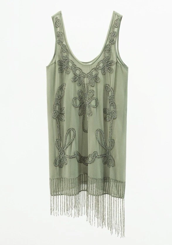 ZARA SS24 NWT Fringed Beaded Dress Sea Green $169 Size M