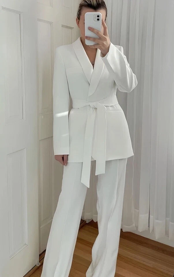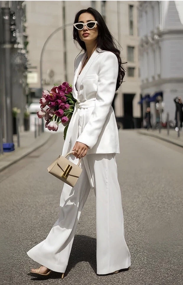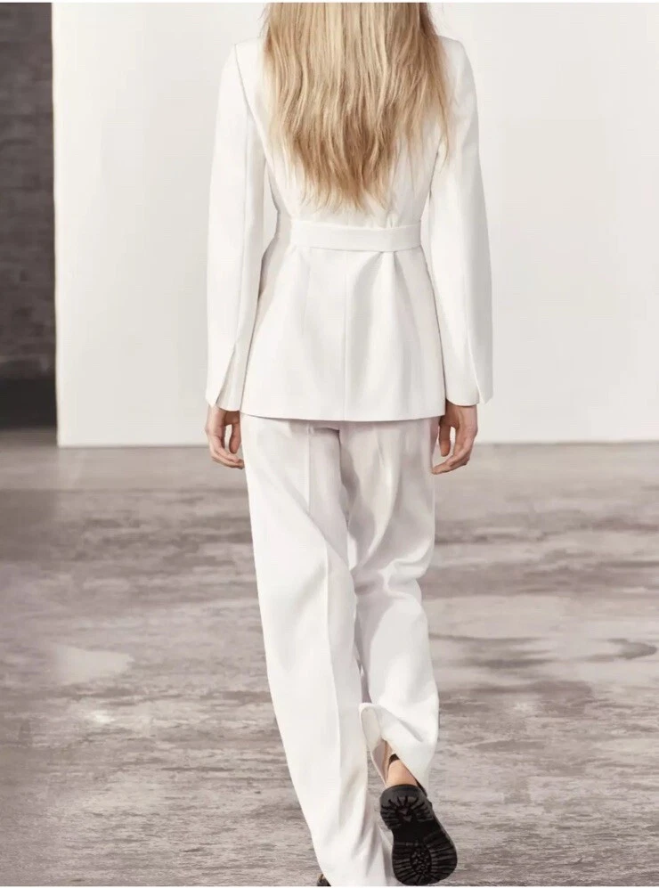 Elevate your wardrobe with this stunning 2-piece outfit from ZARA. The set includes a white shawl collar blazer jacket and trousers, both made from high-quality polyester material. The belted design adds a touch of sophistication to the overall look, making it perfect for any occasion – from workwear to business meetings, weddings, or even for travel or activewear. This outfit comes in a size M, and it is a regular fit for women. The jacketer features a collared neckline and is perfect for any season, whether it's autumn, winter, summer, or spring. The set also includes a range of features, such as the belted waistline and the comfortable trousers. Don't miss out on adding this stylish outfit to your collection!