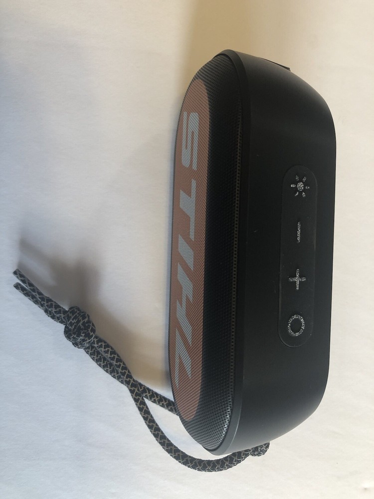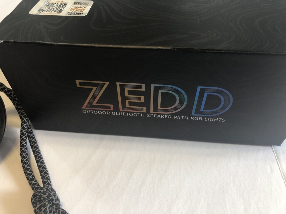 ZEDD Outdoor Bluetooth Speaker with RGB Lights. Has Orange STIHL logo on front of speaker. Has a carrying strap.