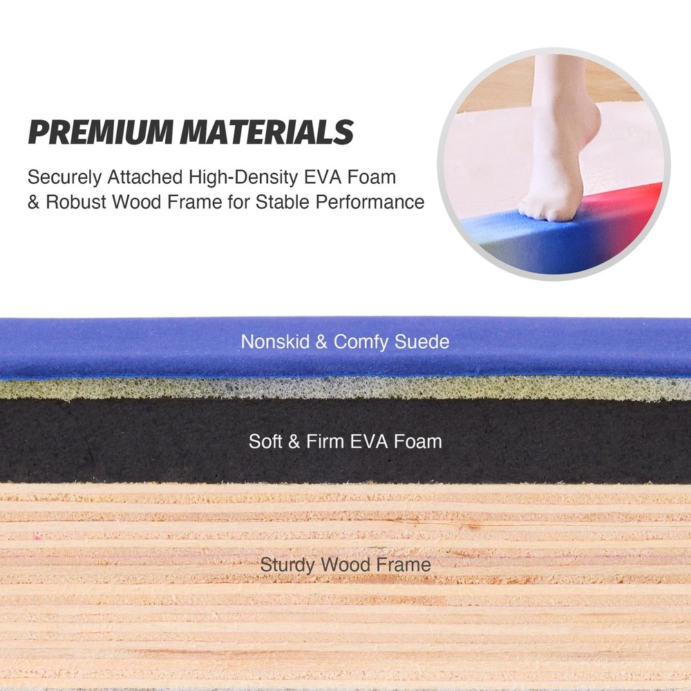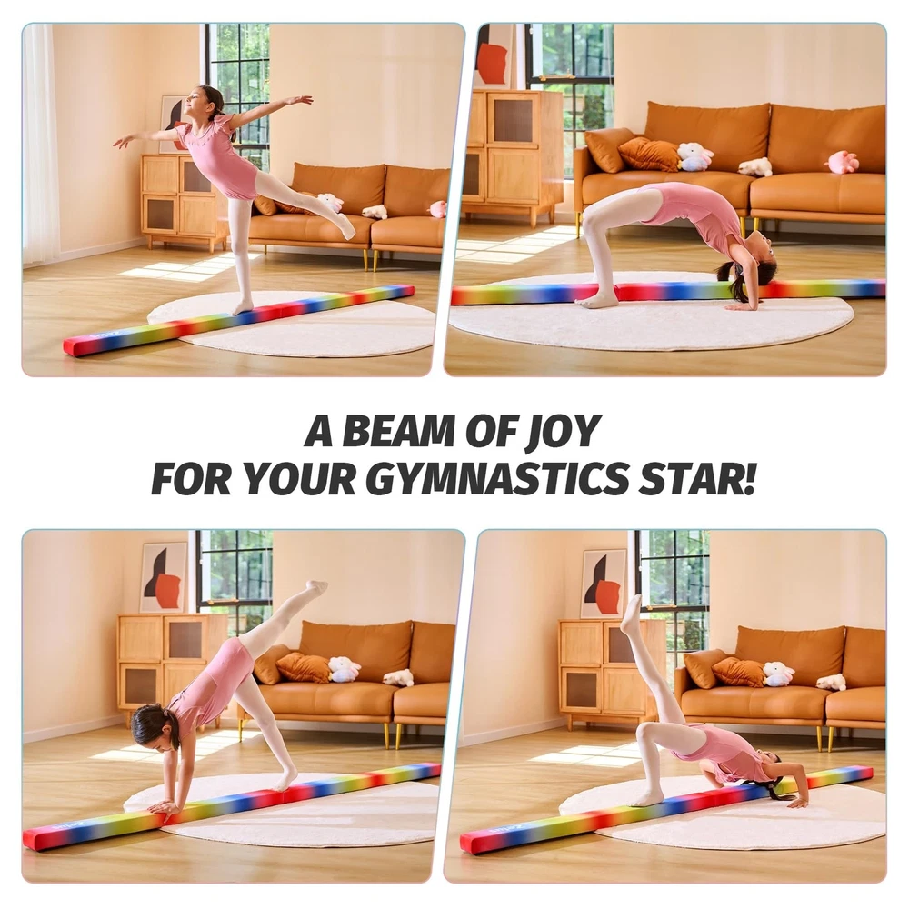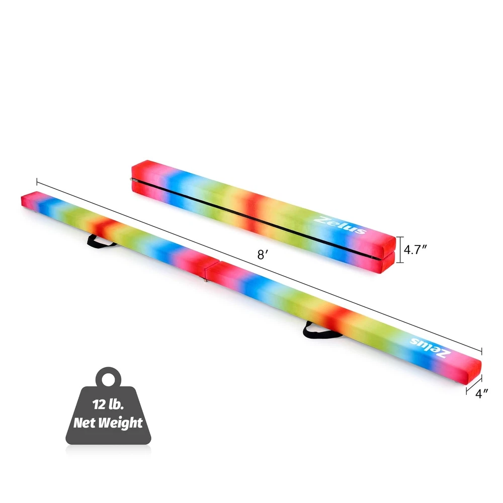 ZELUS 8' Folding Gymnastics Balance Beam, Floor Balance Beam w/Carry Handles Anti-Slip Base for Kids, Beginners & Professional Gymnasts Product Details Size: 8 ft Color: Rainbow Brand: ZELUS MPN: FGB-JX UPC: Does not apply EAN: Does not apply Item Package Dimensions L x W x H: 48 x 5 x 5 inches Package Weight: 6.15 Kilograms Item Weight: 5.5 Kilograms Brand Name: ZELUS Color: Rainbow Material: Suede, Wood, EVA Manufacturer: Z ZELUS Part Number: FGB-JX Size: 8 ft Date First Available: July 12, 2023 Ideal for Everyday Practice: Let your kids dive into a world of endless active fun with the Zelus 8 ft. floor balance beam and watch as they master handstands, cartwheels, and backflips Comfortable Care: Cushioned with soft EVA foam and topped by a gentle suede layer, our kids balance beam offers a cozy touch that'll keep your young gymnasts happily practicing away Safety at Its Core: Constructed from sturdy wood and equipped with nonslip rubber feet, this balance beam is designed to ensure your little ones' safety as they freely explore twists and turns Convenient Portability: From the backyard to the park or a friend's place, simply fold this gymnastics equipment in half and carry it effortlessly using the two convenient handles Lightweight Design: Weighing in at a mere 12.3 lb., this gymnastic beam is a breeze for your kids to handle. They can make it their own workout buddy, moving and adjusting it with ease