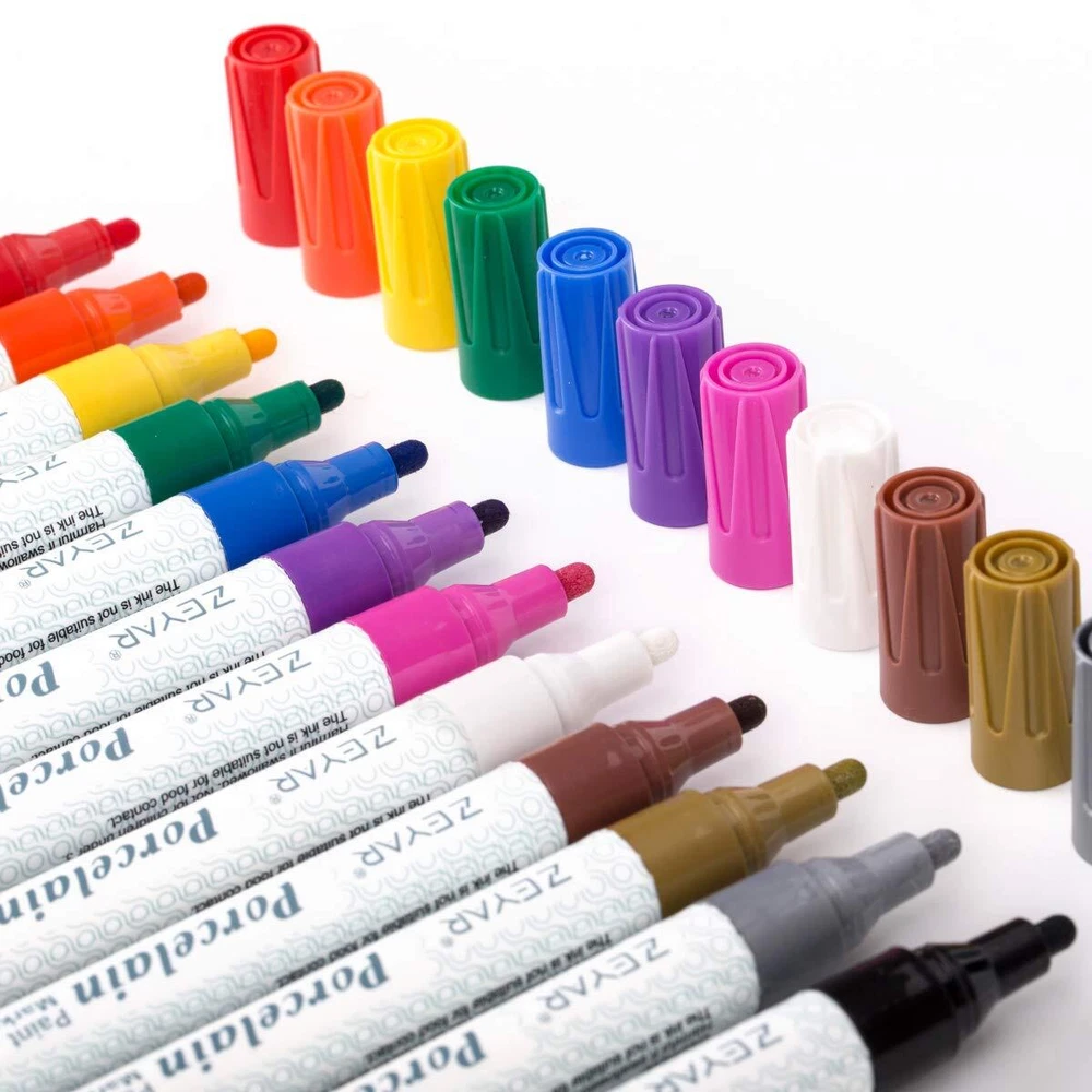 INSTRUCTIONS FOR USING ON PORCELAIN OR CERAMIC Clean the porcelain with water and soap, then let the porcelain dry; Try the marker on scratch paper first, and begin your project; After paint drying, bake the porcelain at 200°C-230°C for 20-30 minutes.; Take out your project and turn off power. Great job. ZEYAR is a professional art&crafts artwork manufacturer The world of science is full of many beautiful colors! Some of the colors in our world cannot be seen with just your eyes, but we are trying to give you more colors for your options. 12 colors: Made with special ceramic ink and Nylon fine tips, which can help create a colorful world, give you more options to improve your imagination. Excellent quality: Advanced valve-action structure inside the marker. Non-toxic, xylene free and safe to use. Conforms to ASTM D-4236 certificate. Nearly any surface for drawing: Fit for ceramic painting perfectly. Also suitable for any other surface: rocks, canvas, paper, wood, metal, glass, plastic, leather and so on. No Fuss, No Mess & No Worries. Great gifts for friends Perfect DIY on Mug or Porcelain for Permanent Collection after baking. Thoughtful Gifts for your friends and relatives. USA Brand ZEYAR. Valve Mechanism: SHAKE WELL BEFORE EVERY USE; Great control of ink and gas, high-technology Multi-Colors: 12 vibrant colors: Black, White, Brown, Red, Orange, Yellow, Green, Blue, Violet, Pink, Gold, Silver Ink made in Italy: Water and Fade resistant, Opaque ink, the bright color is durable in high temperature, Artwork permanent saving after oven baking Smooth Writing: Writes on nearly any surface with your imagination and creation. Expert on ceramic, porcelain & china. It’s also suitable for wood, rubber, glass, metal, stone, plastic and so on. Ink Certificated: Conforms to ASTM D-4236 certificate, non-toxic and acid free. But don't swallow it and No food contact WE CARE ABOUT ALL CUSTOMERS: Here at ZEYAR, we are professional markers manufacturer with sophisticated R&D, Quality control processes to ensure all our products maintain great quality. For us, drawing is an expression of the human feelings and experience. That’s why we work to make Our markers supplies accessible to all people.