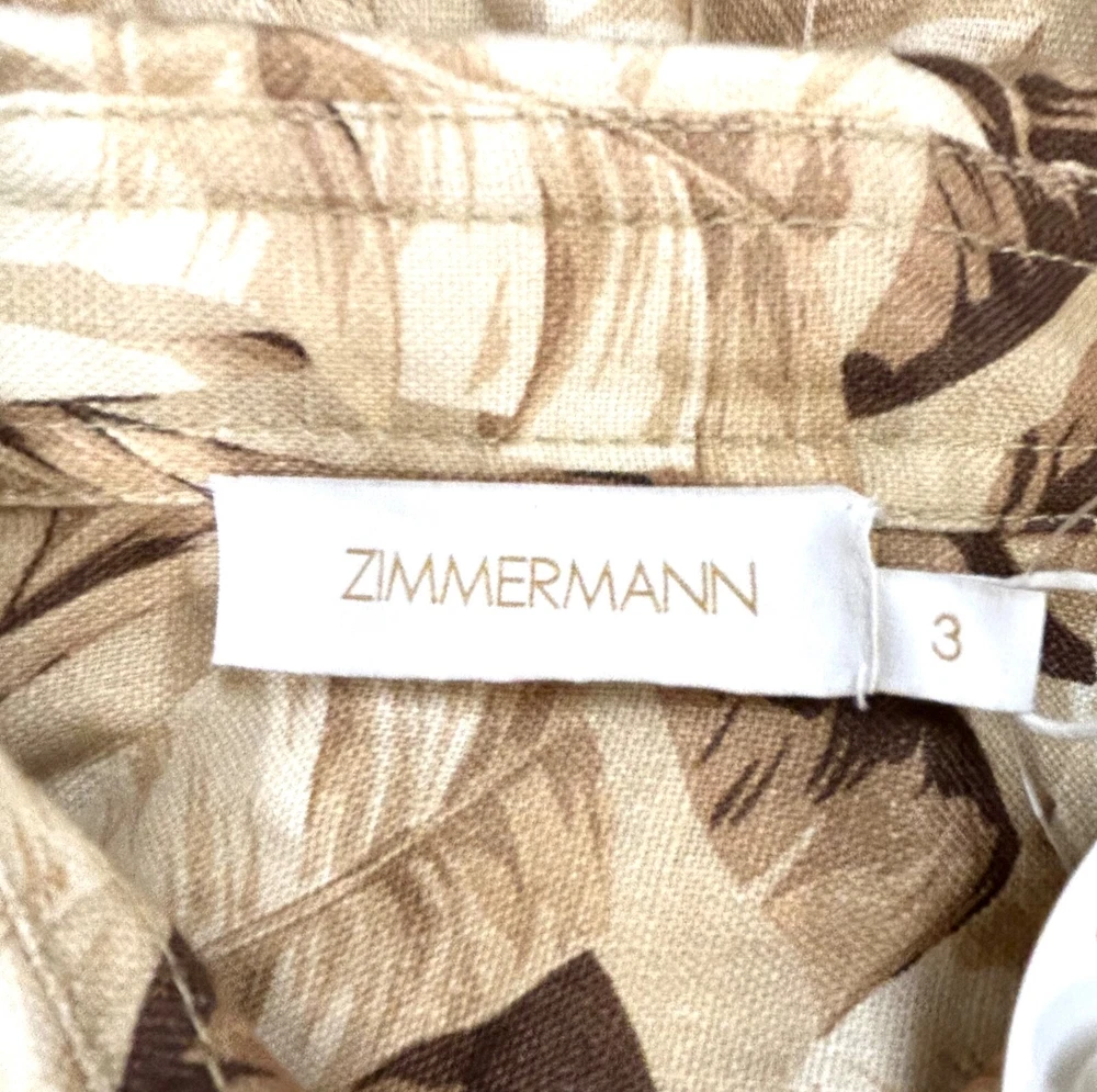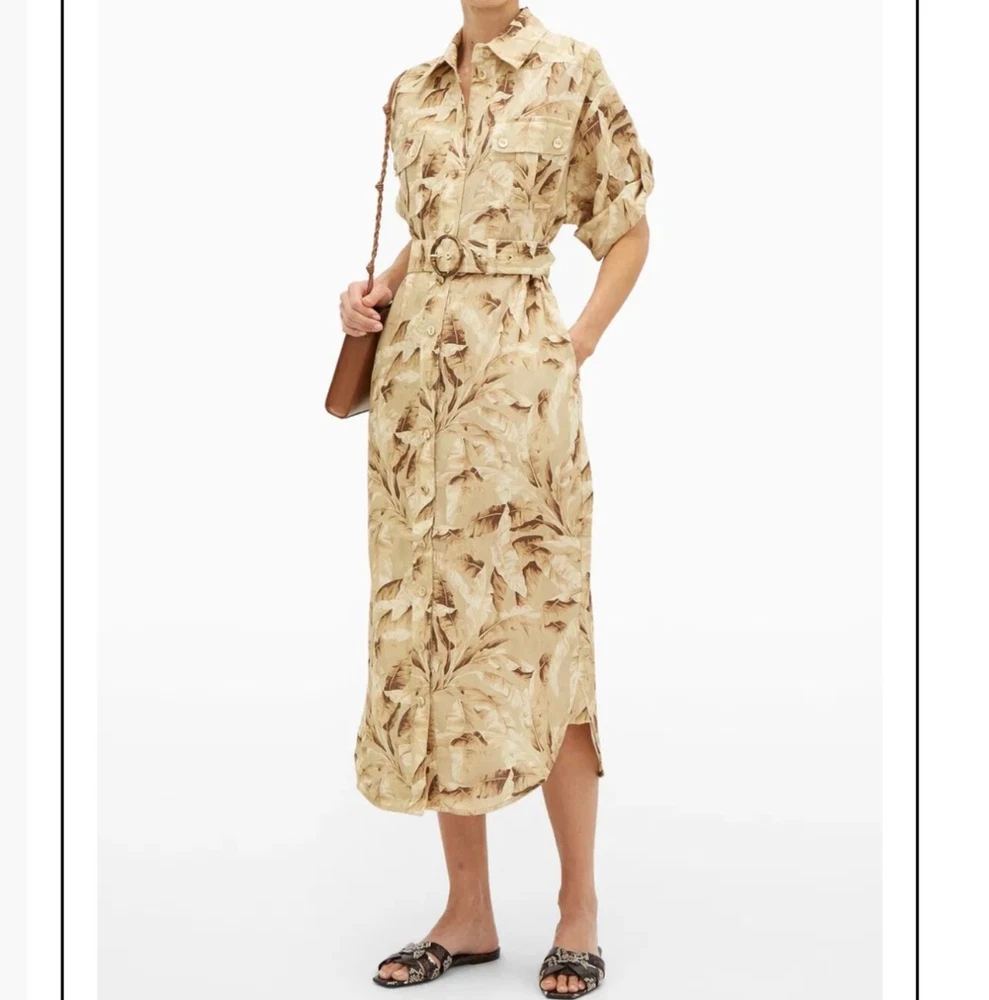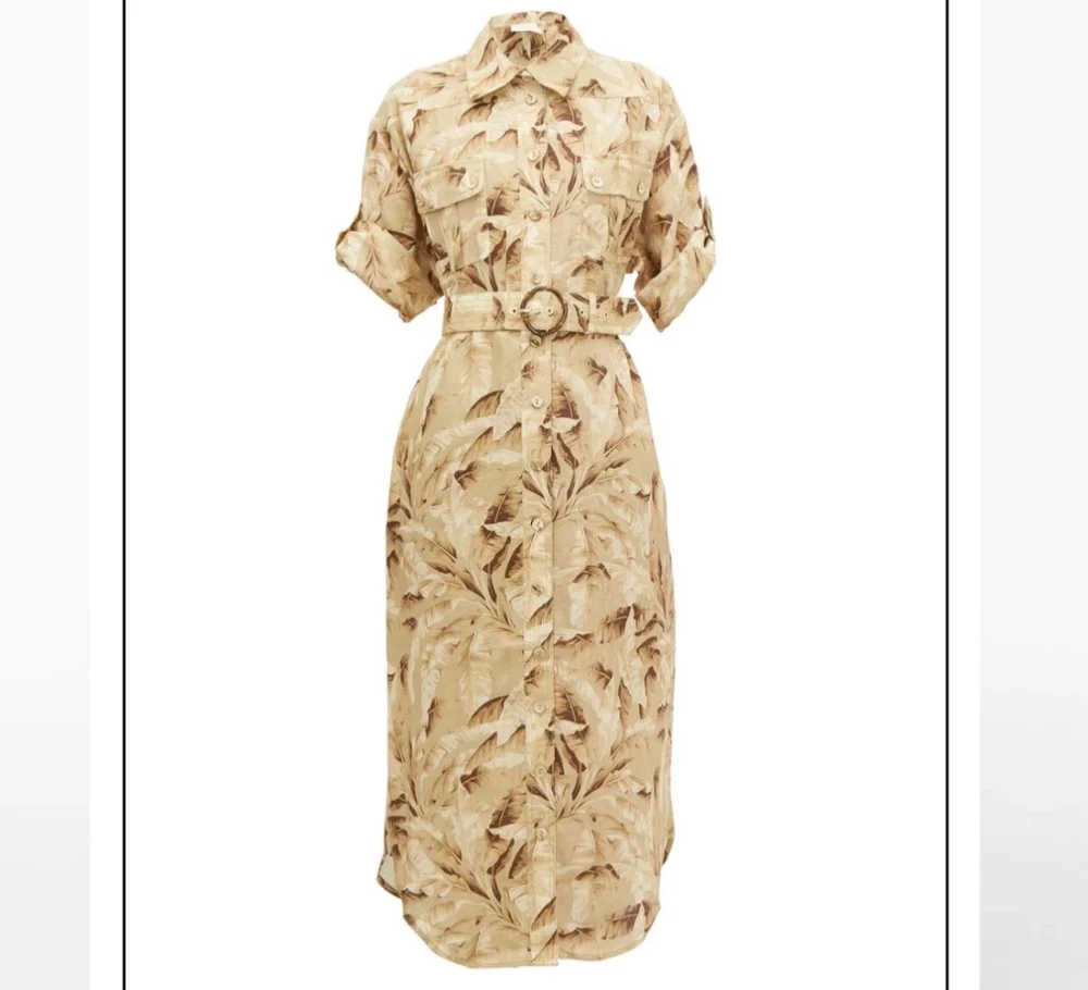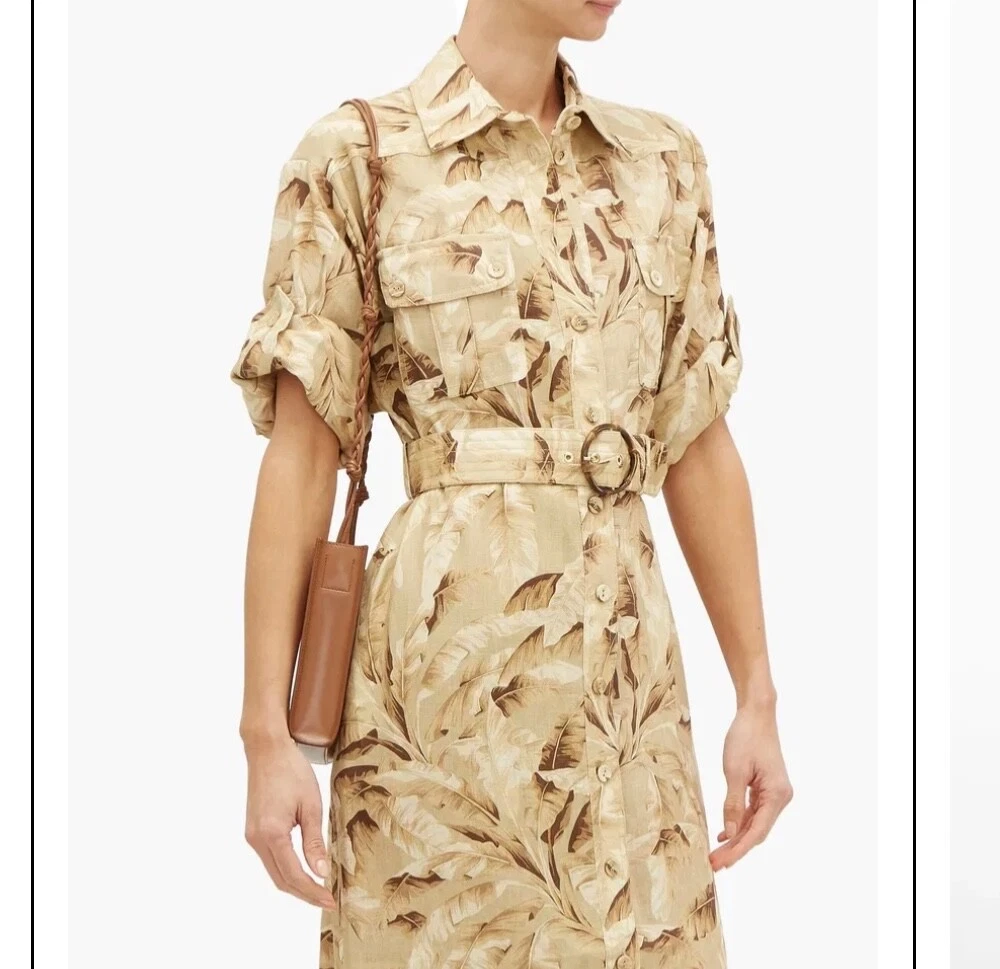 ZIMMERMANN SUPER EIGHT PALM TREE PRINT LINEN BELTED SAFARI SHIRT DRESS IN NEUTRALS Size 3 (AU/UK 14, US 10) Pls refer to brand website for more specific info re sizing Brand new with tags Safari style shirt dress Printed 100% Linen Pleated back Short sleeves with Buttoned tabs Detachable belt with bamboo circle buckle detail Folded cuffs Two side slit pockets Breast pockets Button fastenings through front Curved hem Non-stretchy fabric Mid-weight fabric Delicate dry clean 100% Linen ***pls note this is a brand new dress and condition is as such - however there is a tiny mark on the back of belt, if you refer to last pic & zoom in you might be able to see it, however due to the nature of the busy print its really not noticeable but wanted to disclose*** If you have any questions or require more details, photos ect pls don’t hesitate to msg me Pls check out my other listings - am open to reasonable offers (no low balls pls) and happy to combine postage #designer #australian #alemais shona joy alice mccall acler aje spell tropical safari African Safari Holiday